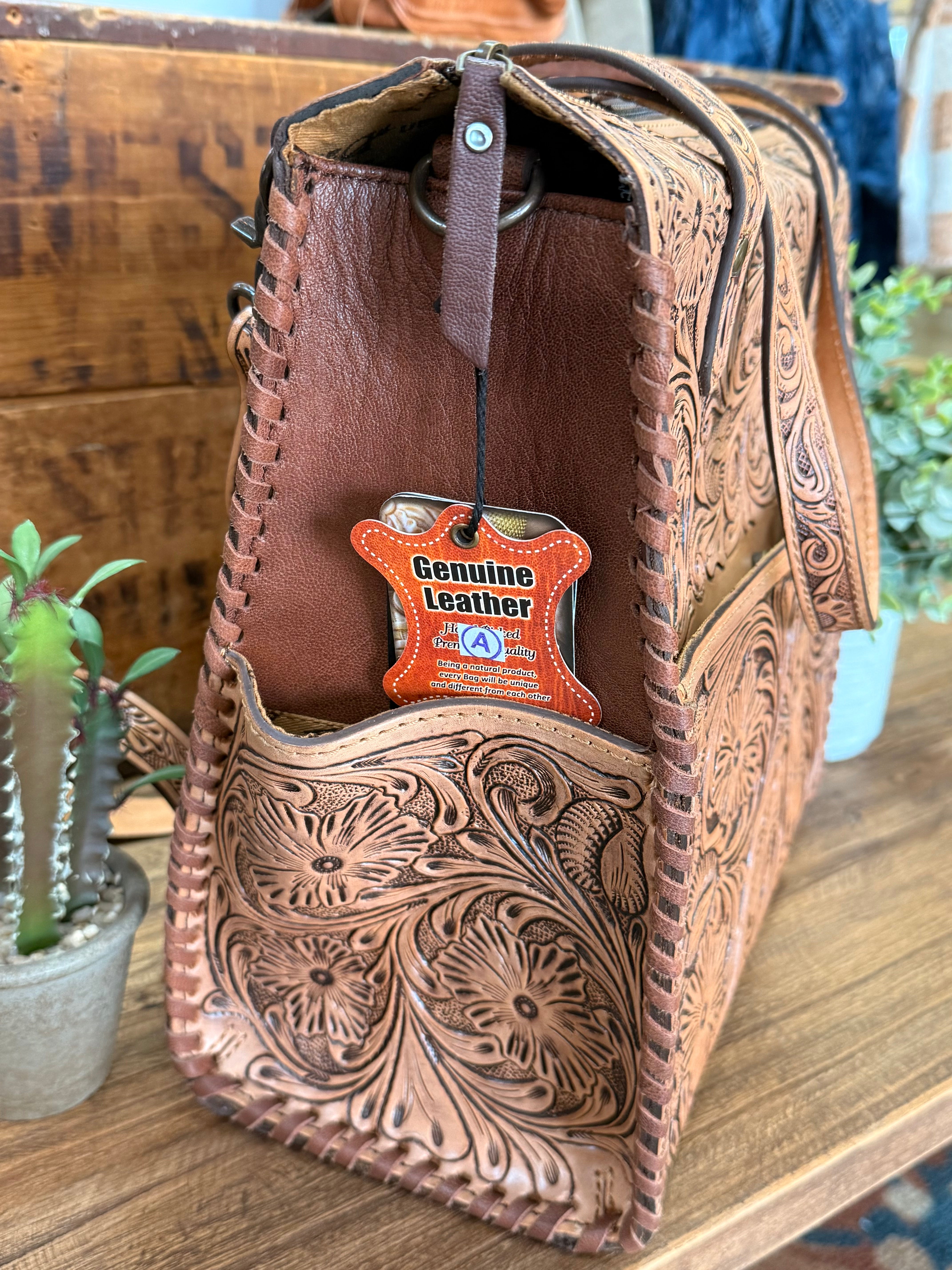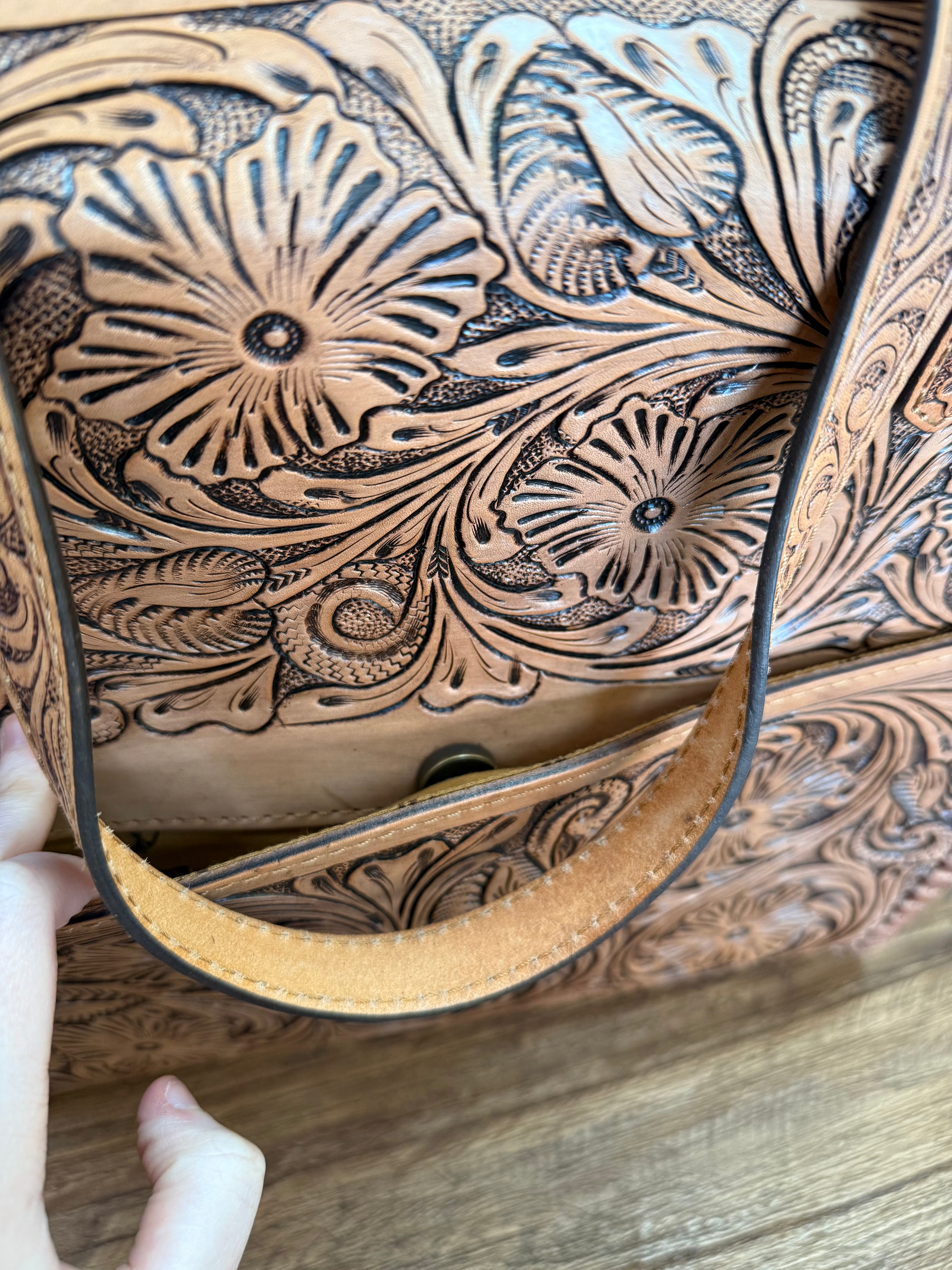 - Genuine full-grain hand-tooled leather with floral carving