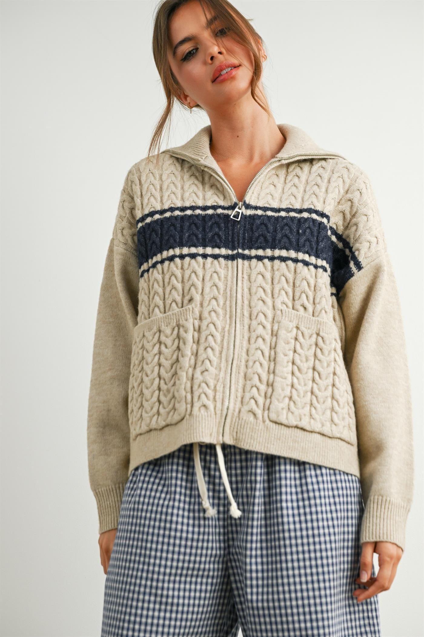 Combining comfort and style, this zip-front collared striped knit long sleeve top features a sleek zip neckline, classic collar, and a timeless stripe pattern. The soft knit fabric offers a cozy yet polished look, making it perfect for everyday wear or casual layering. SELF: 42%ACRYLIC 28%POLYAMIDE 30%POLYESTER