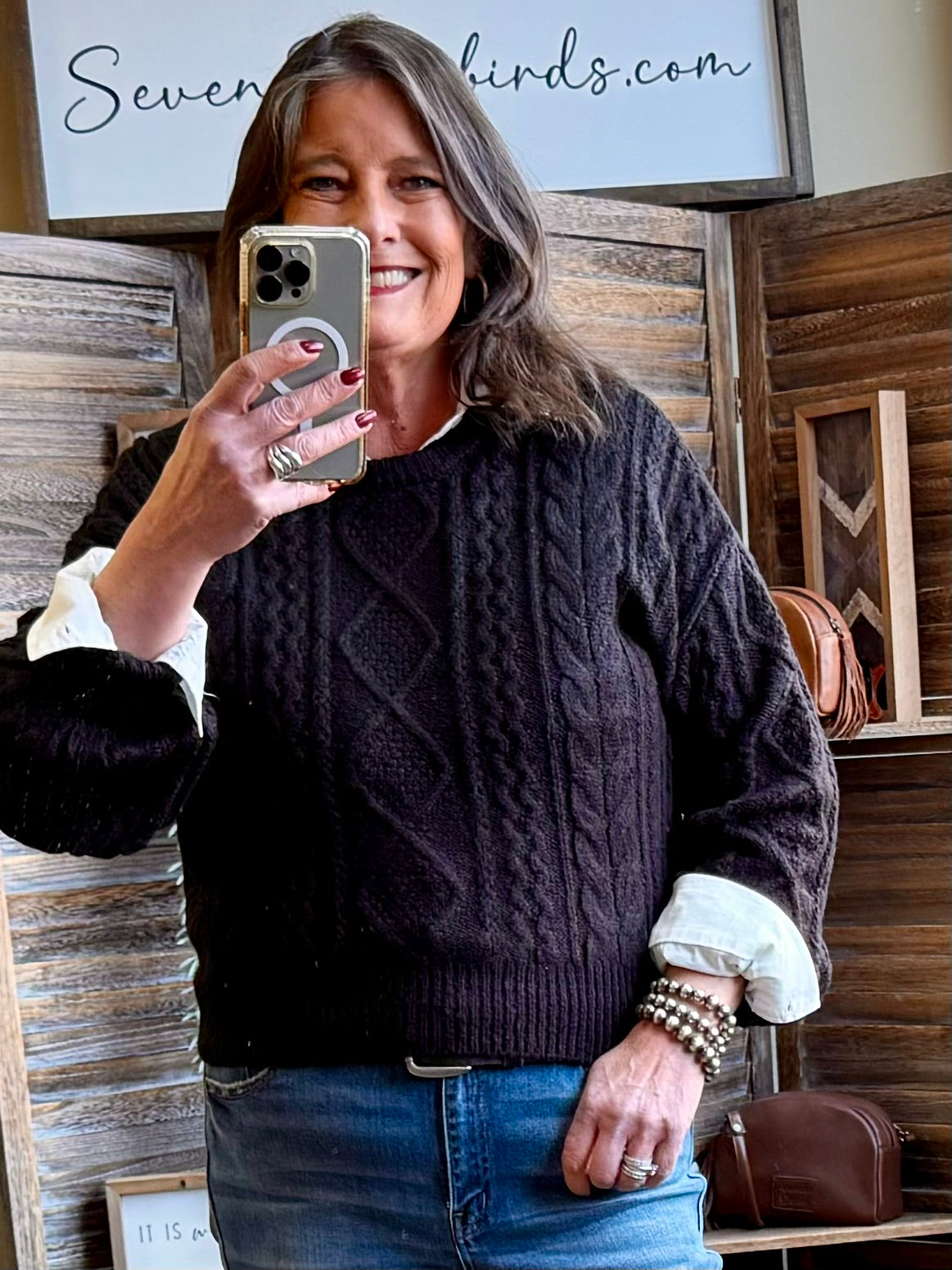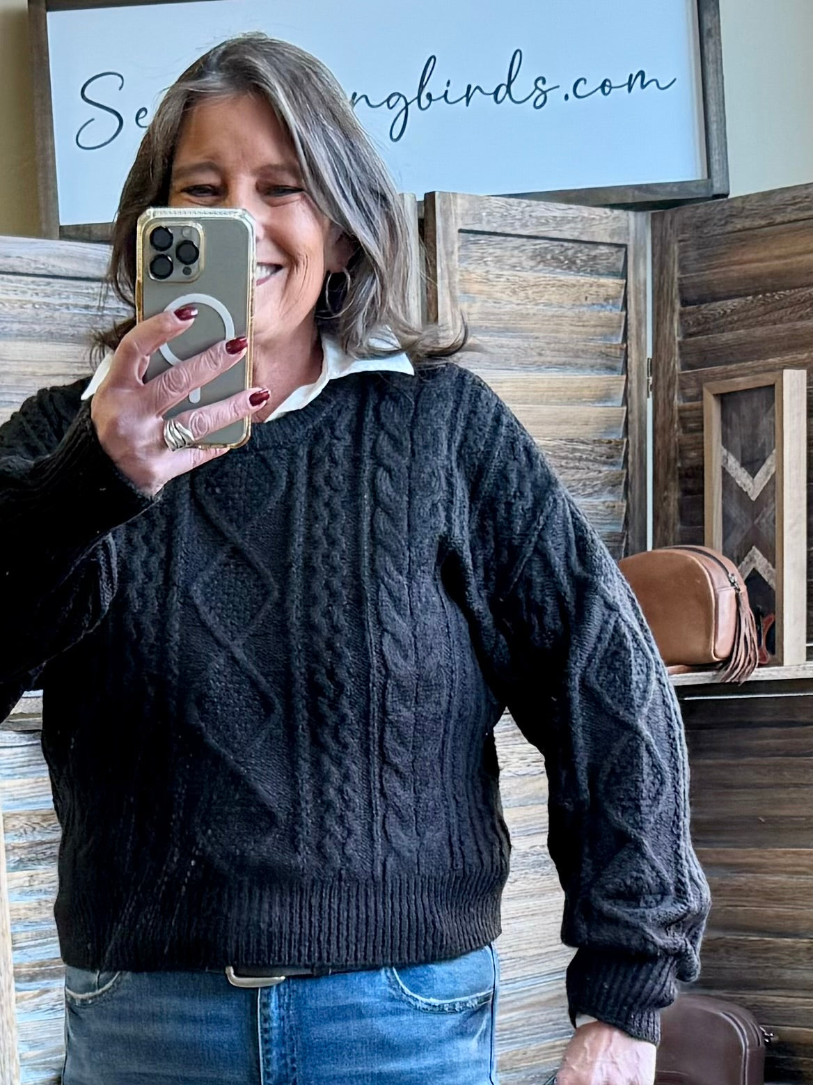 Lighter weight crew neck sweater. Shorter length - great with high waisted jeans.