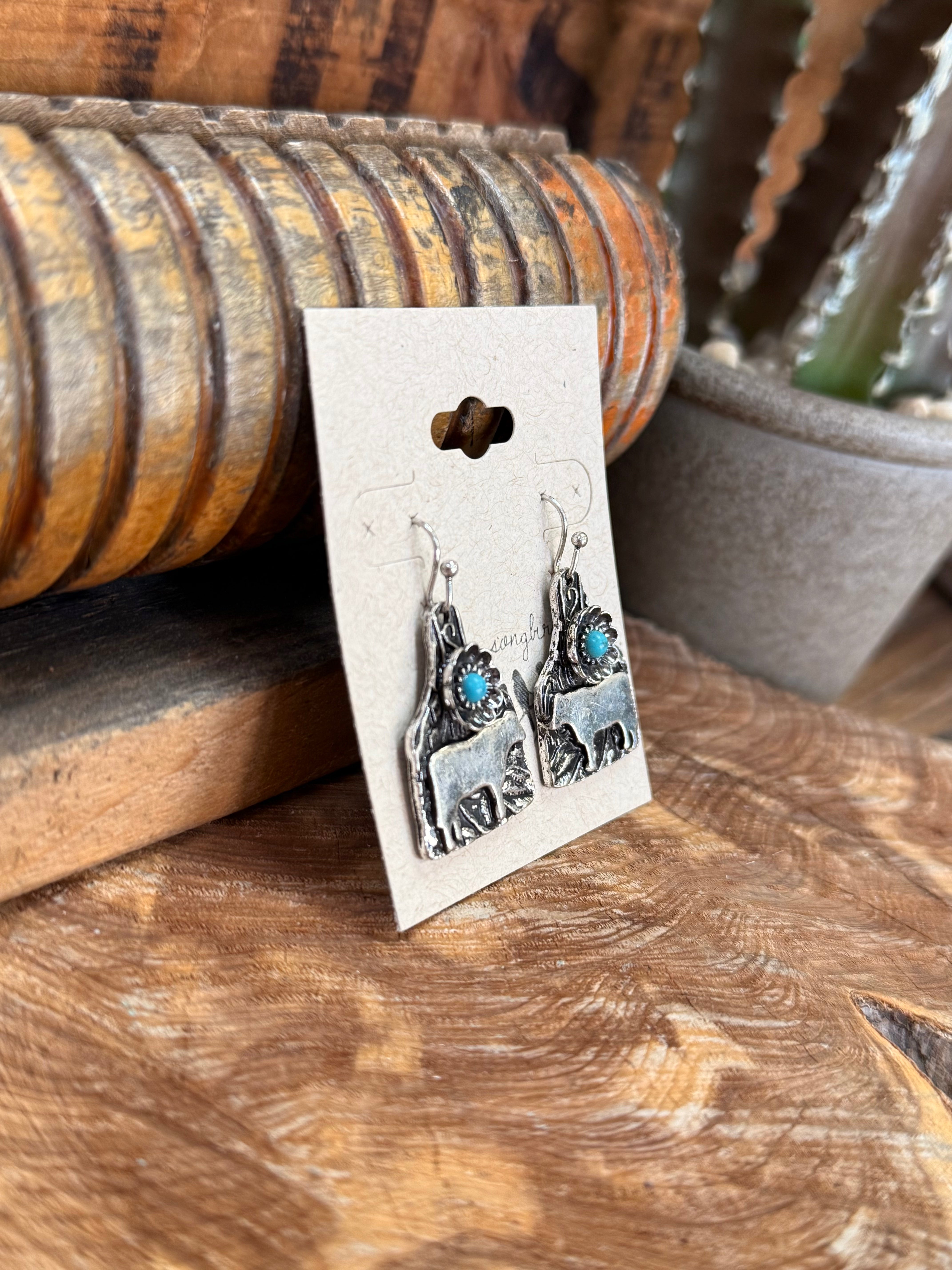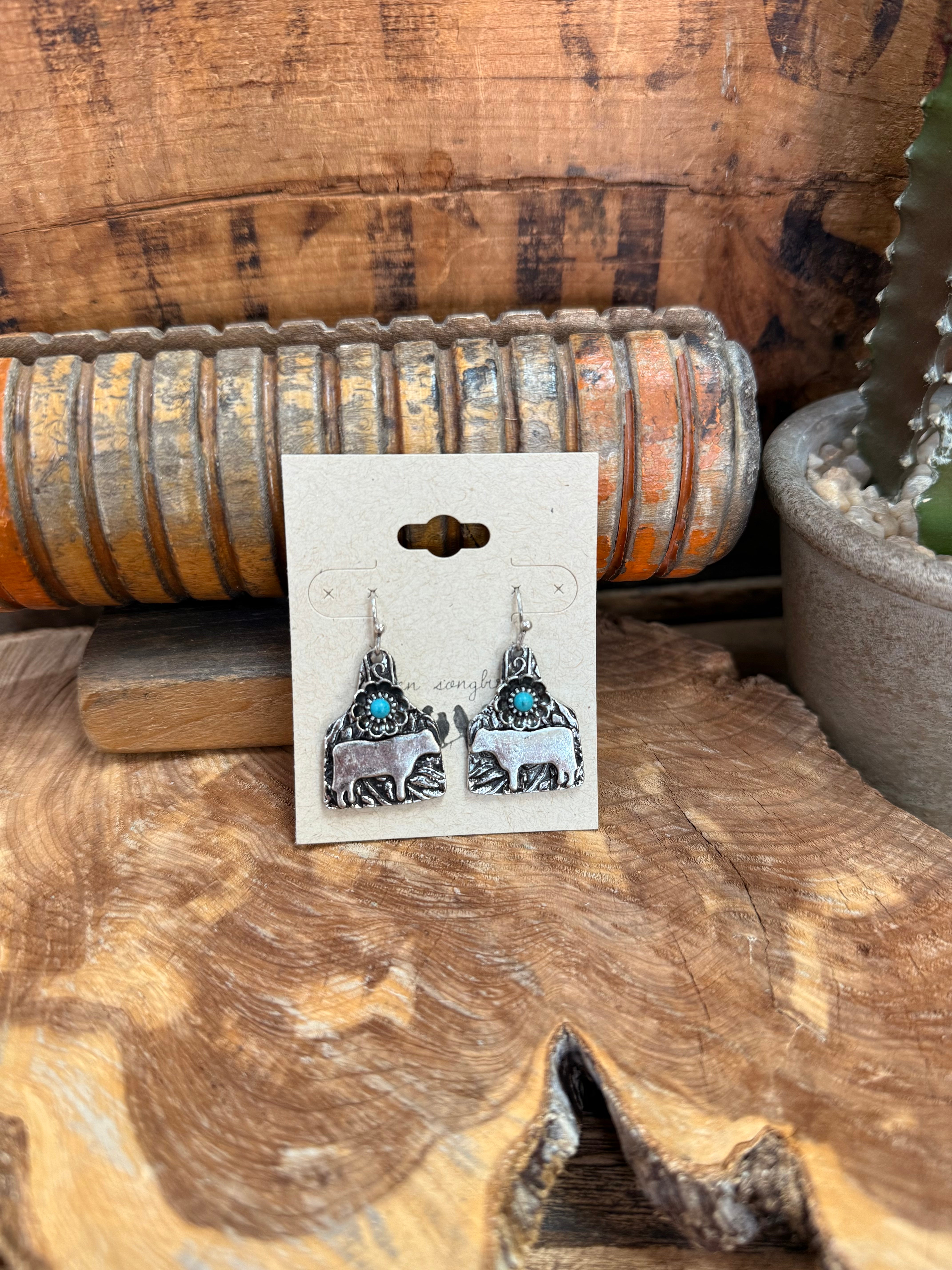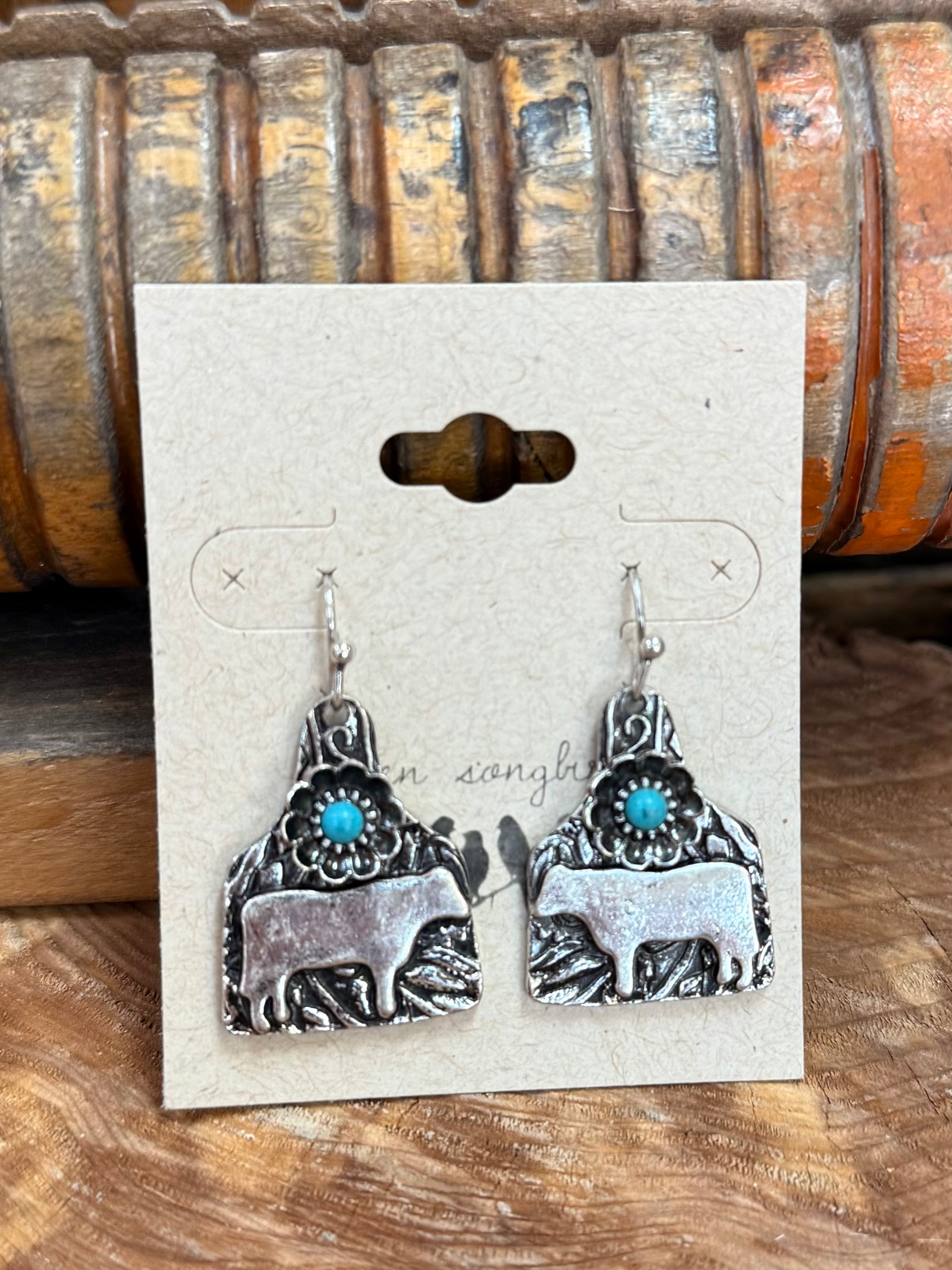 Silver & Turquoise Engrave Cow Tag Floral Fishhook Earrings