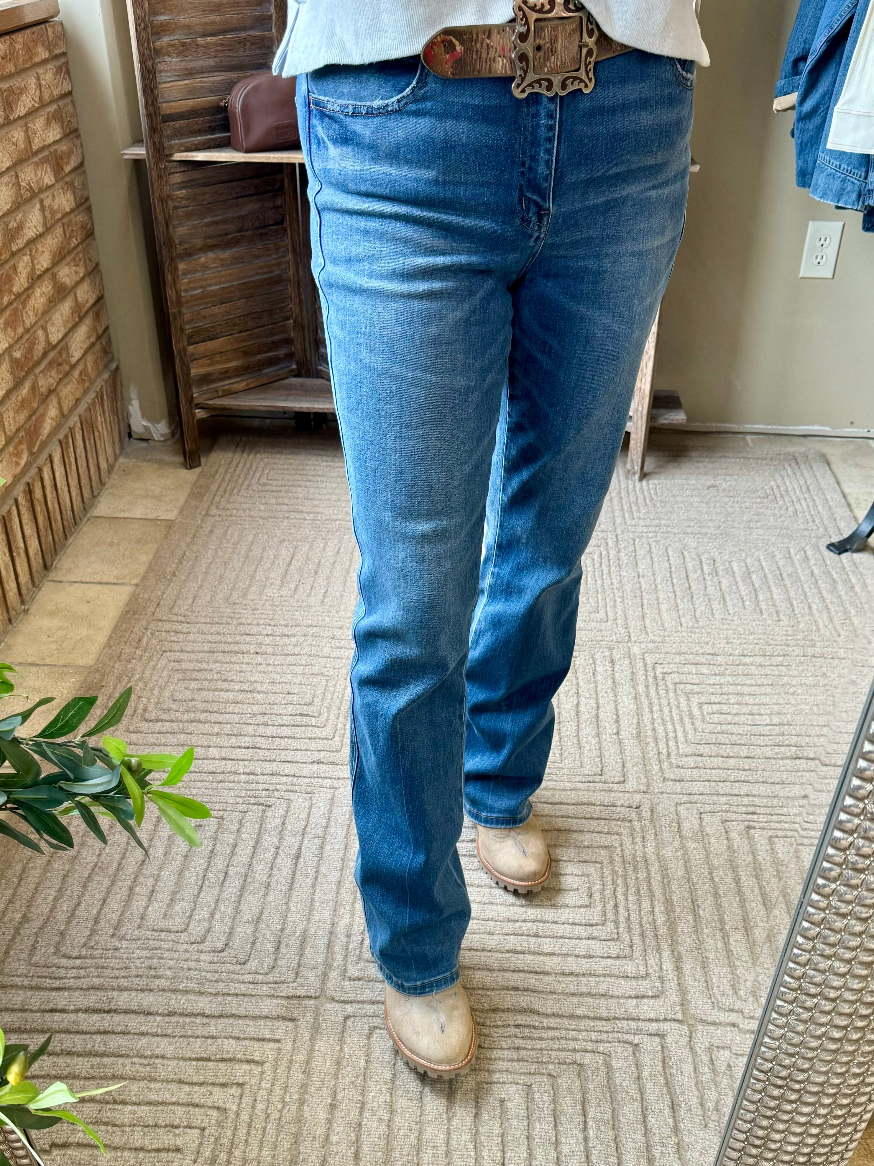HIGH RISE FULL LENGTH BOOTCUT JEANS COMFORT STRETCH DENIM, HIGH RISE WAIST, FINISHED HEM, FULL LENGTH, BOOTCUT JEANS F. RISE: 10" / INSEAM: 33" / LEG OPENING: 18"