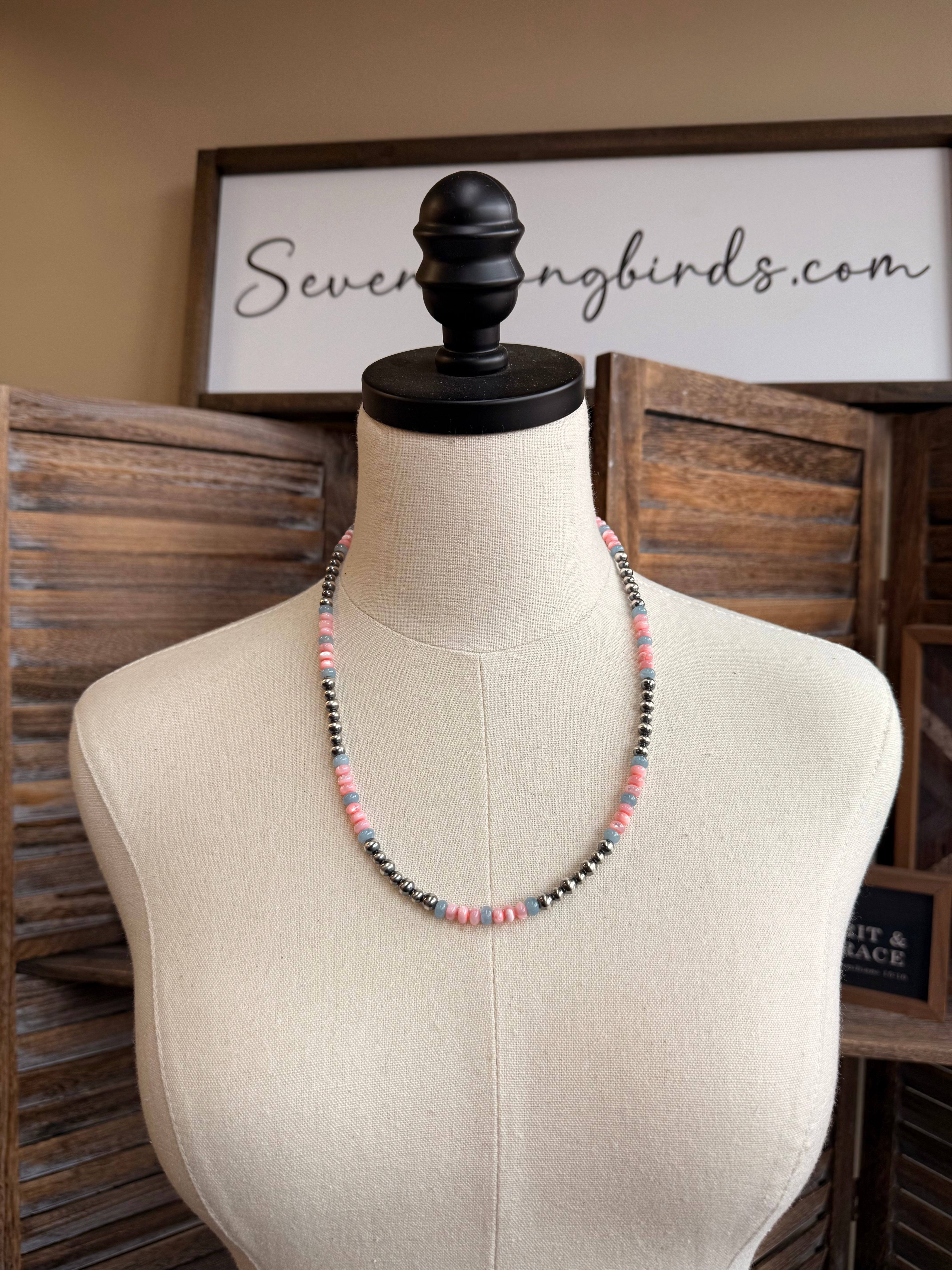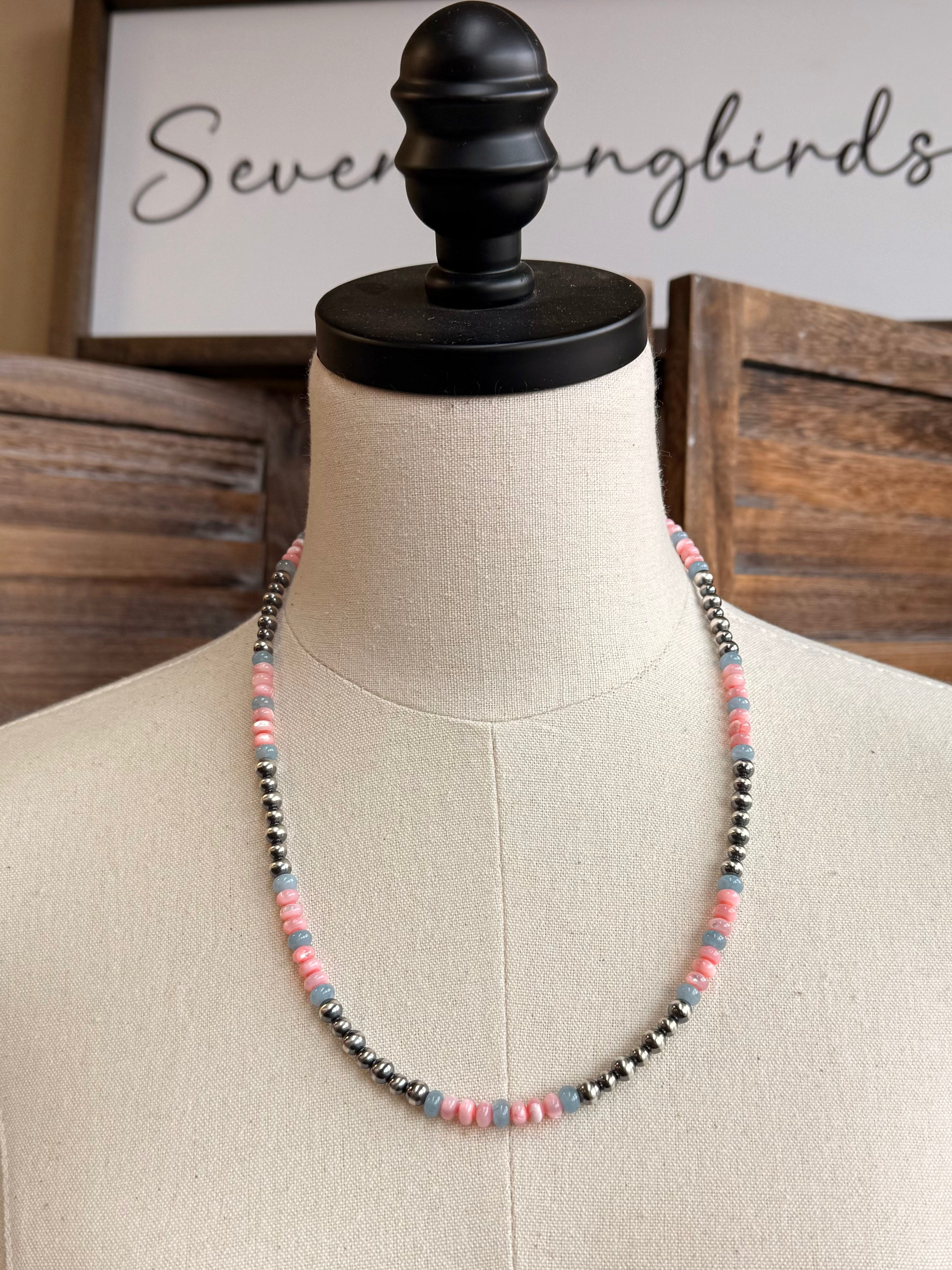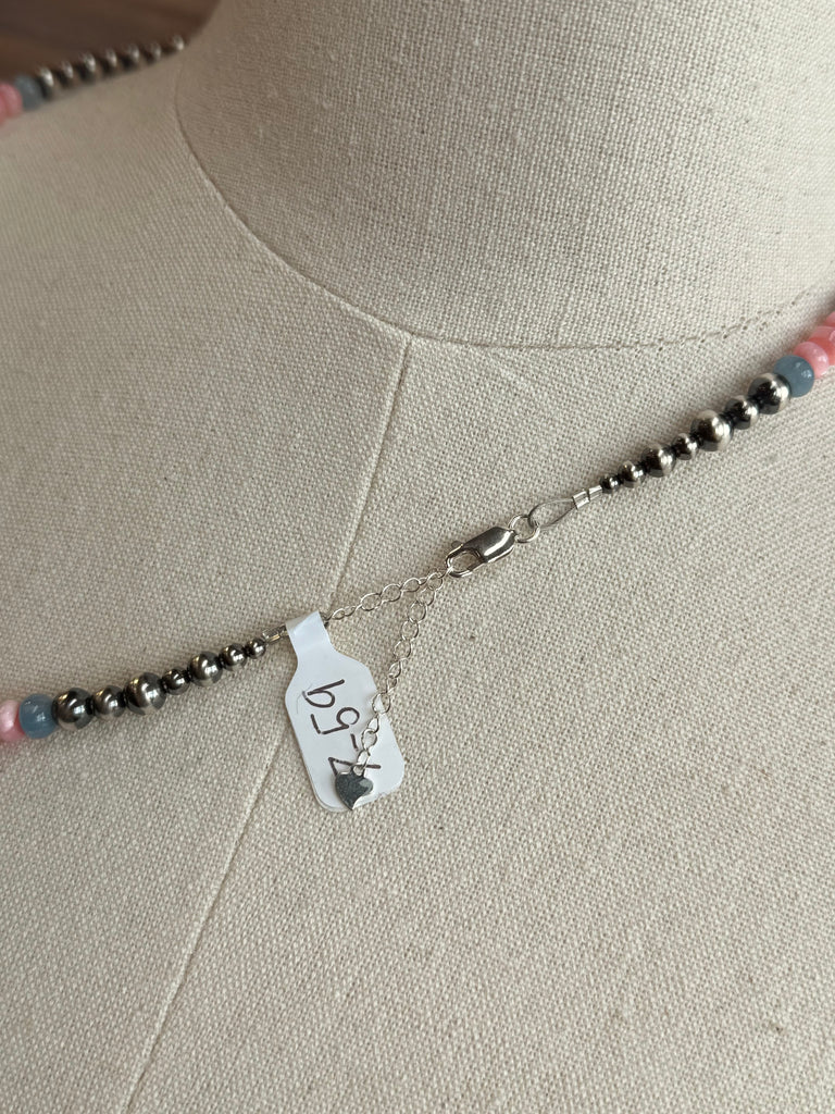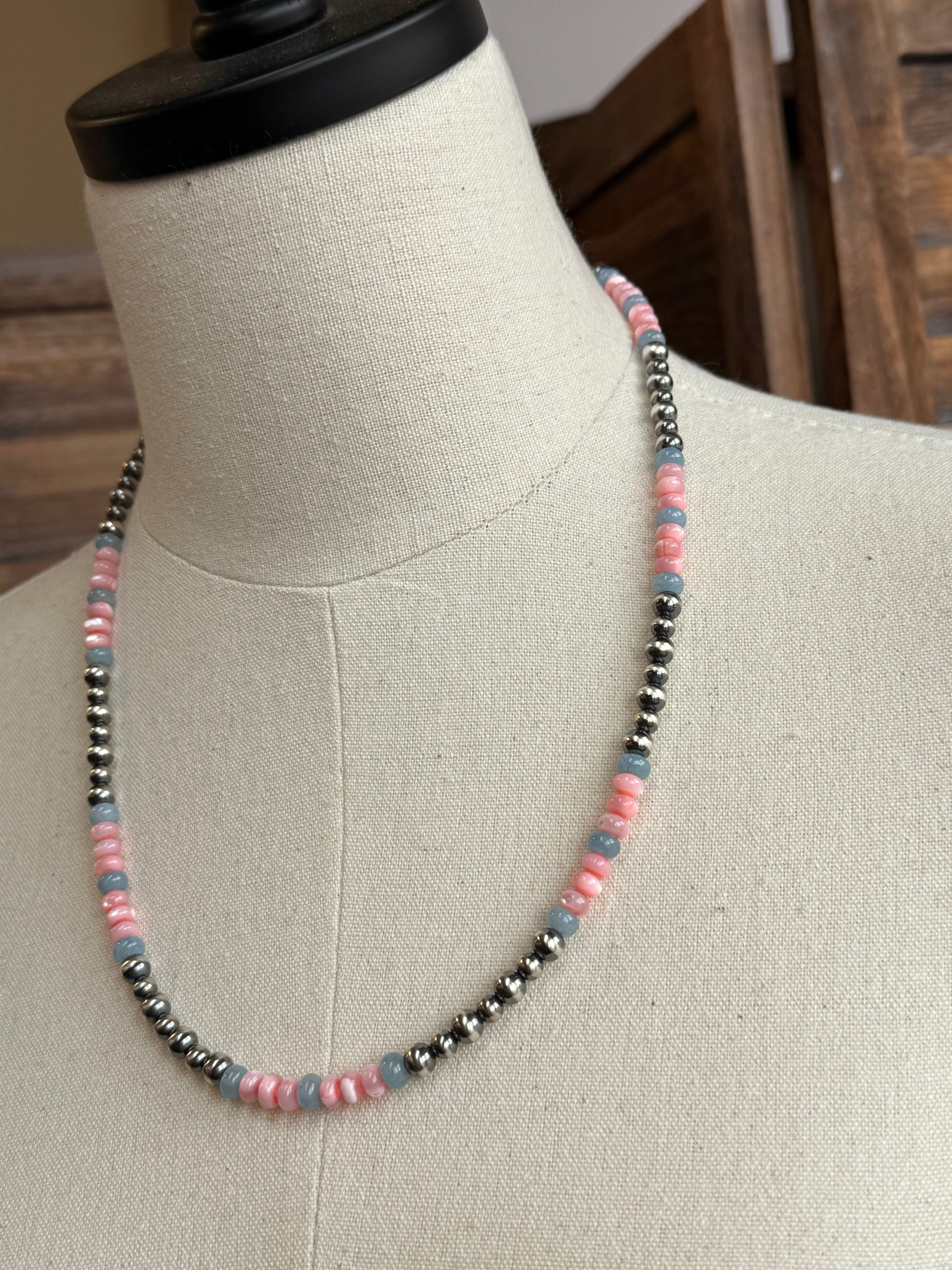 21" Blue Jade and Pink MOP Sterling Silver Necklace