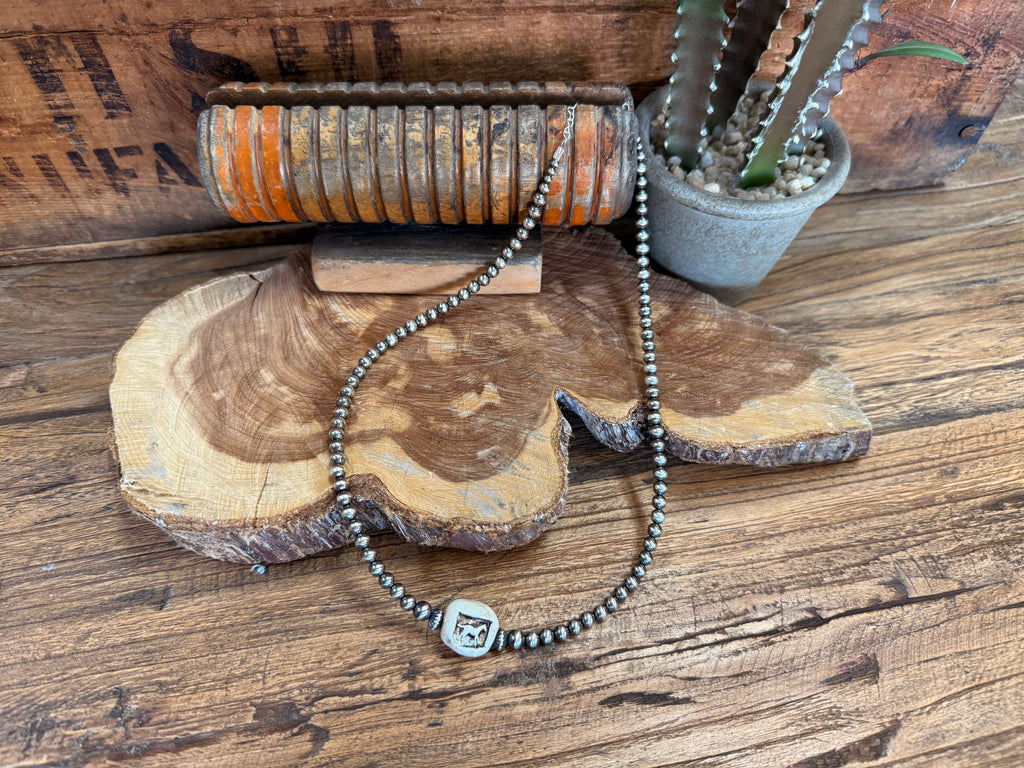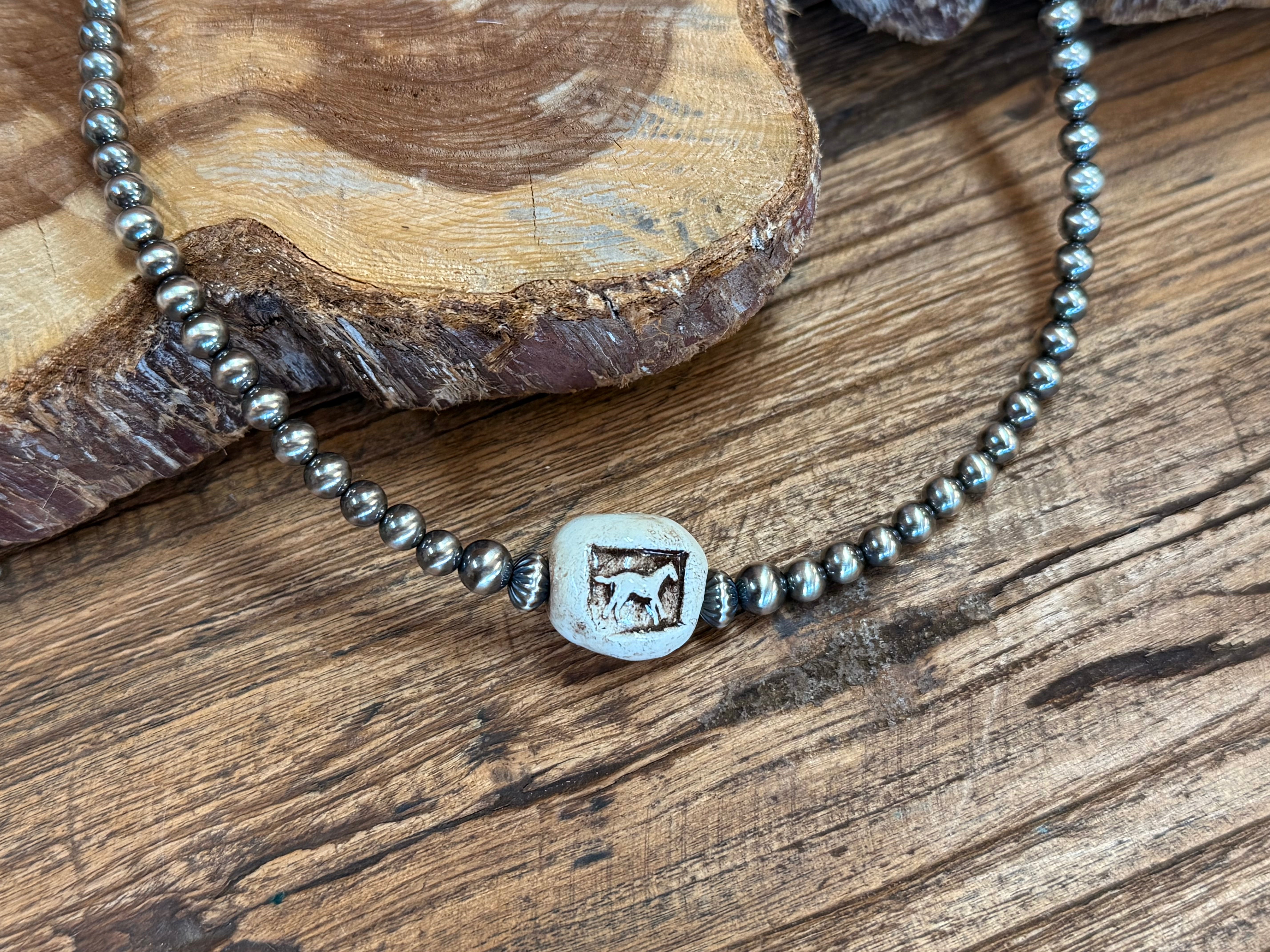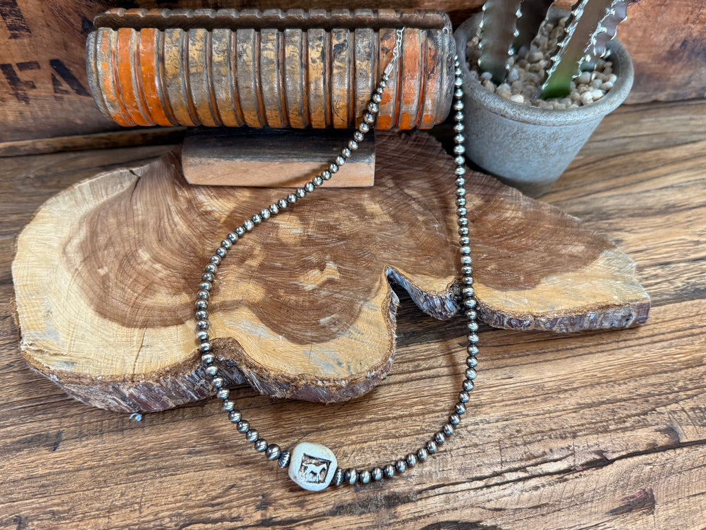 Super fun 5mm Sterling Silver necklace with a ceramic horse in the center. One-of-a-kind hand strung by us.