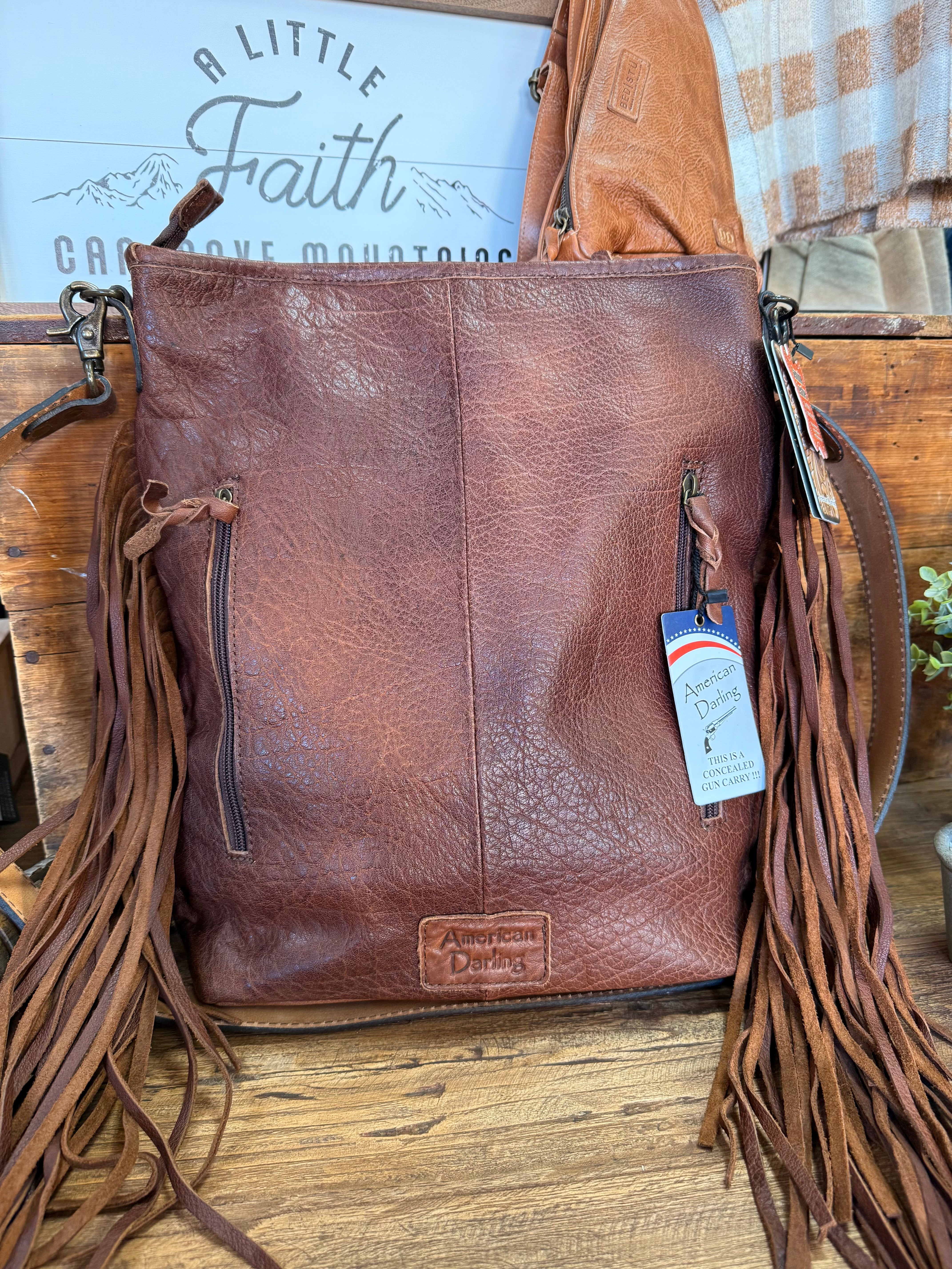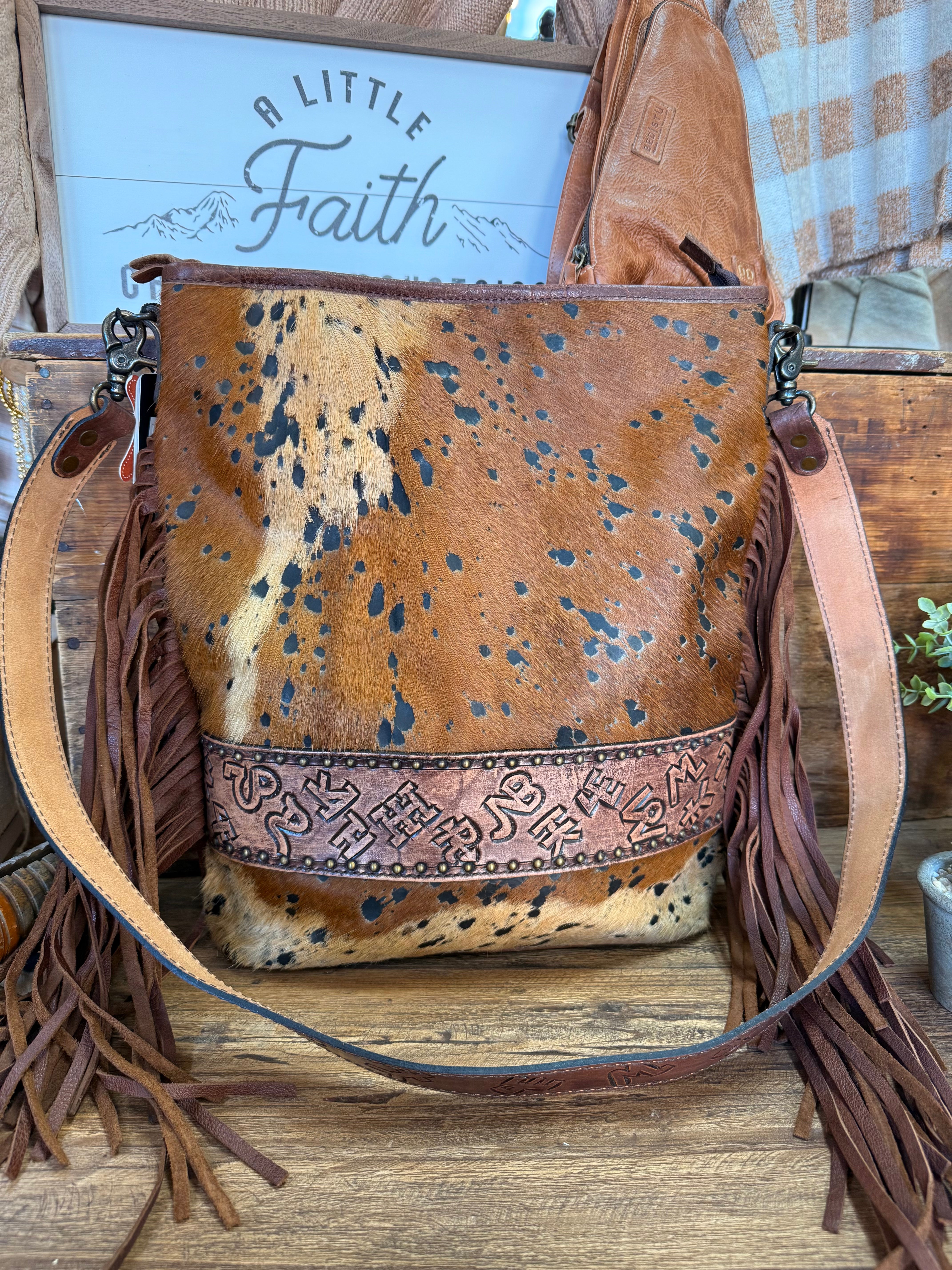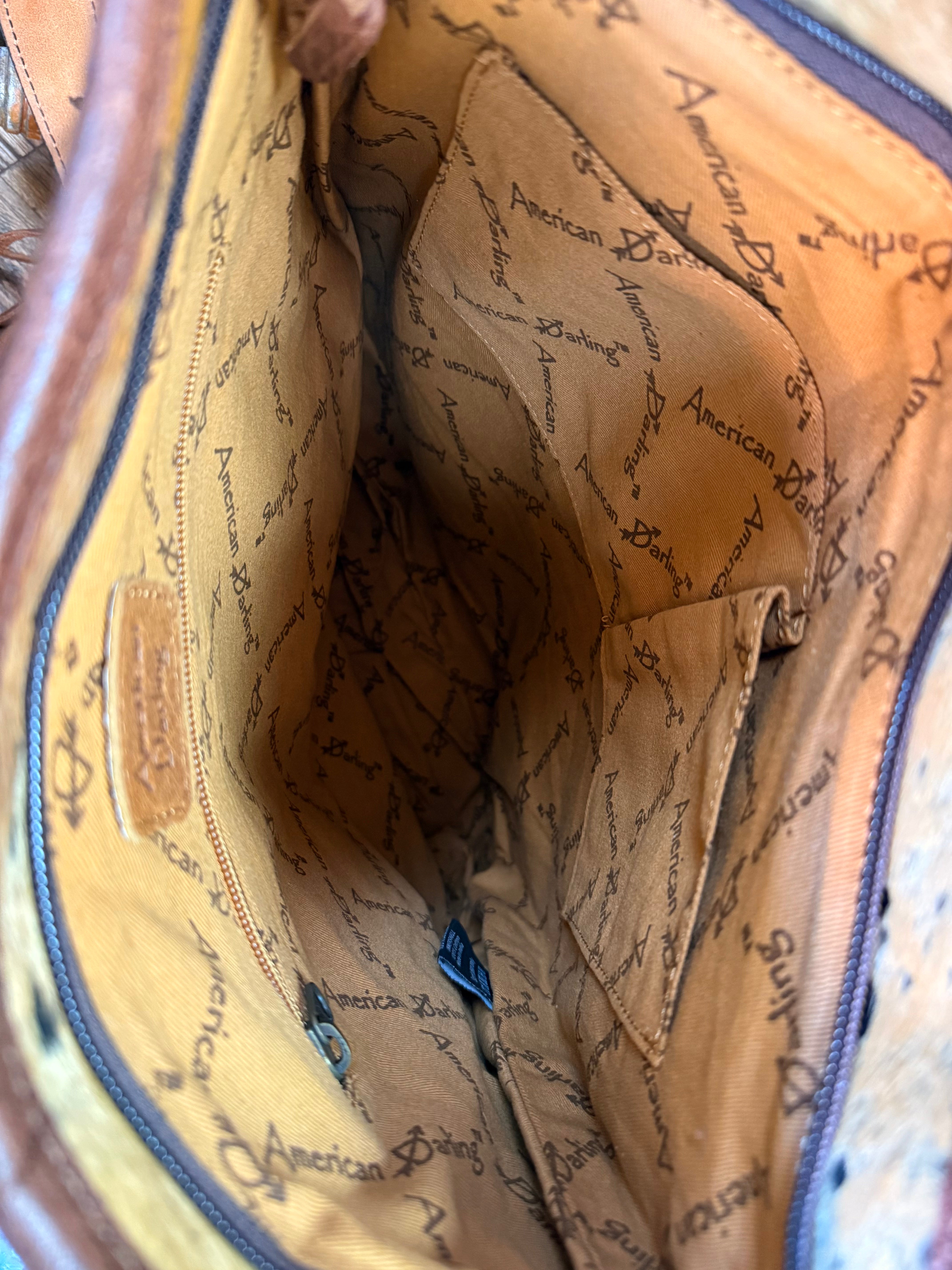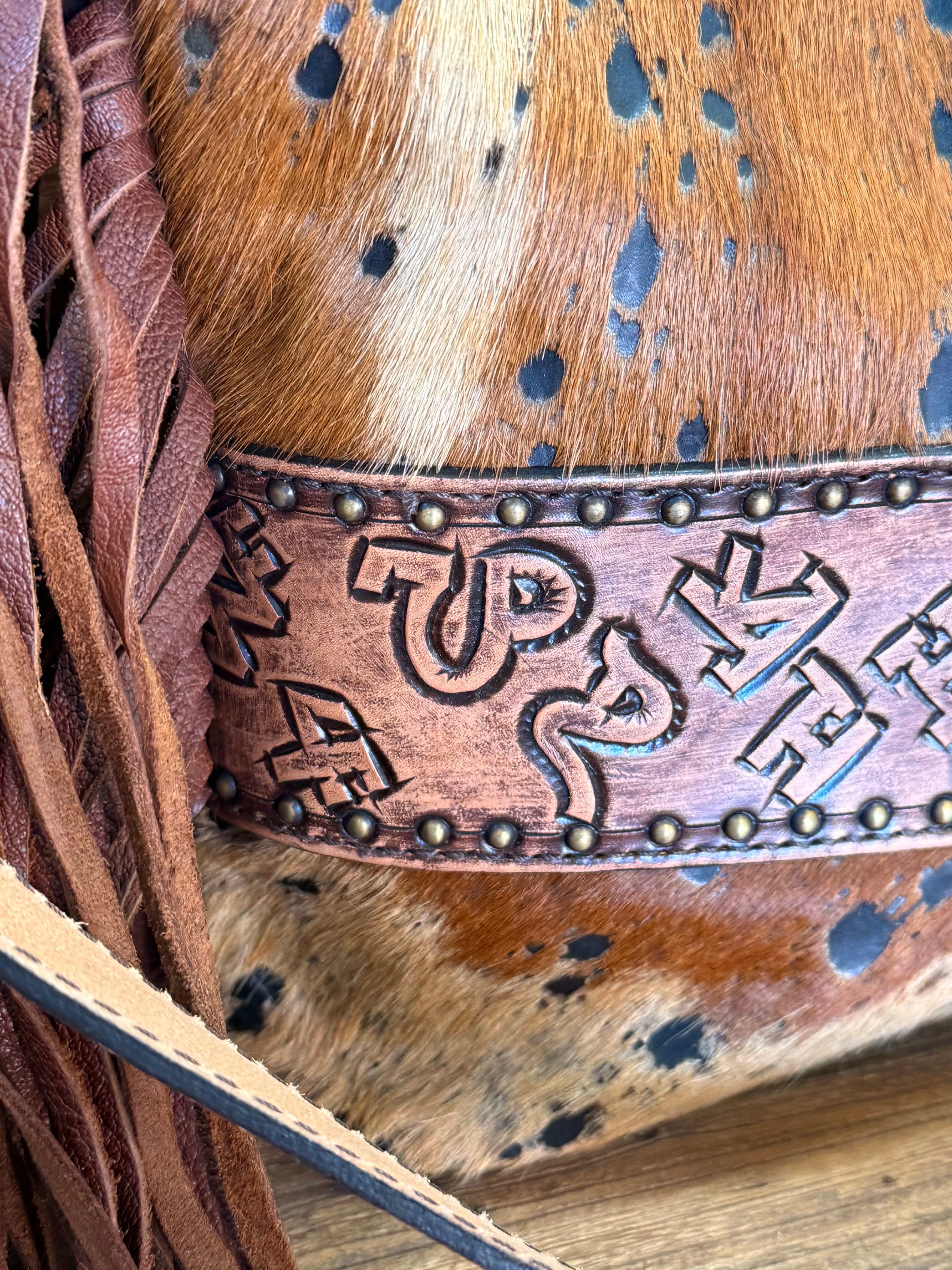hair-on cowhide leatherDetailed tooled leather trim with BrandsAdjustable tooled leather crossbody strapSoft, durable full-grain leather base and liningSolid antique-finish metal hardware for rugged usePremium YKK zipper for secure closureDimensions: 16in (H) x 15in (W) x 3.5in (D)Handmade in Texas with ethically sourced leather
