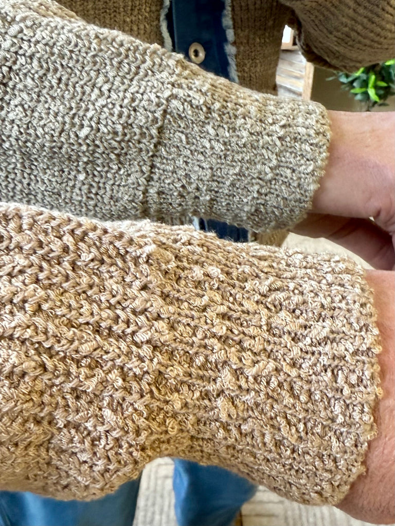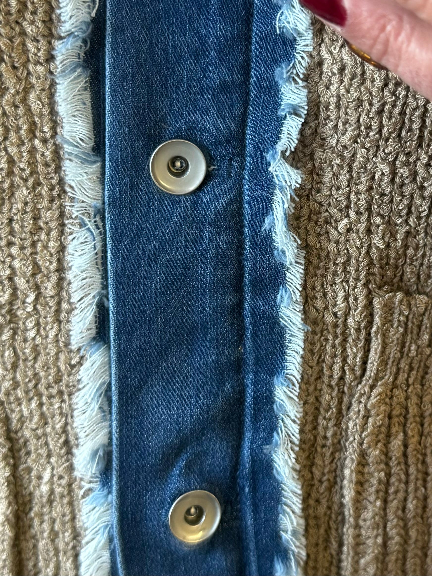 Open knit cardigan with pockets. Denim front placket with buttons.