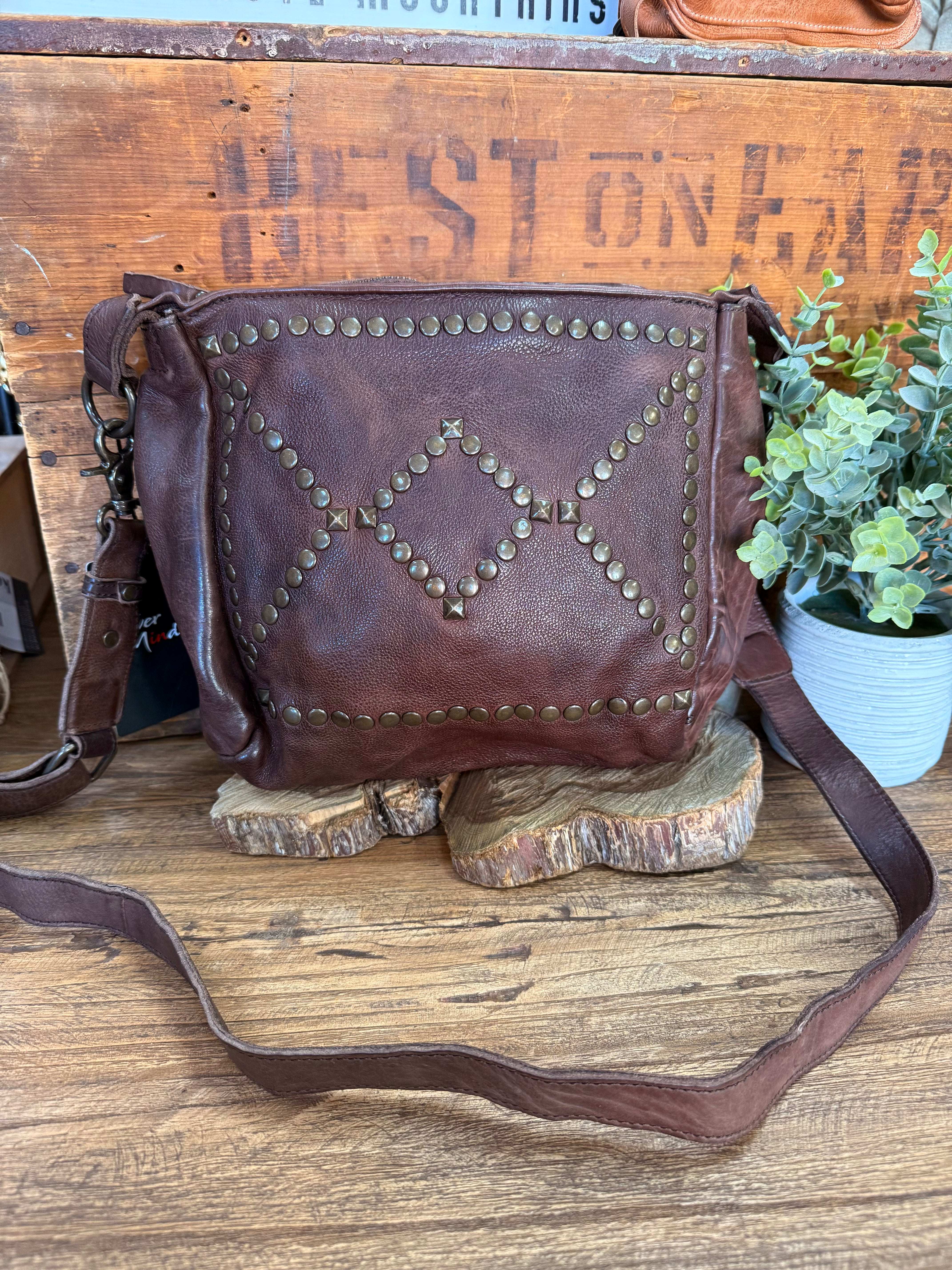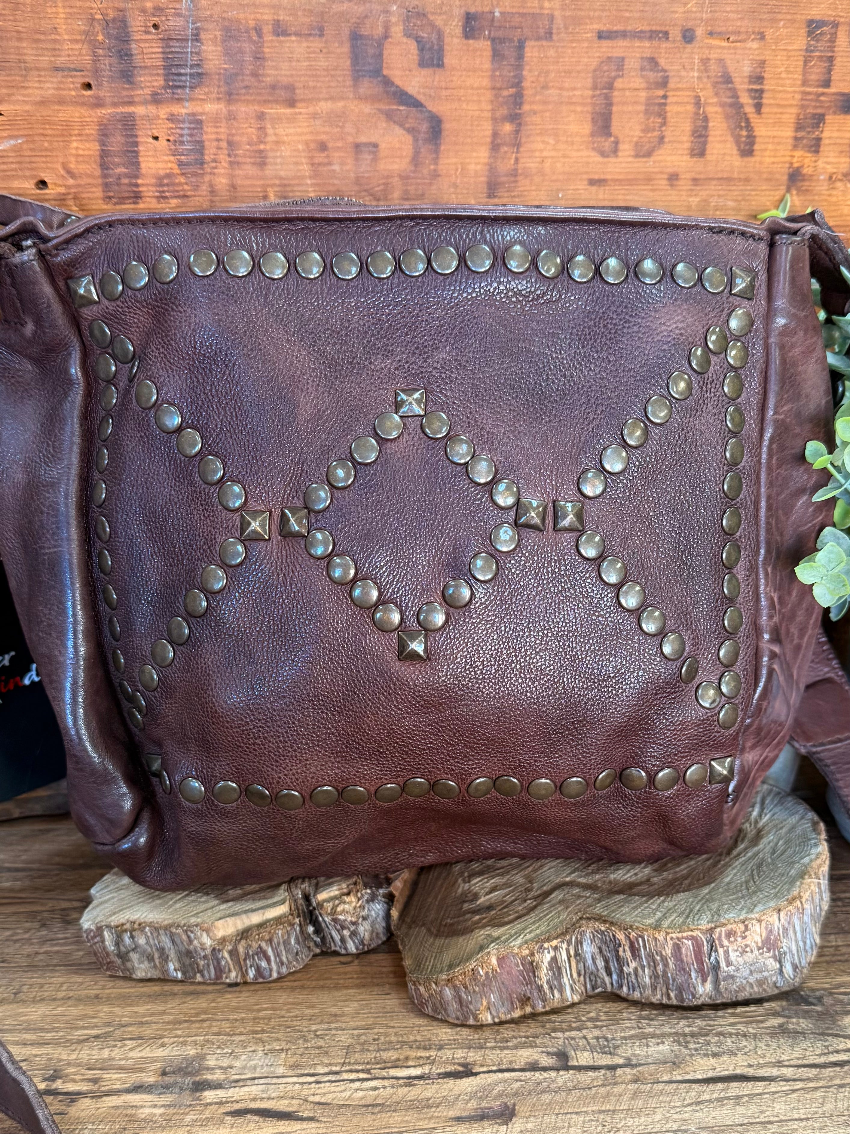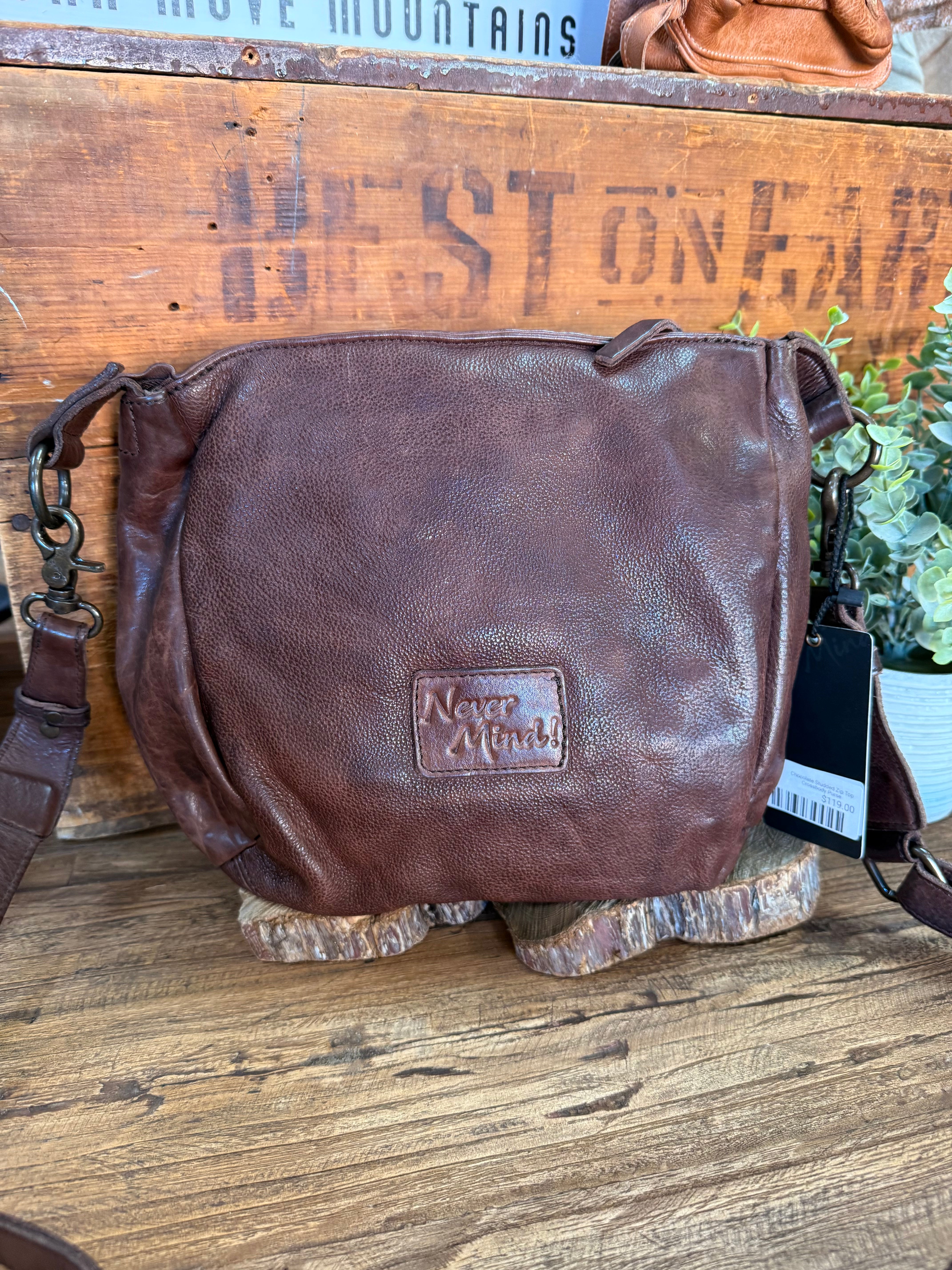 Chocolate Studded Zip Top Crossbody Purse