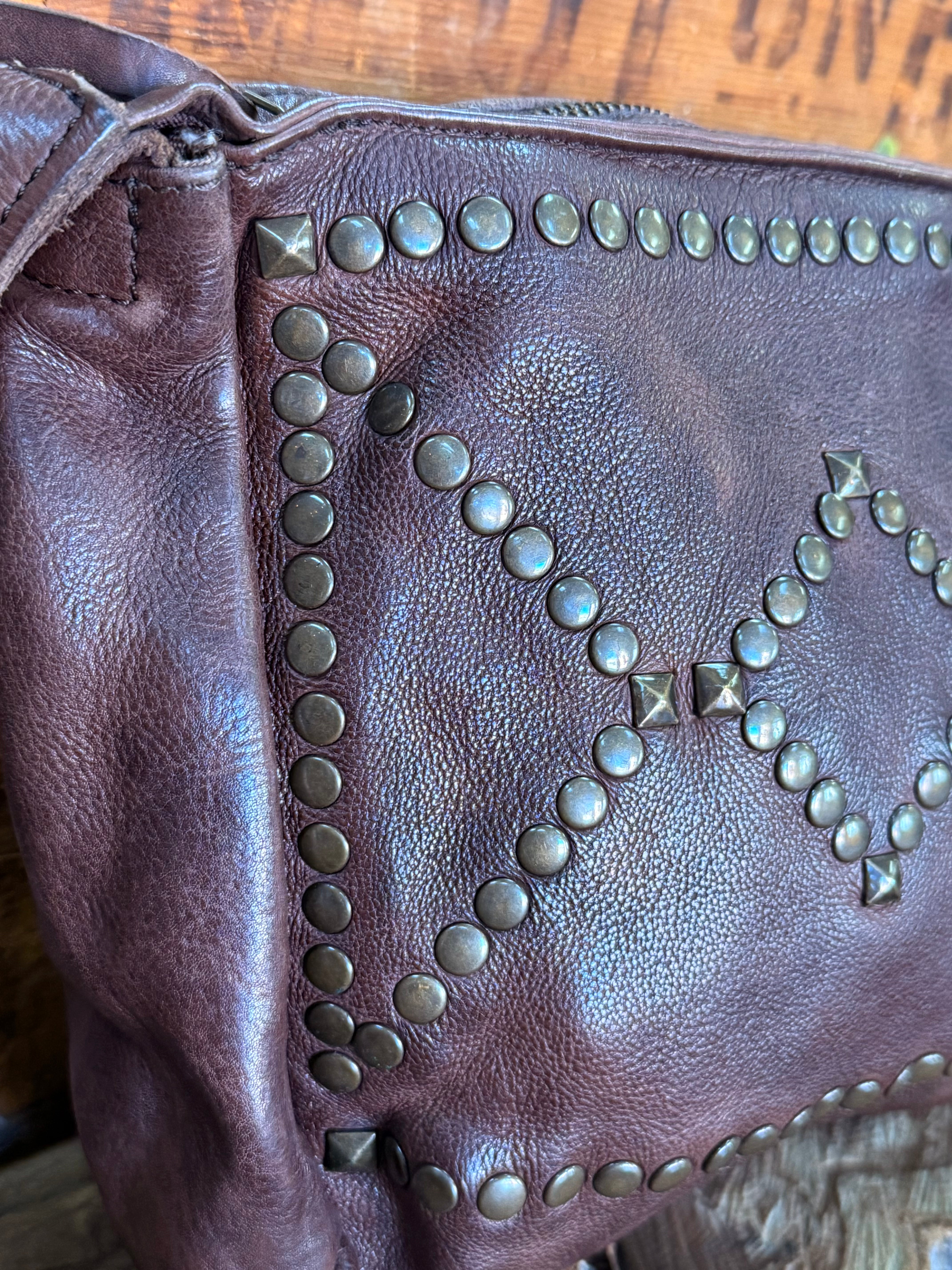 Enhanced with decorative rivets, adding a touch of rugged elegance.