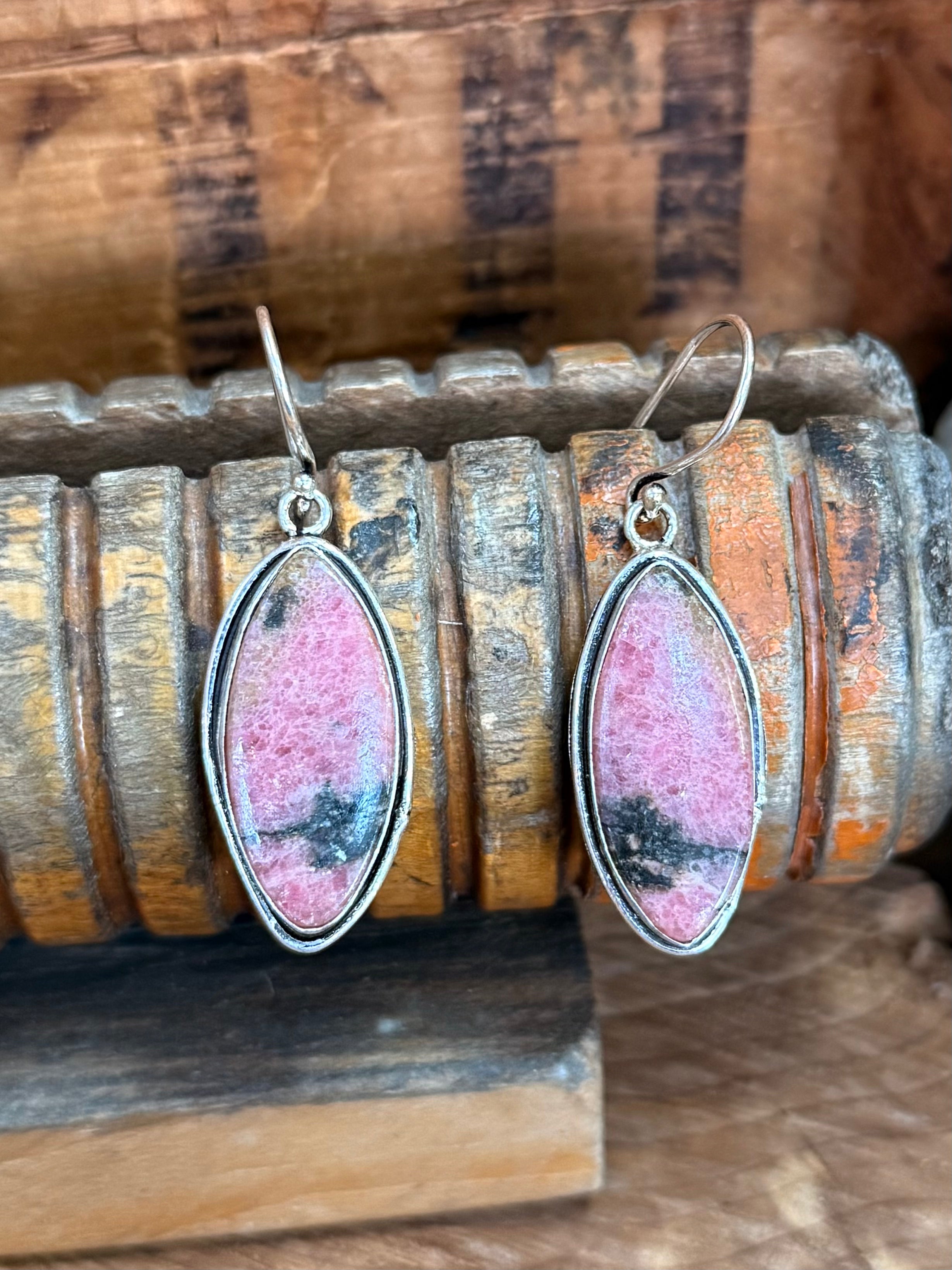 Rhodonite Natural Stone Silver Plated Brass Fishhook Earring