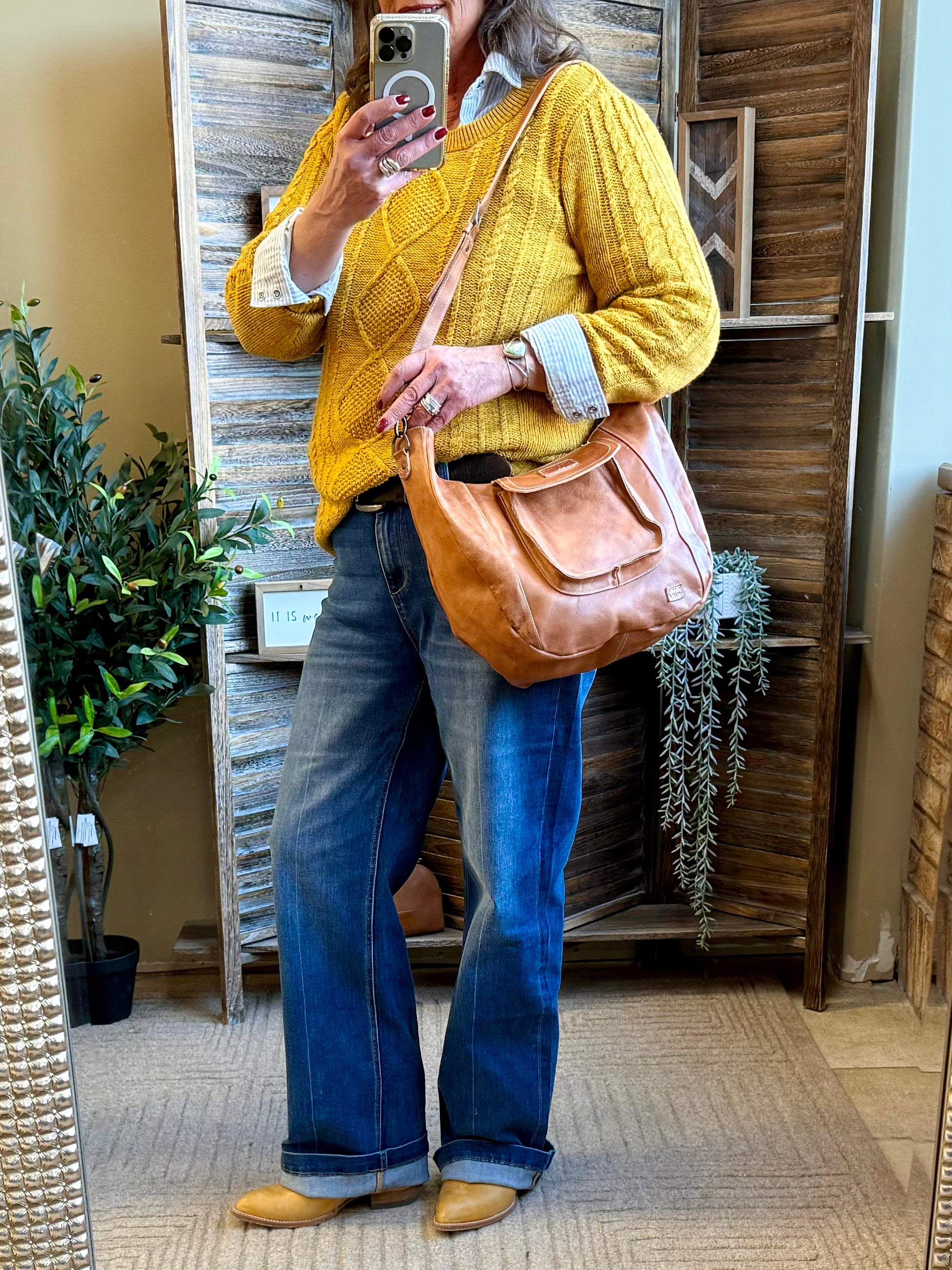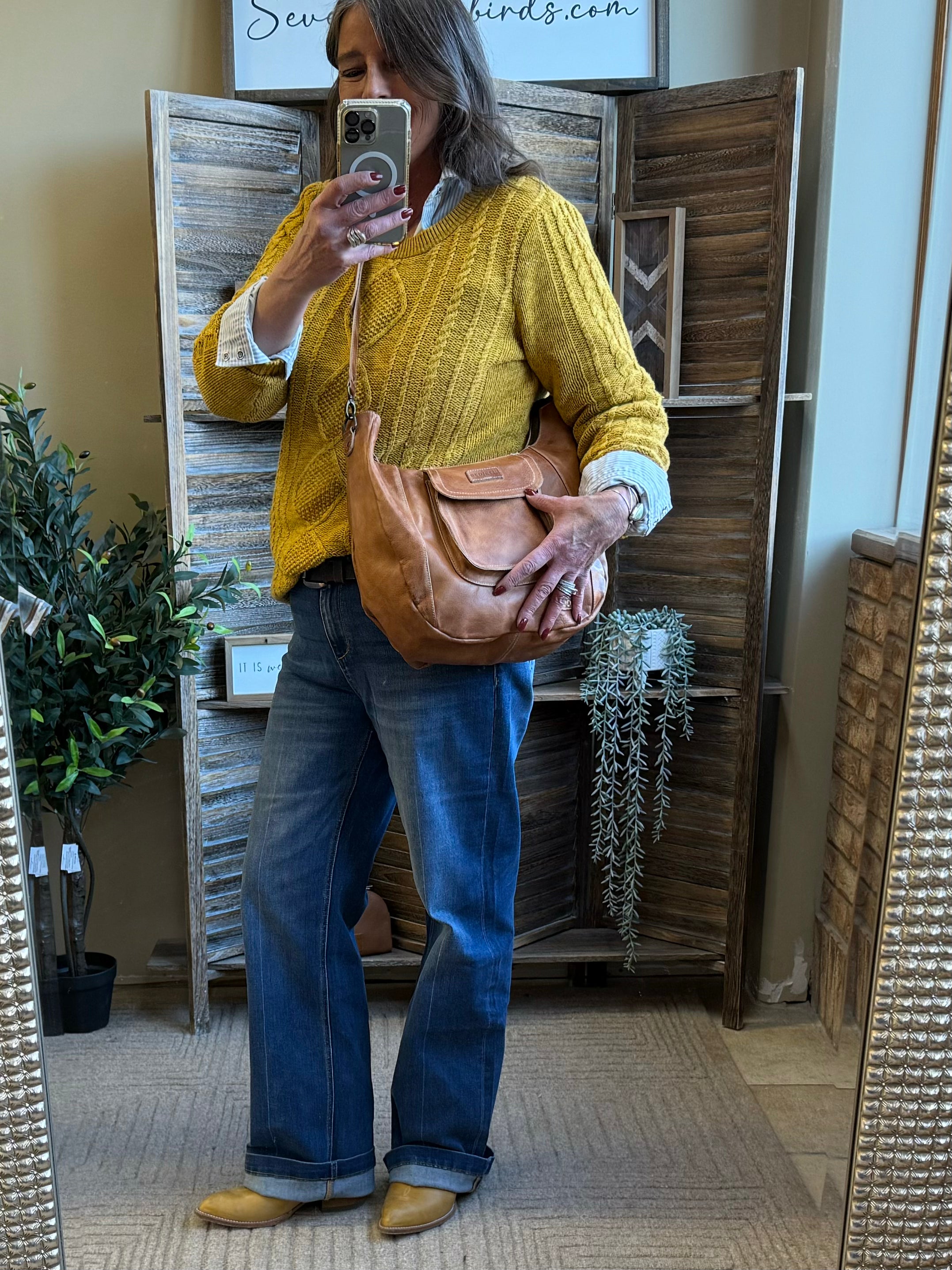 Bag size - single strap that is long enough for a crossbody (see photo) Yellow sweater model