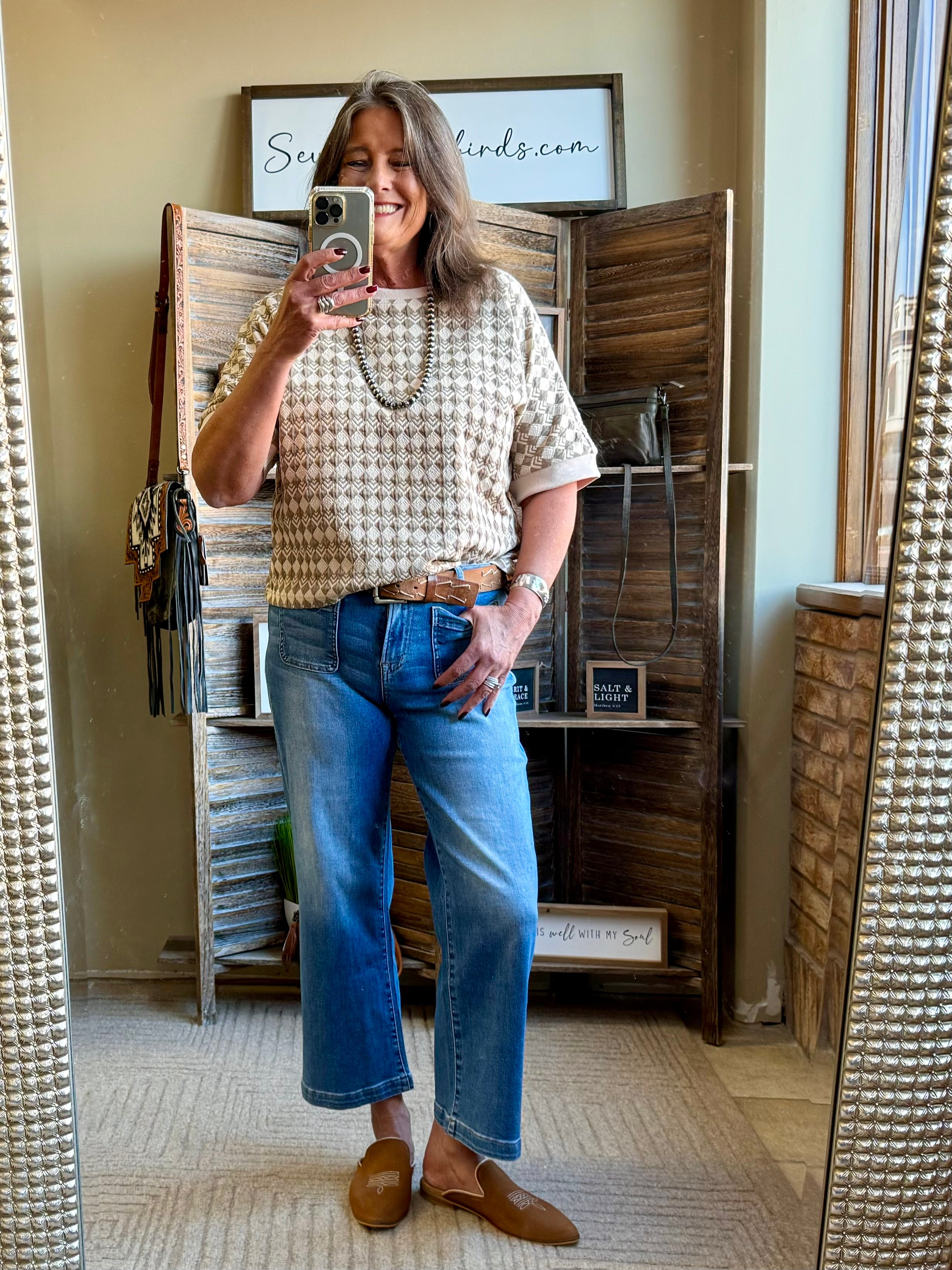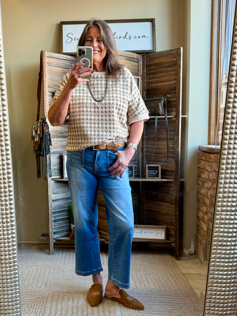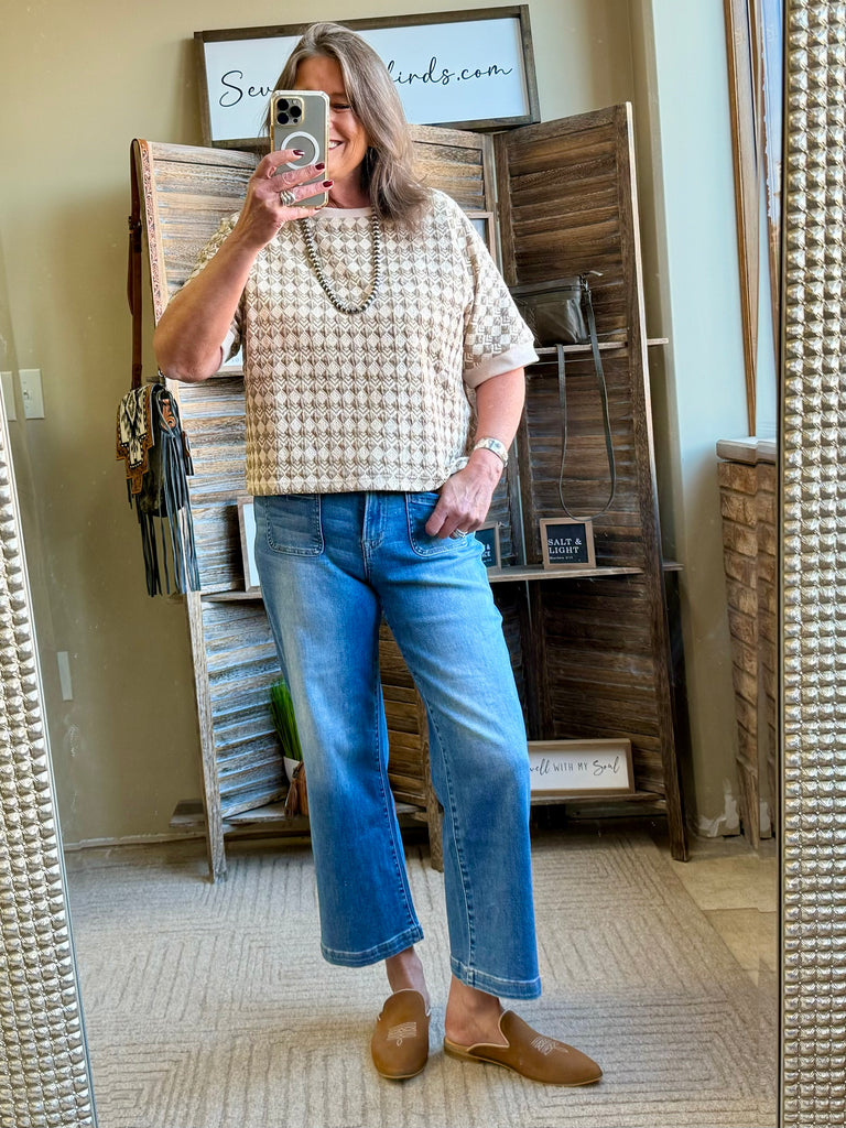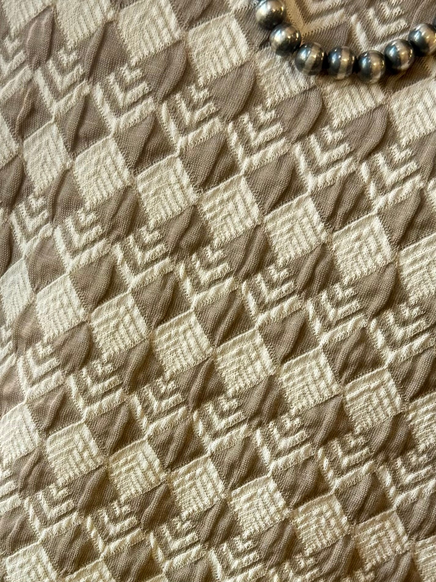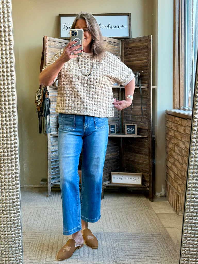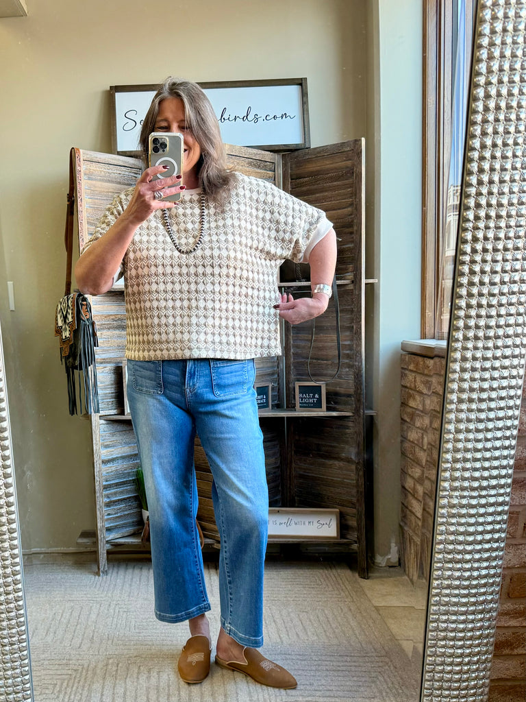 Cropped geometric t shirt with dolman sleeves and a relaxed fit. Denser knit-