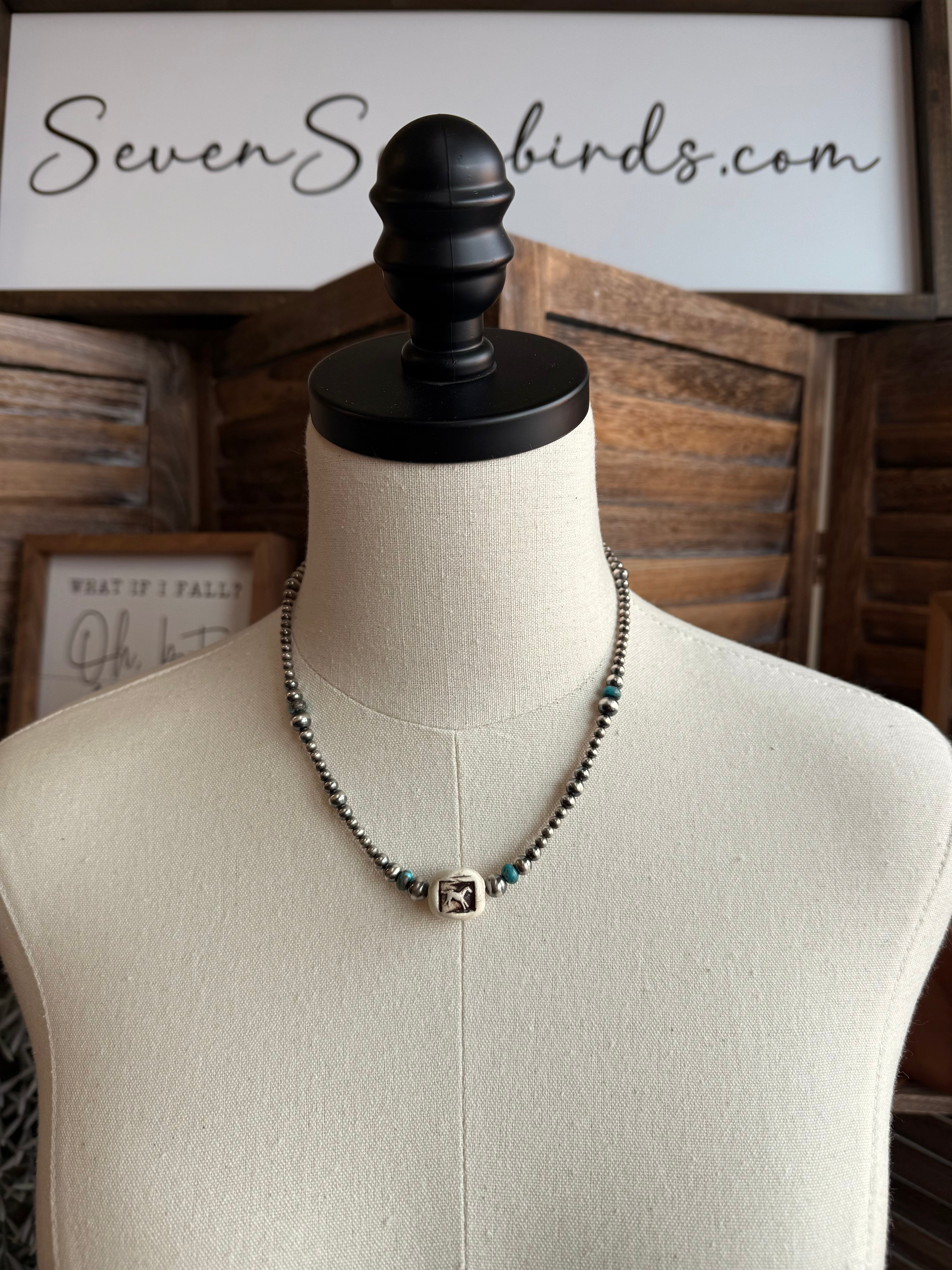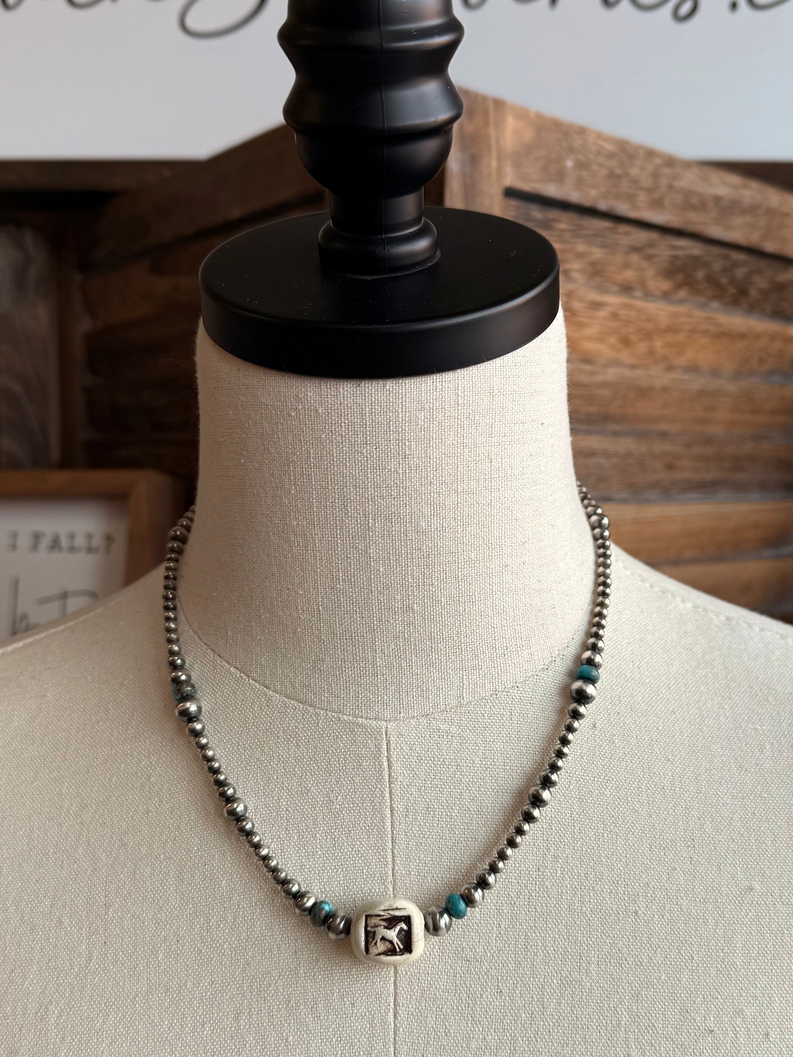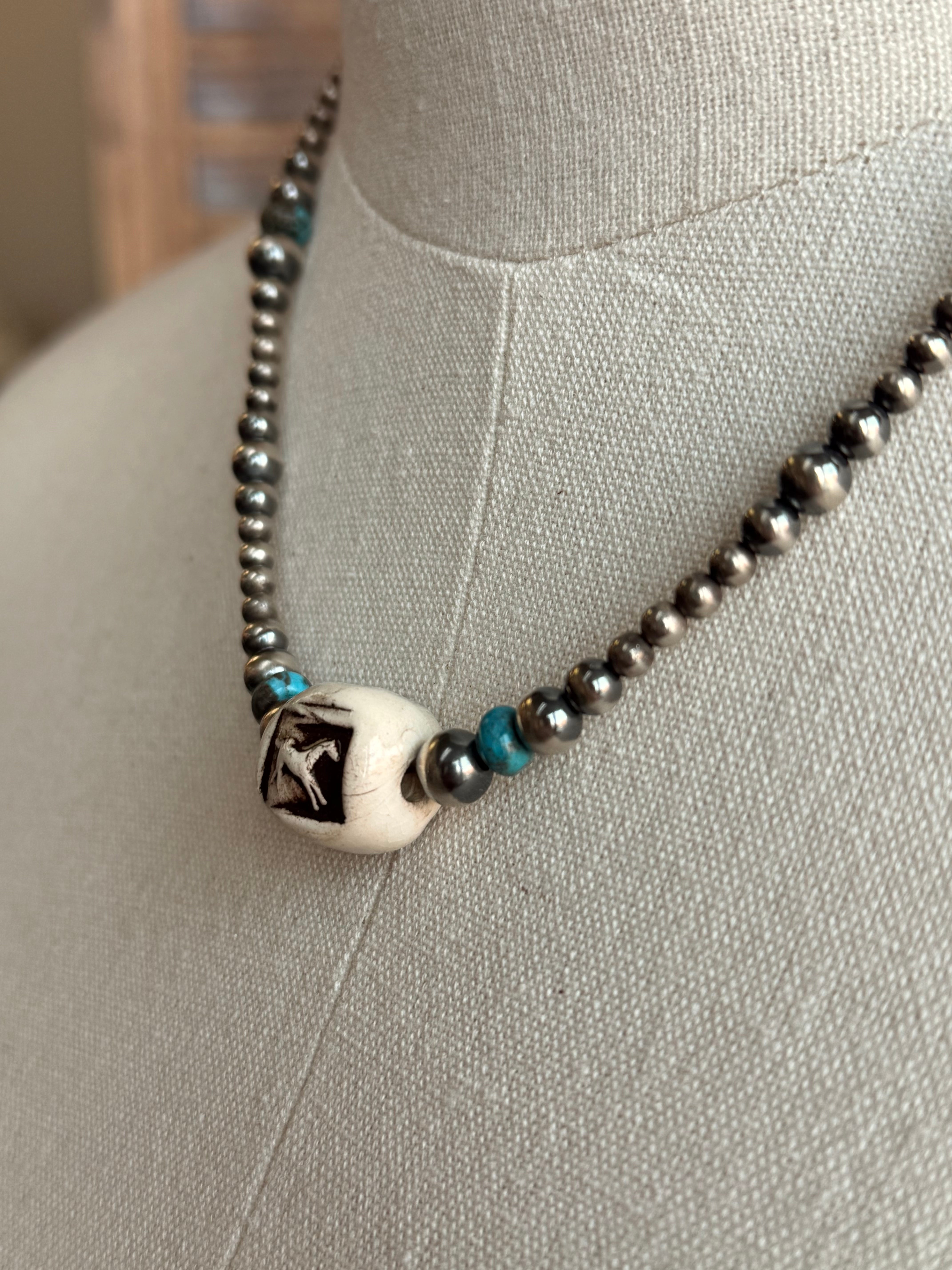 17" Turquoise and Ceramic Running Horse Sterling Silver Necklace