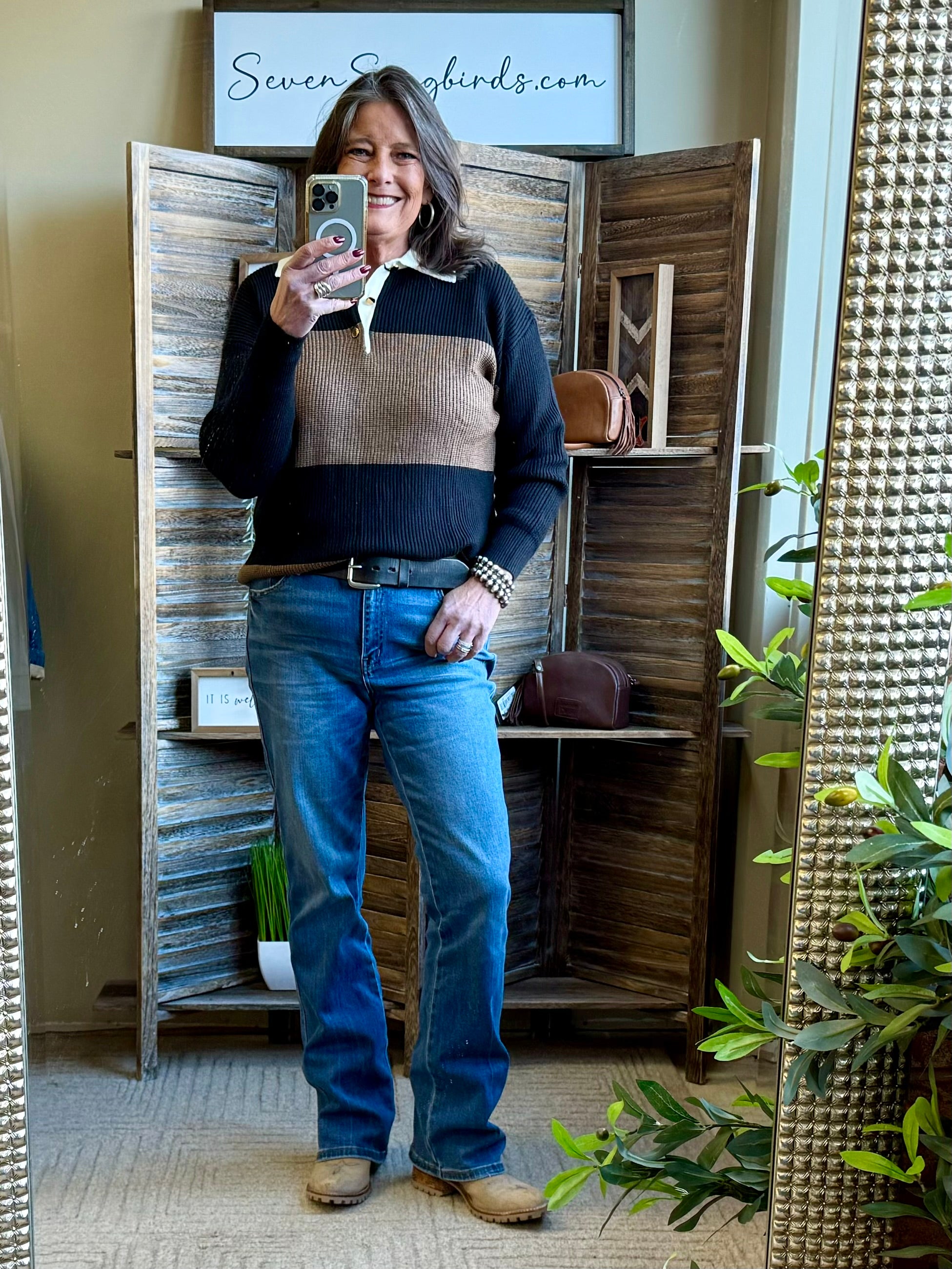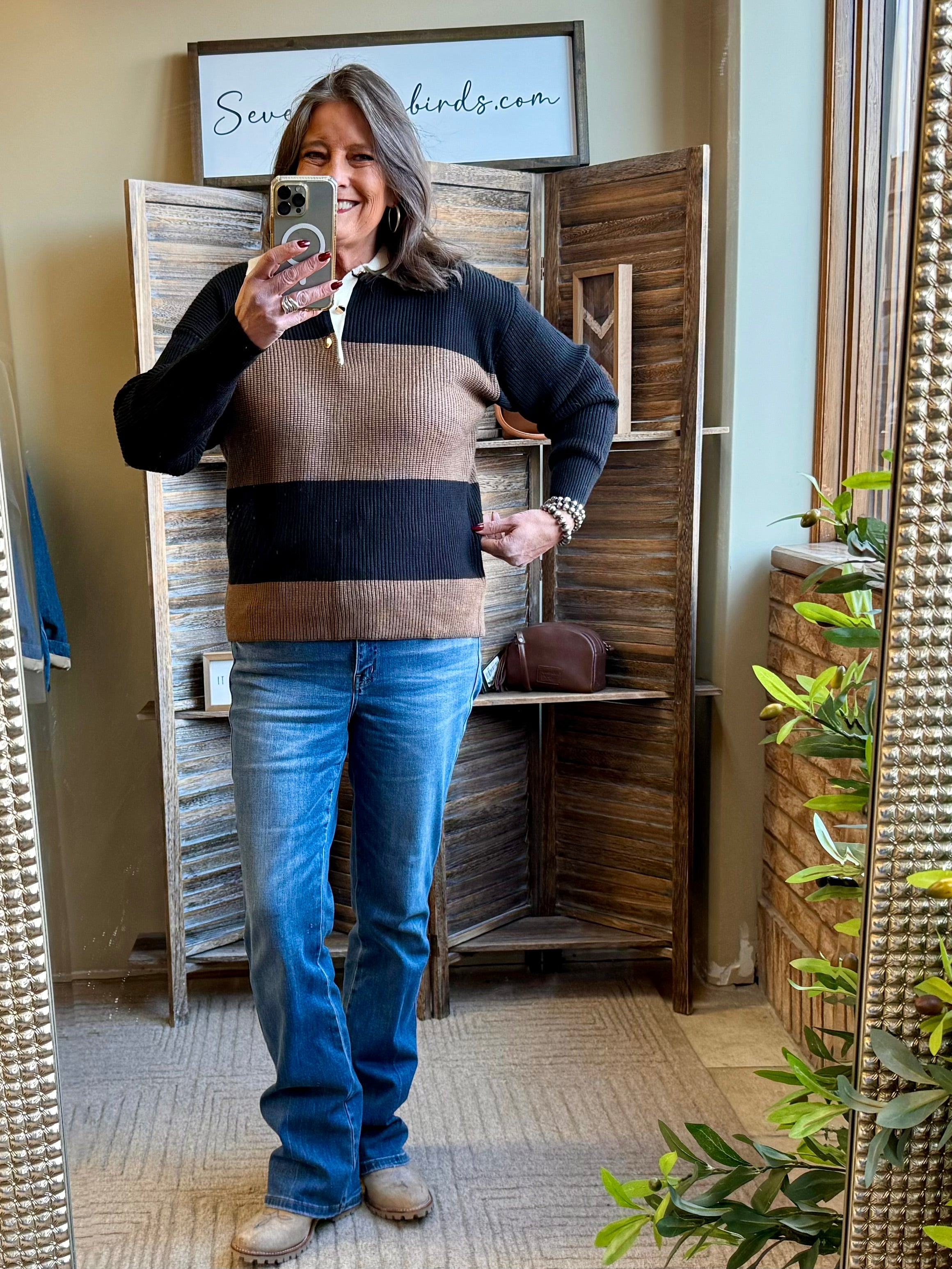 * Relaxed Fit * Color Block Sweater * Henley Neck * Contrast Collar * Ribbed Knit * Striped Pullover