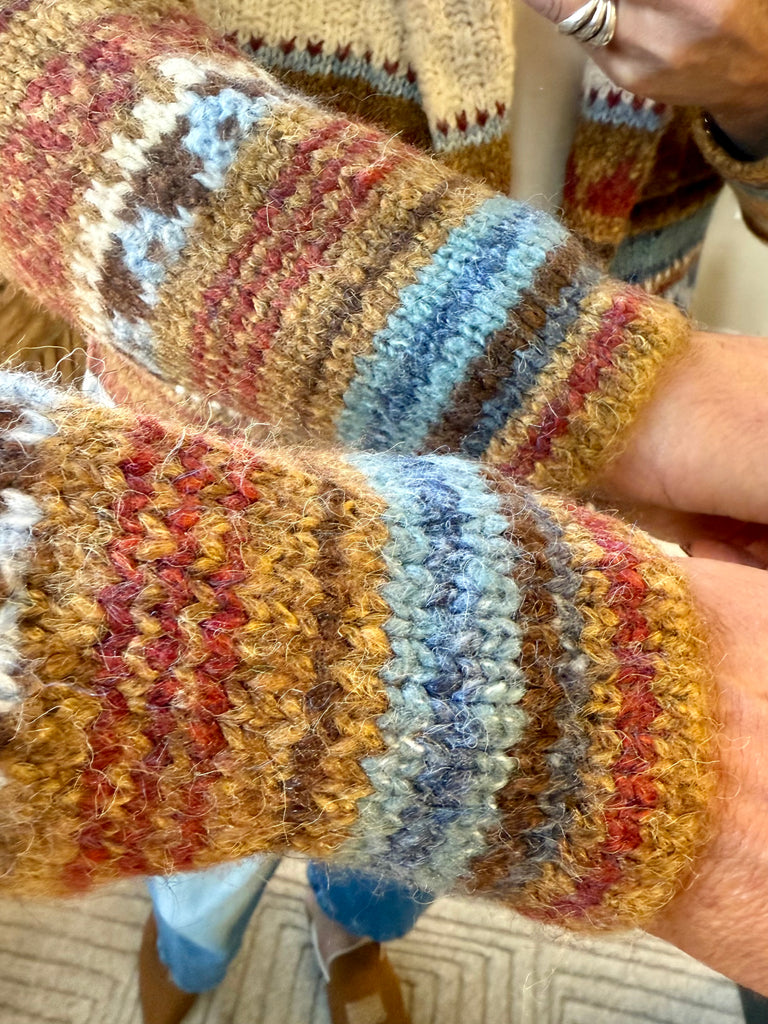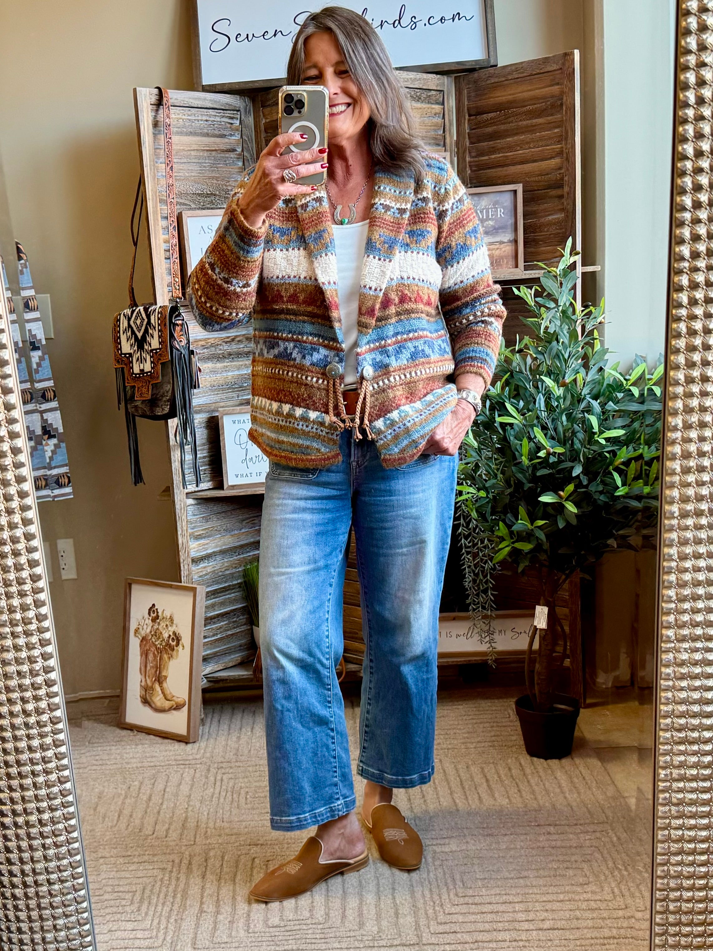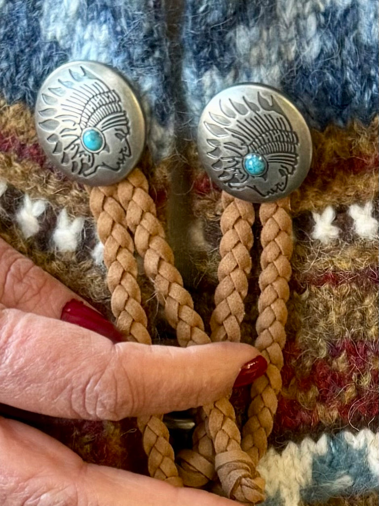 Gorgeous colors in this soft open front cardigan. Decorative indian head buttons on braided tassels. Heavier weight.