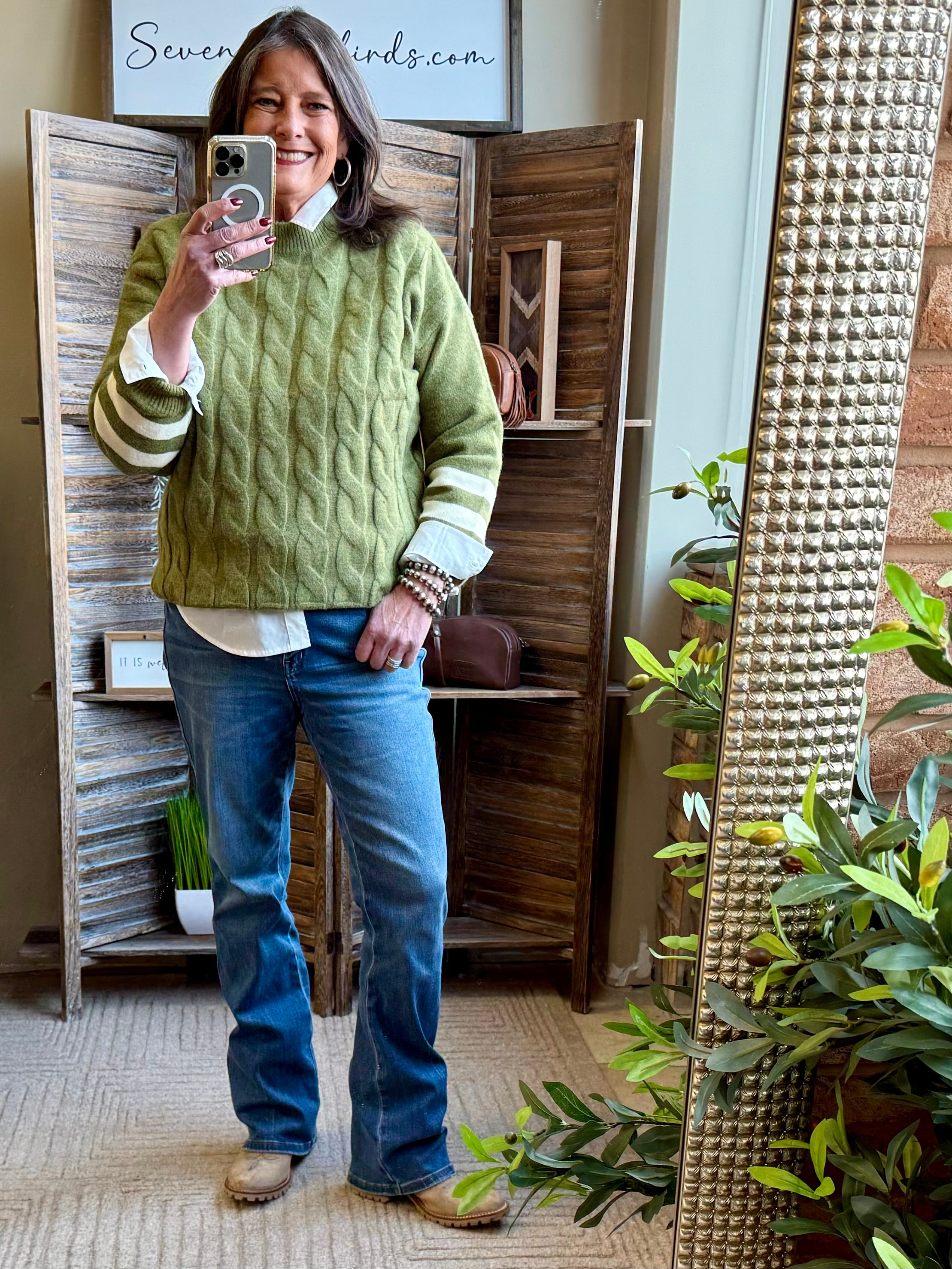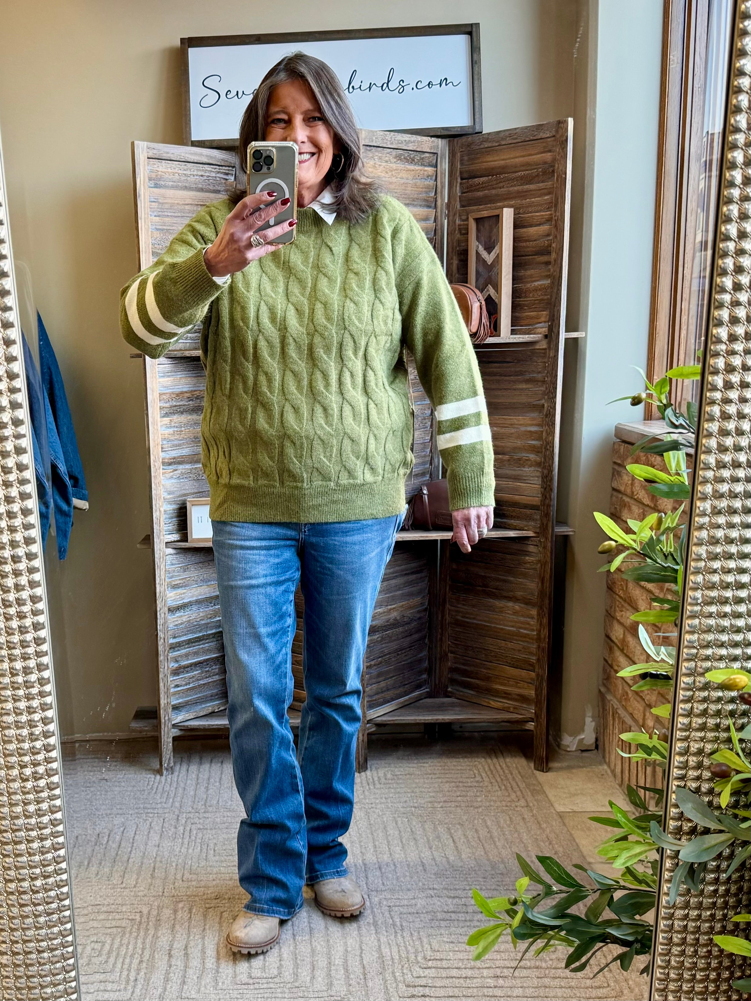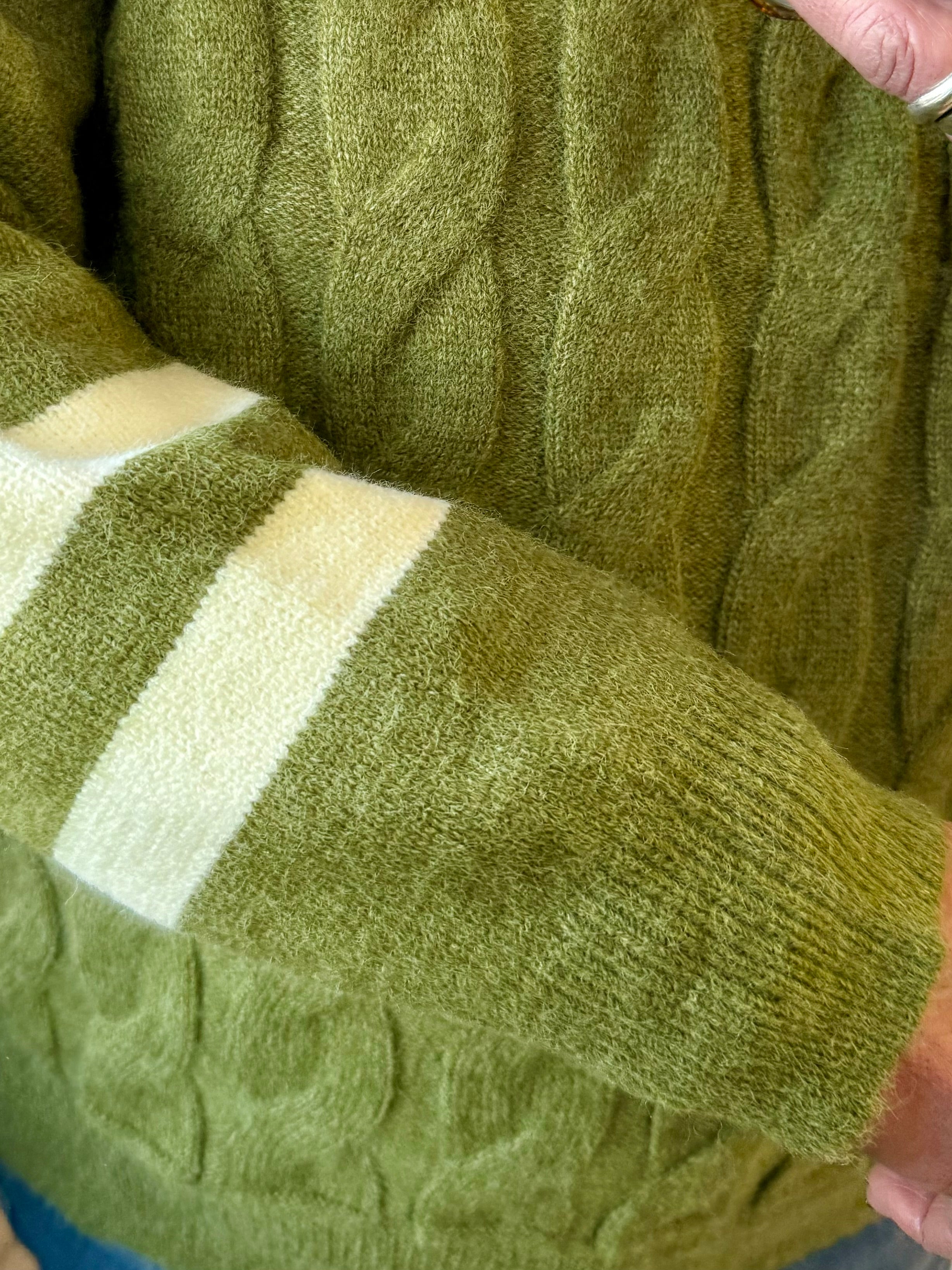 Olive Cable Knit Varsity Crew Neck Sweater