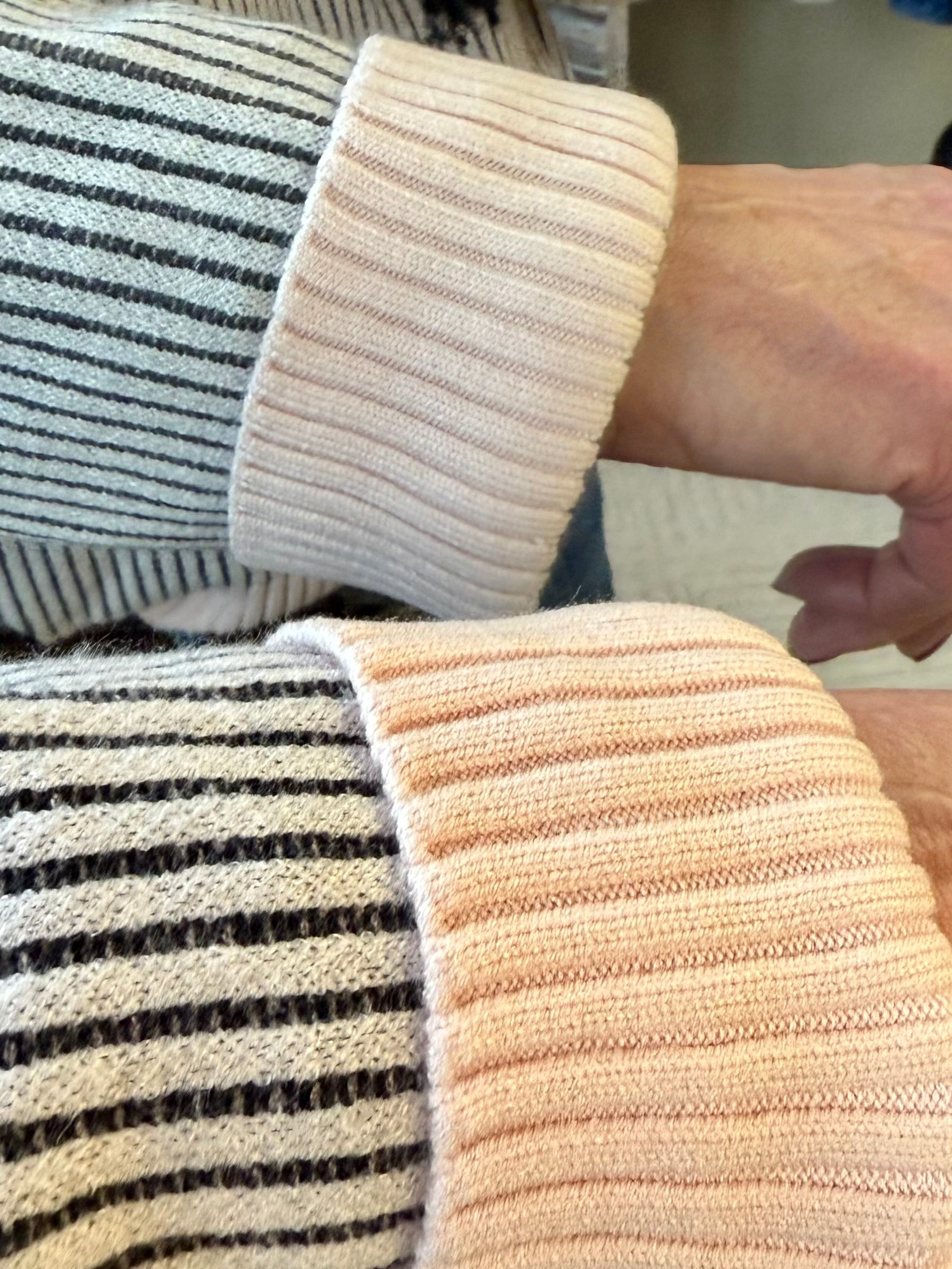 Pink! It's hard to see but this sweater has a nice blush pink.