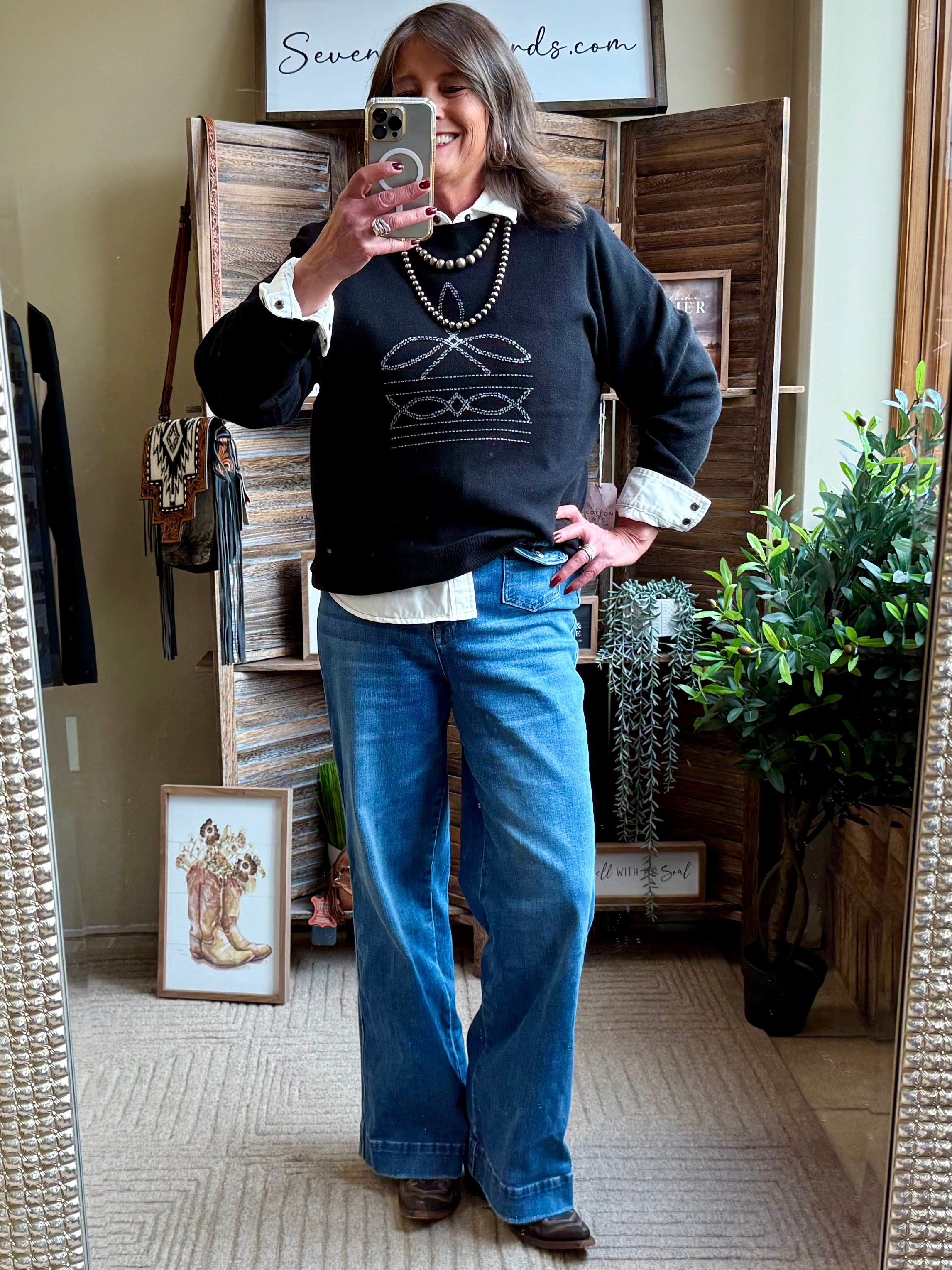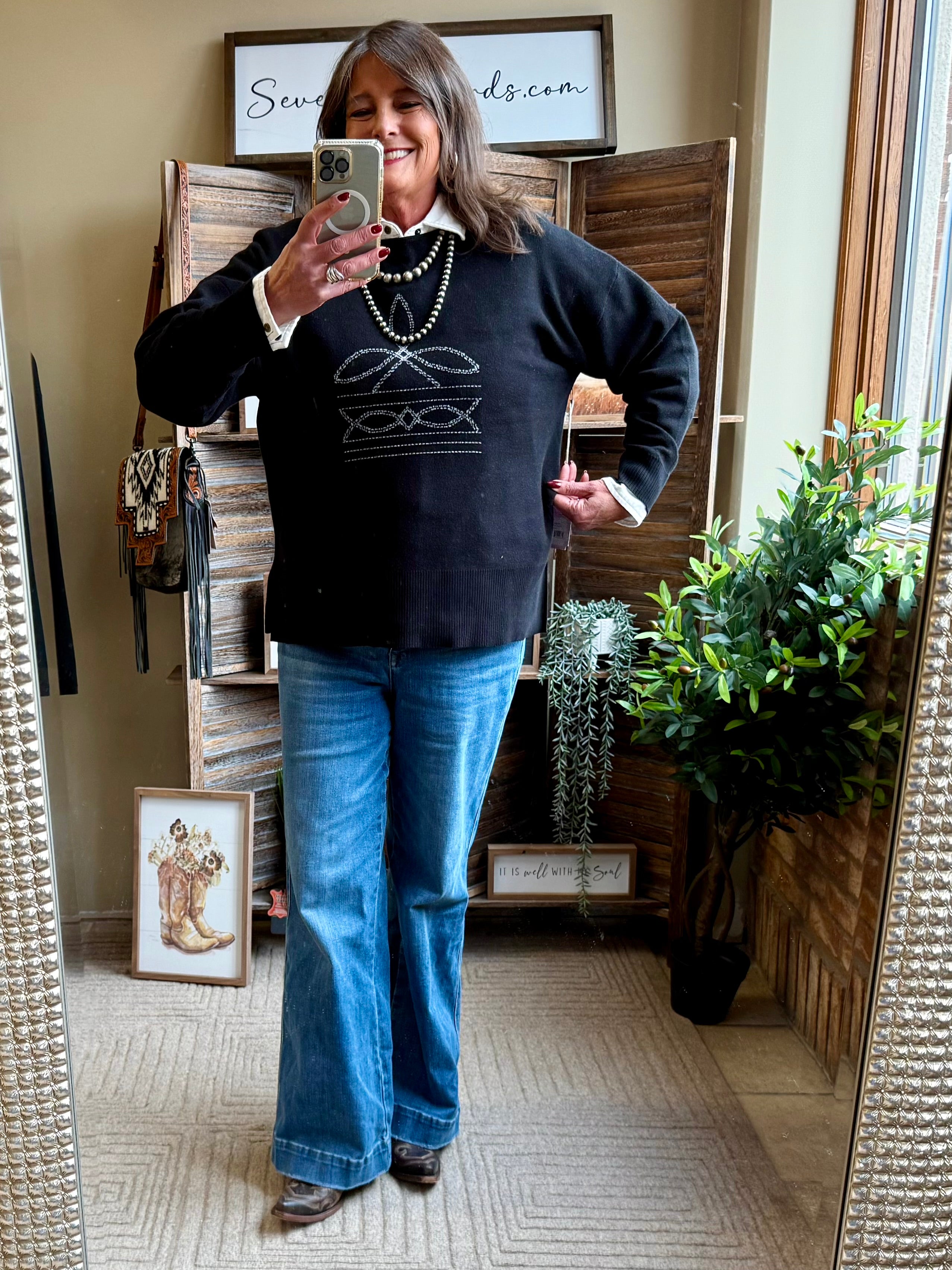 Black Boot Stitched Crew Neck Sweater