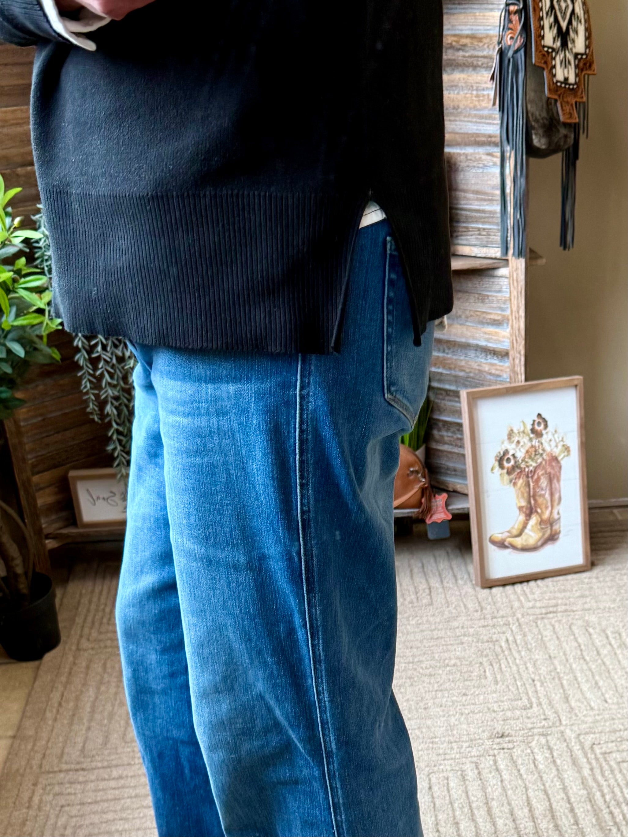 Lightweight crew neck sweater with a side slit. Boot stitch pattern.