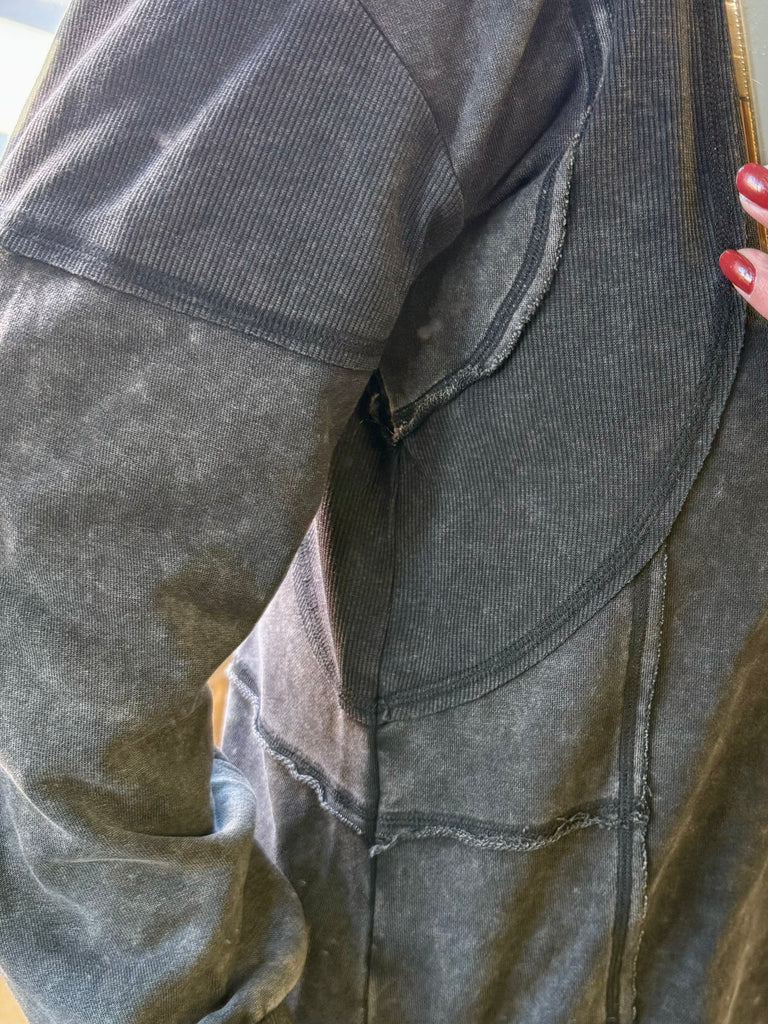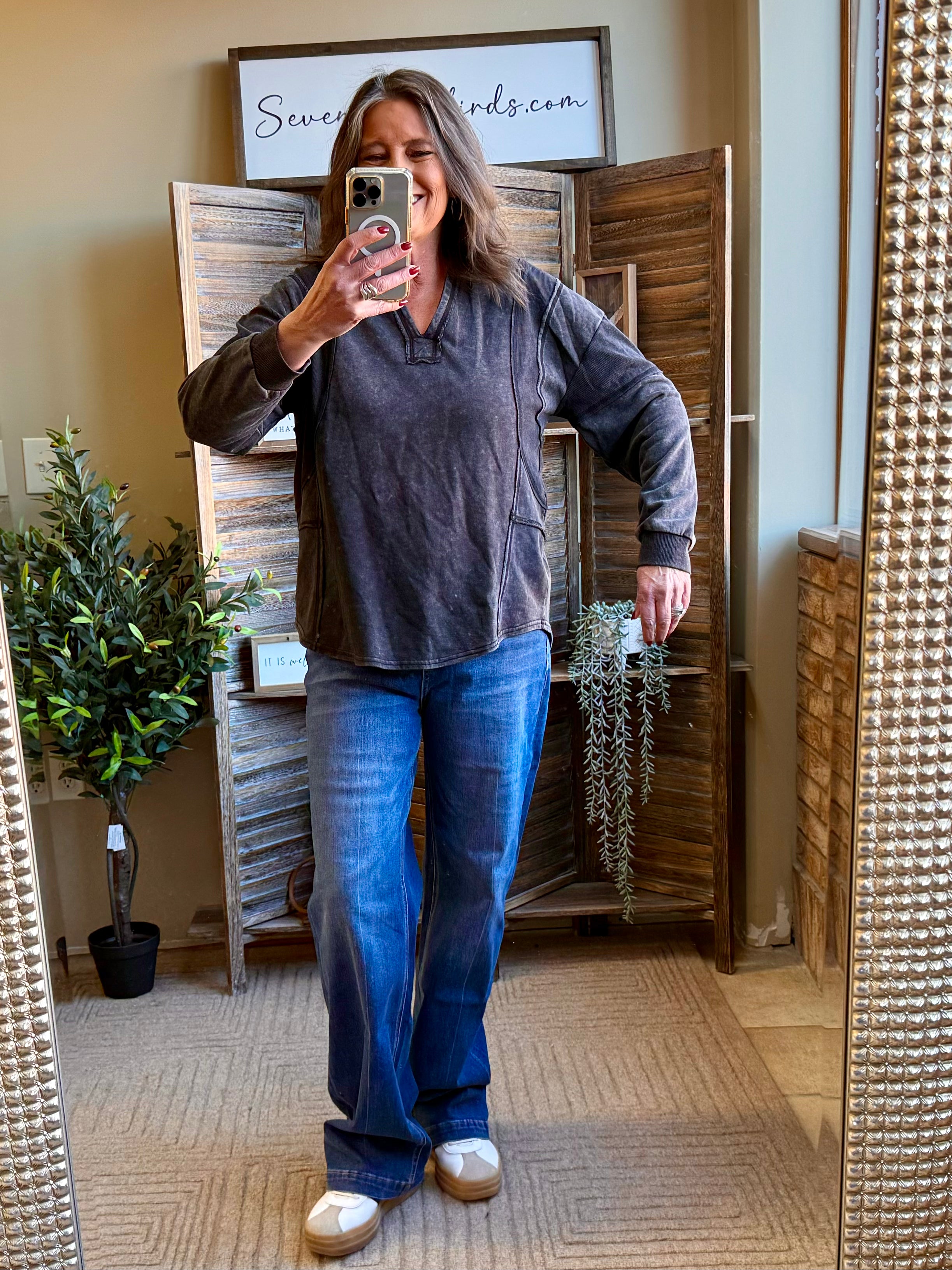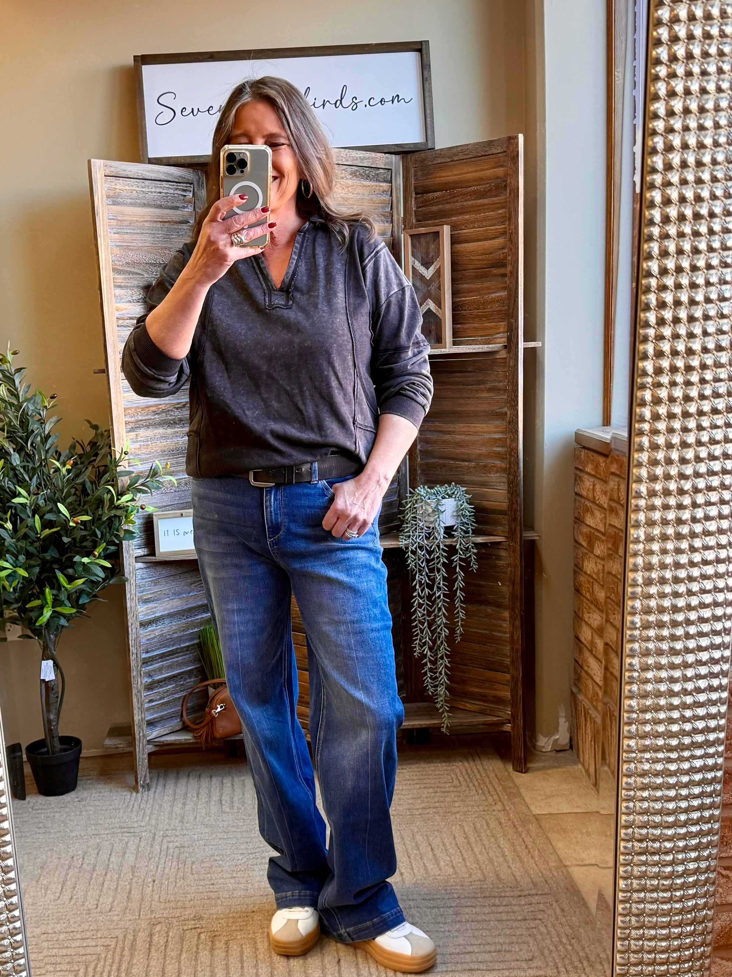 Lightweight mineral washed sweatshirt with a collar and open neckline.