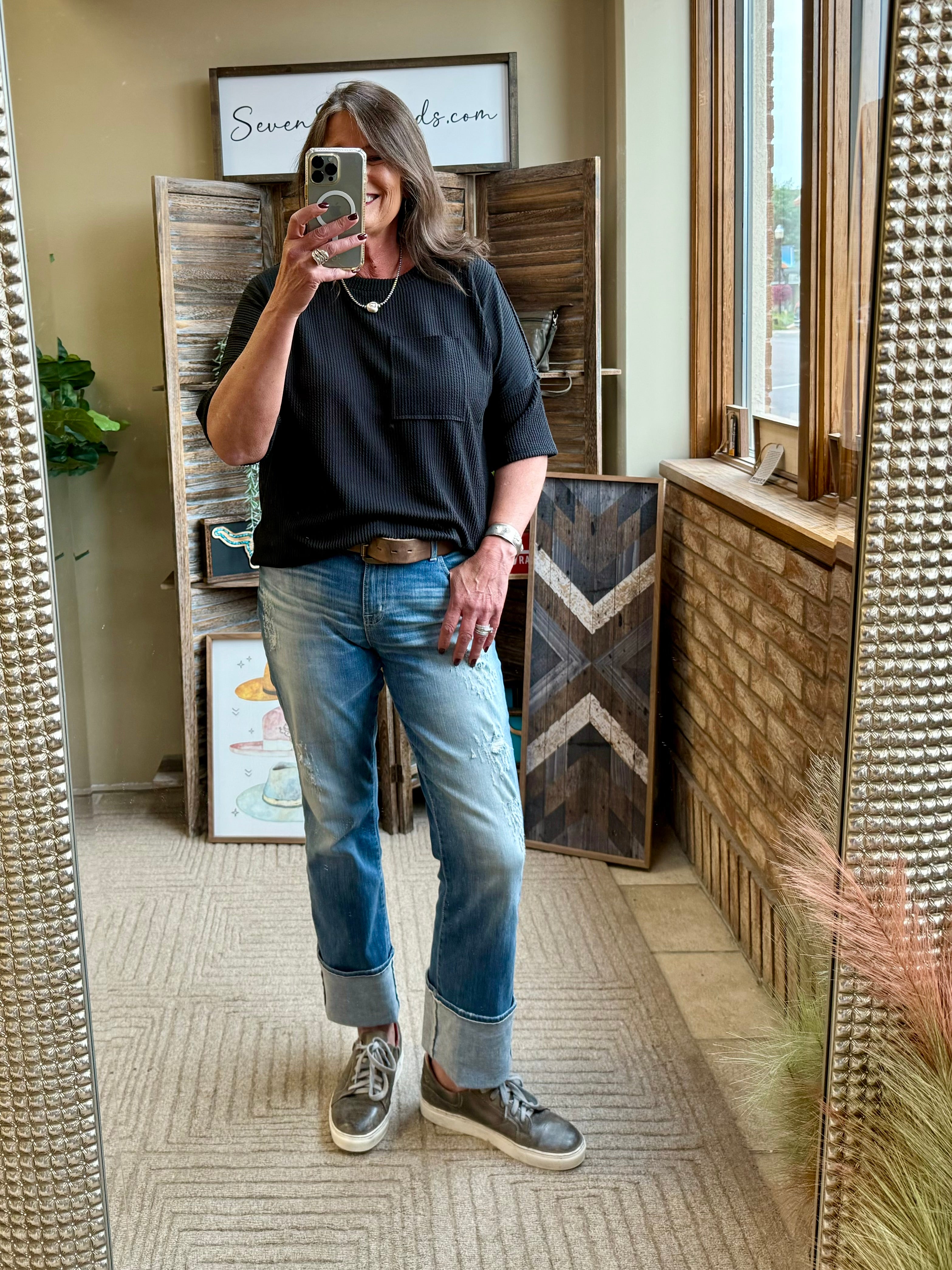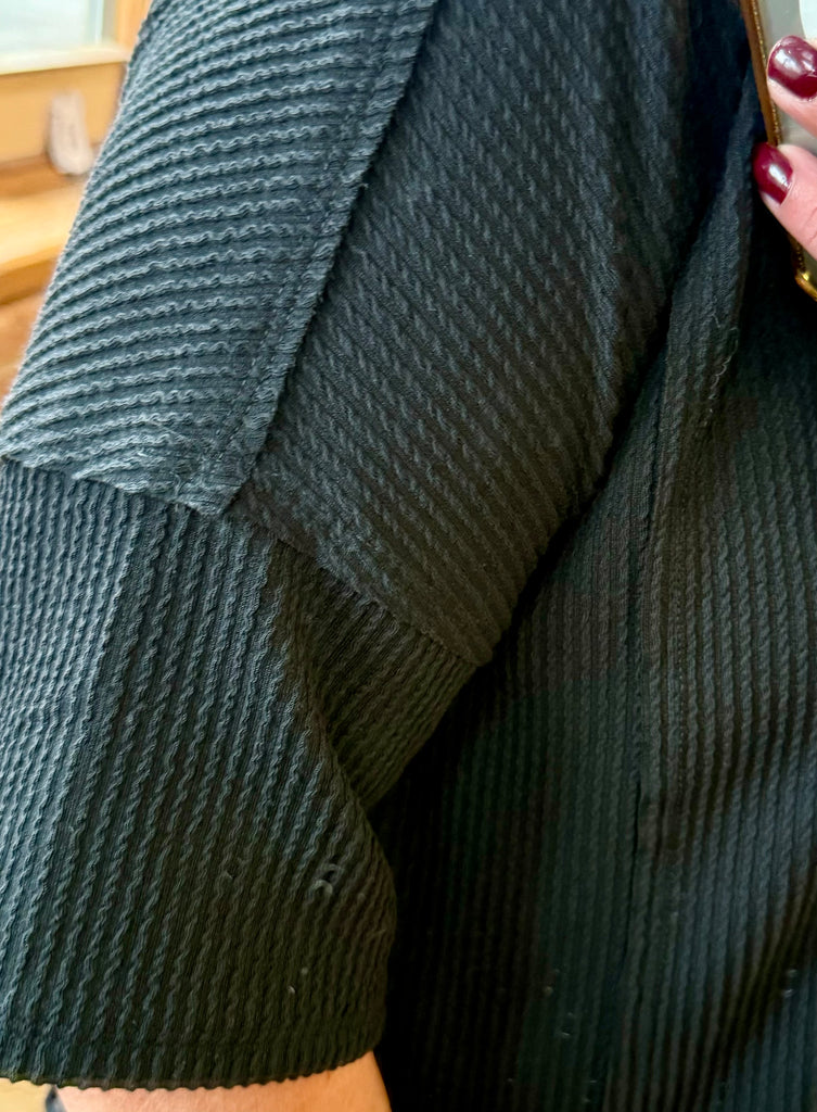 Raw edge details, round neckline, front pocket and patched on the back. Ribbed Texture