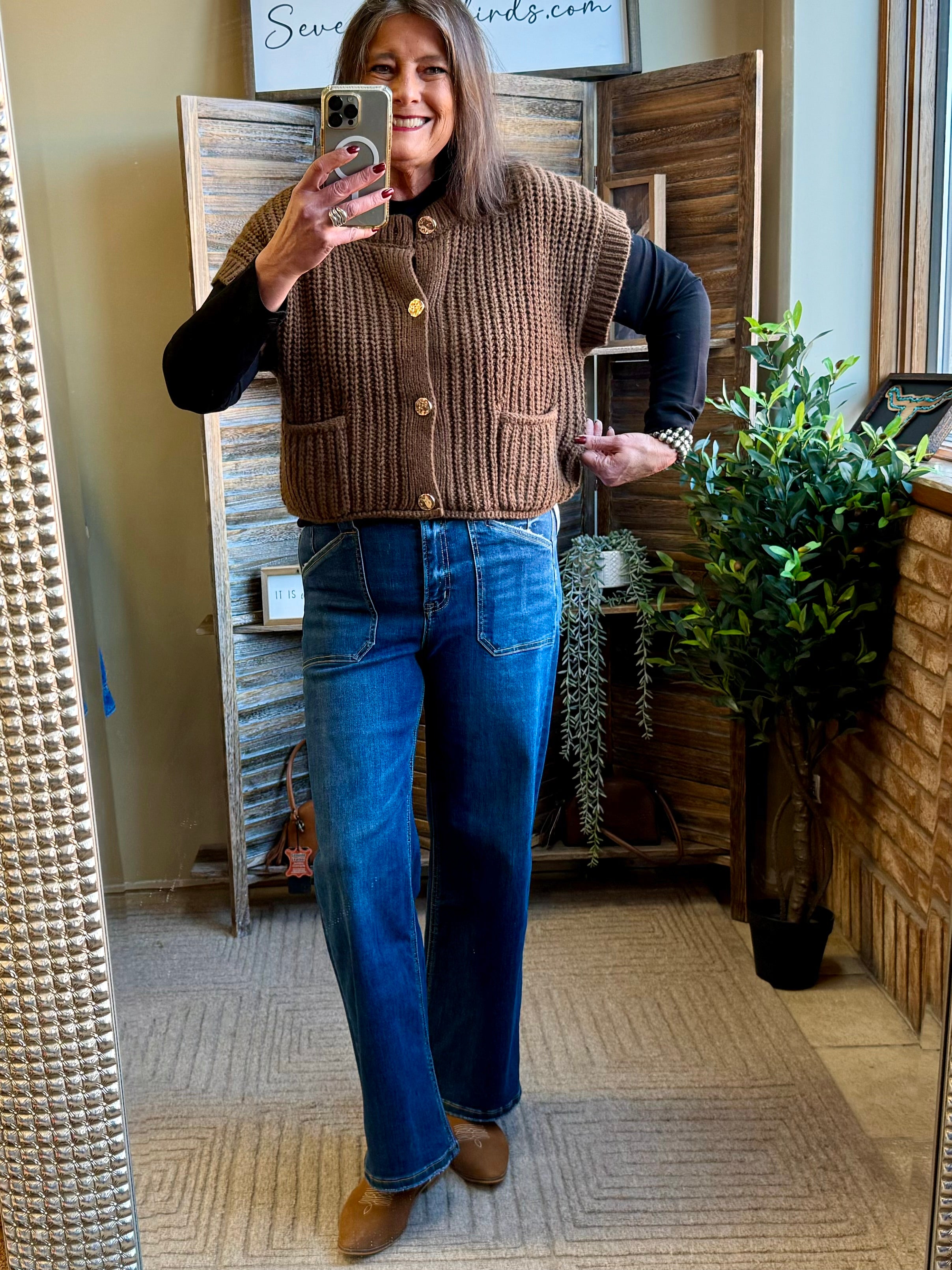 - Oversized Button Down Knit Sweater Top - Round Neck - Short Sleeve - Front Pockets - Ribbed Hem