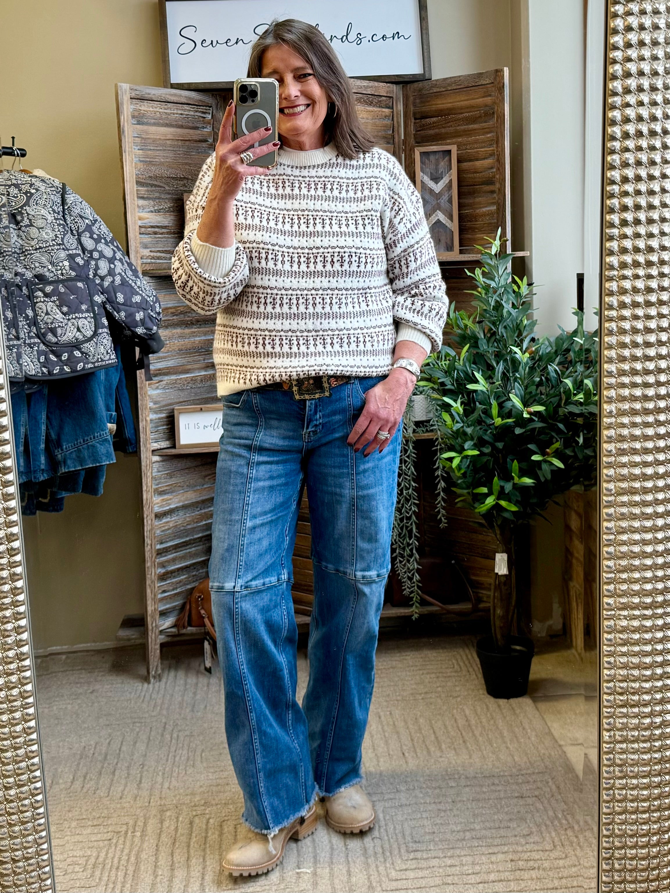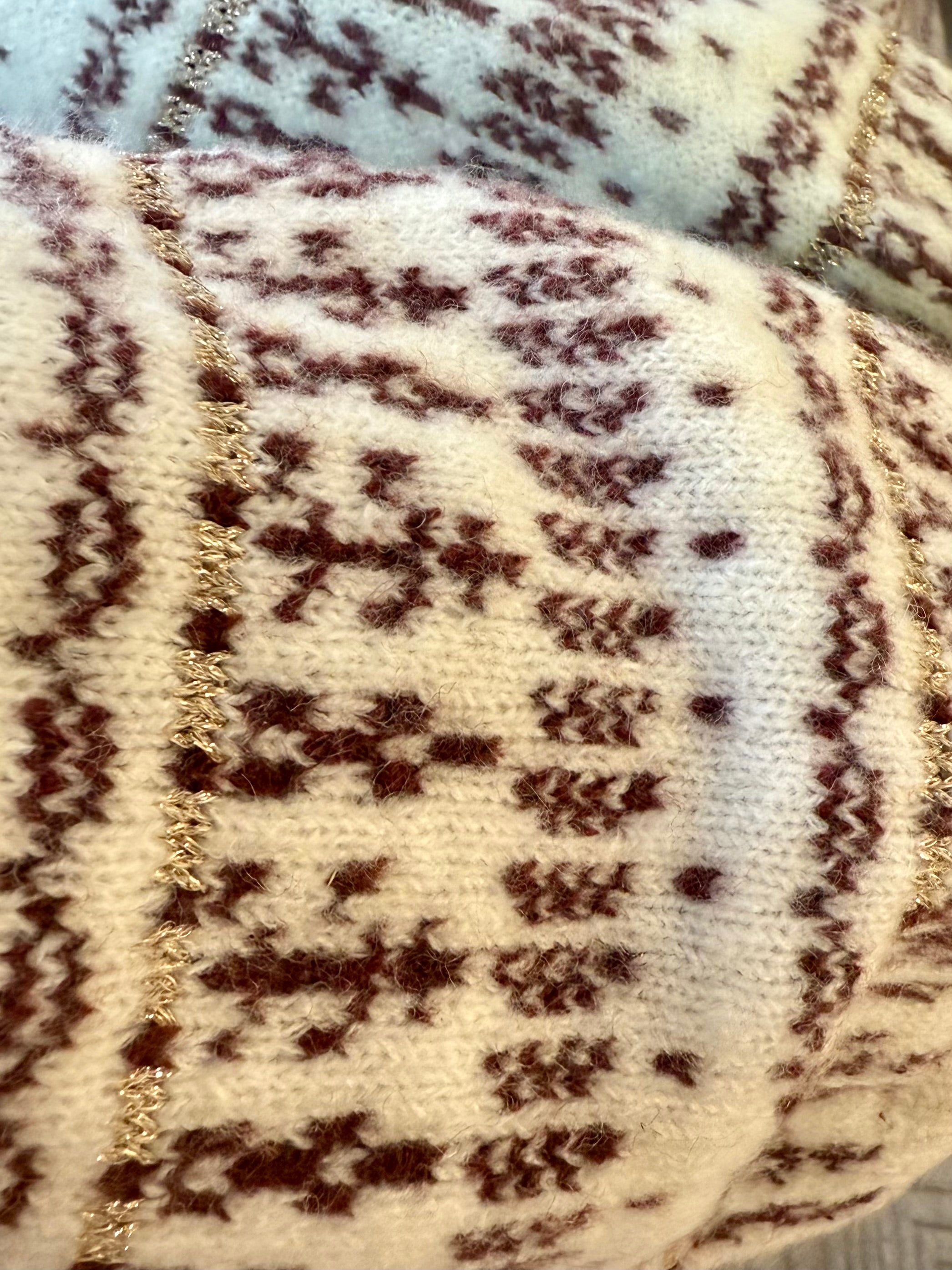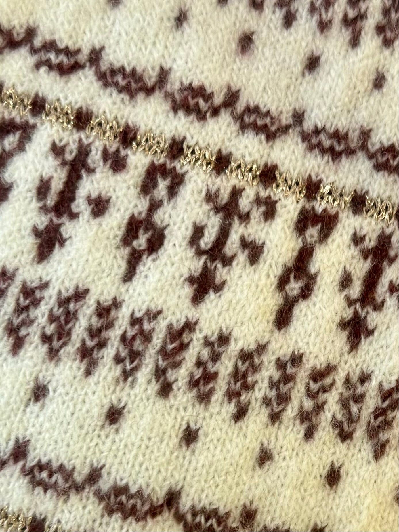 Cream based crew neck sweater with a burgundy pattern and gold metallic threads.