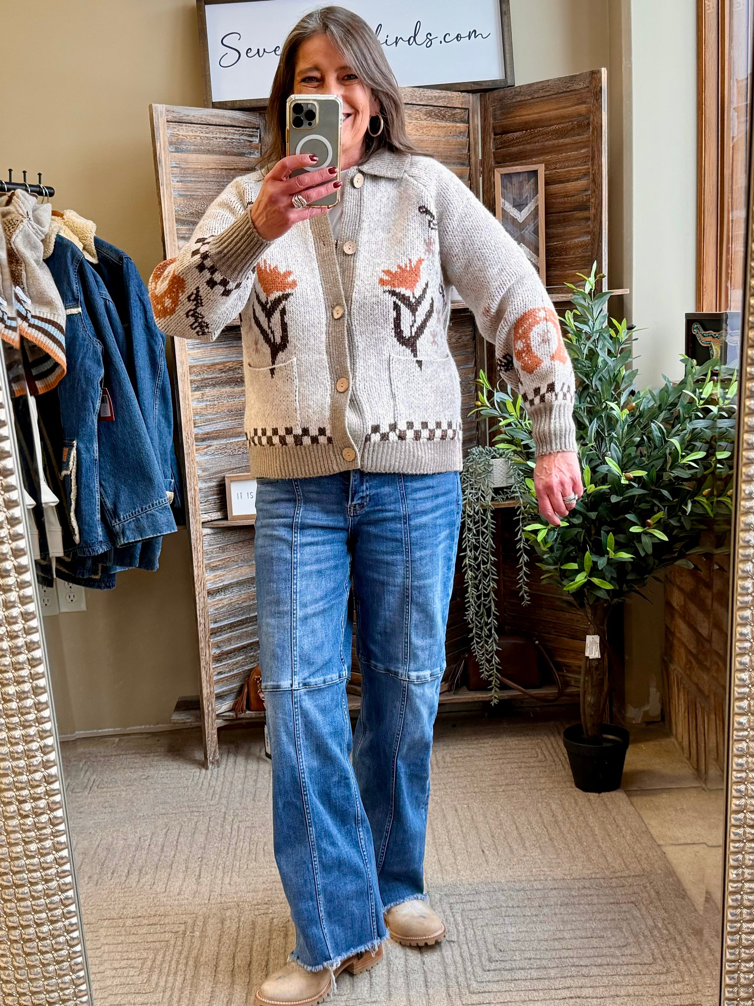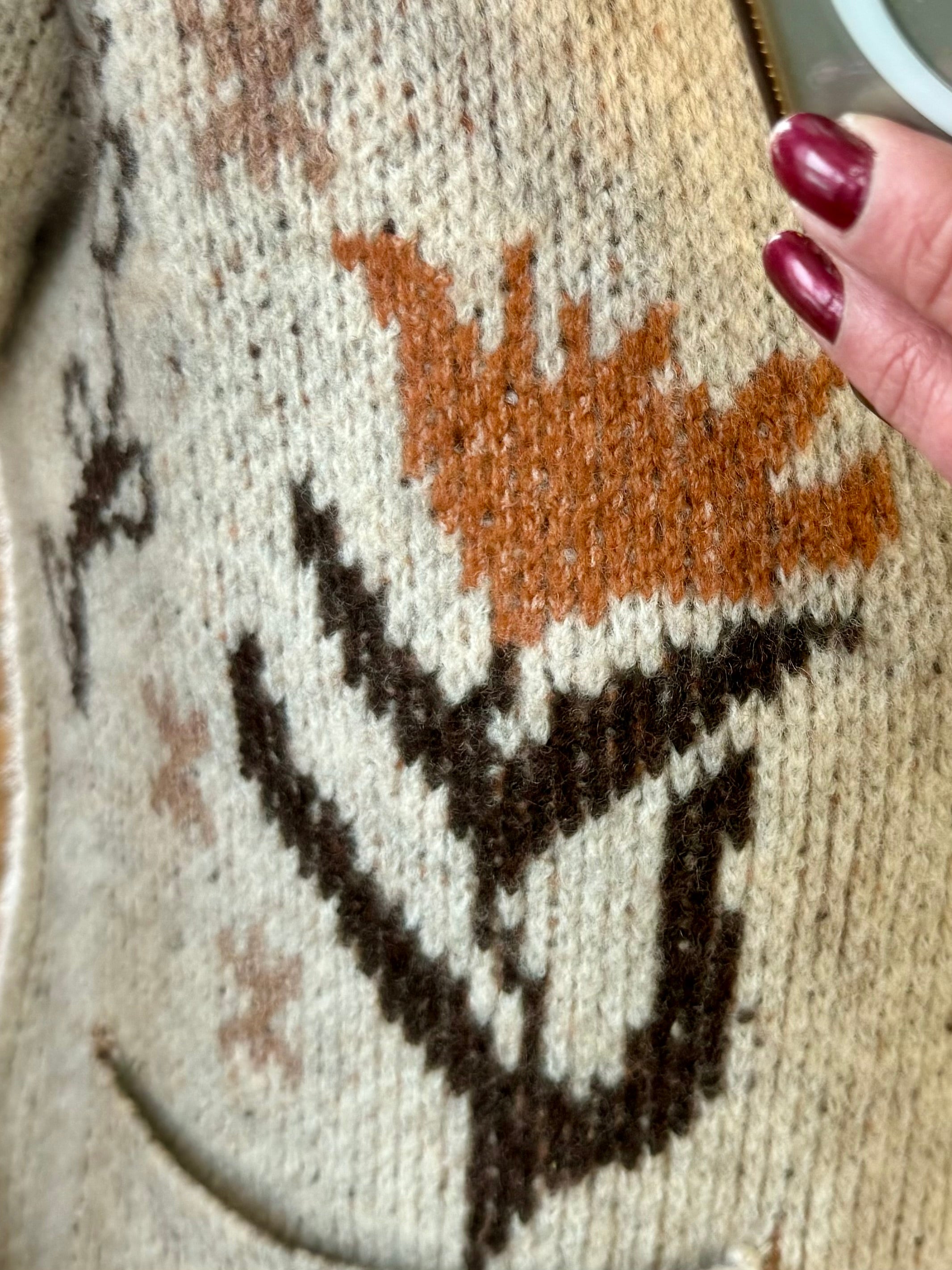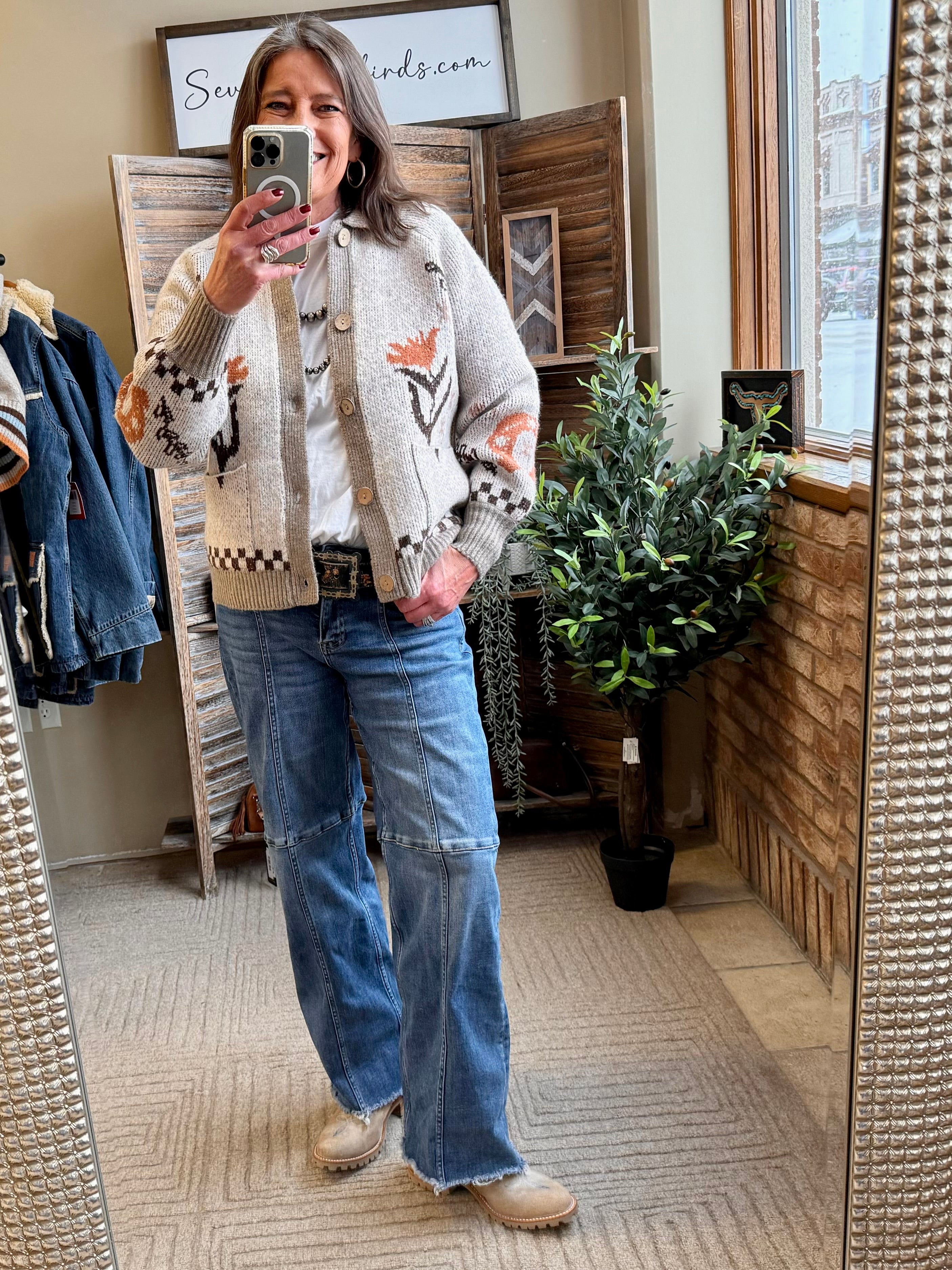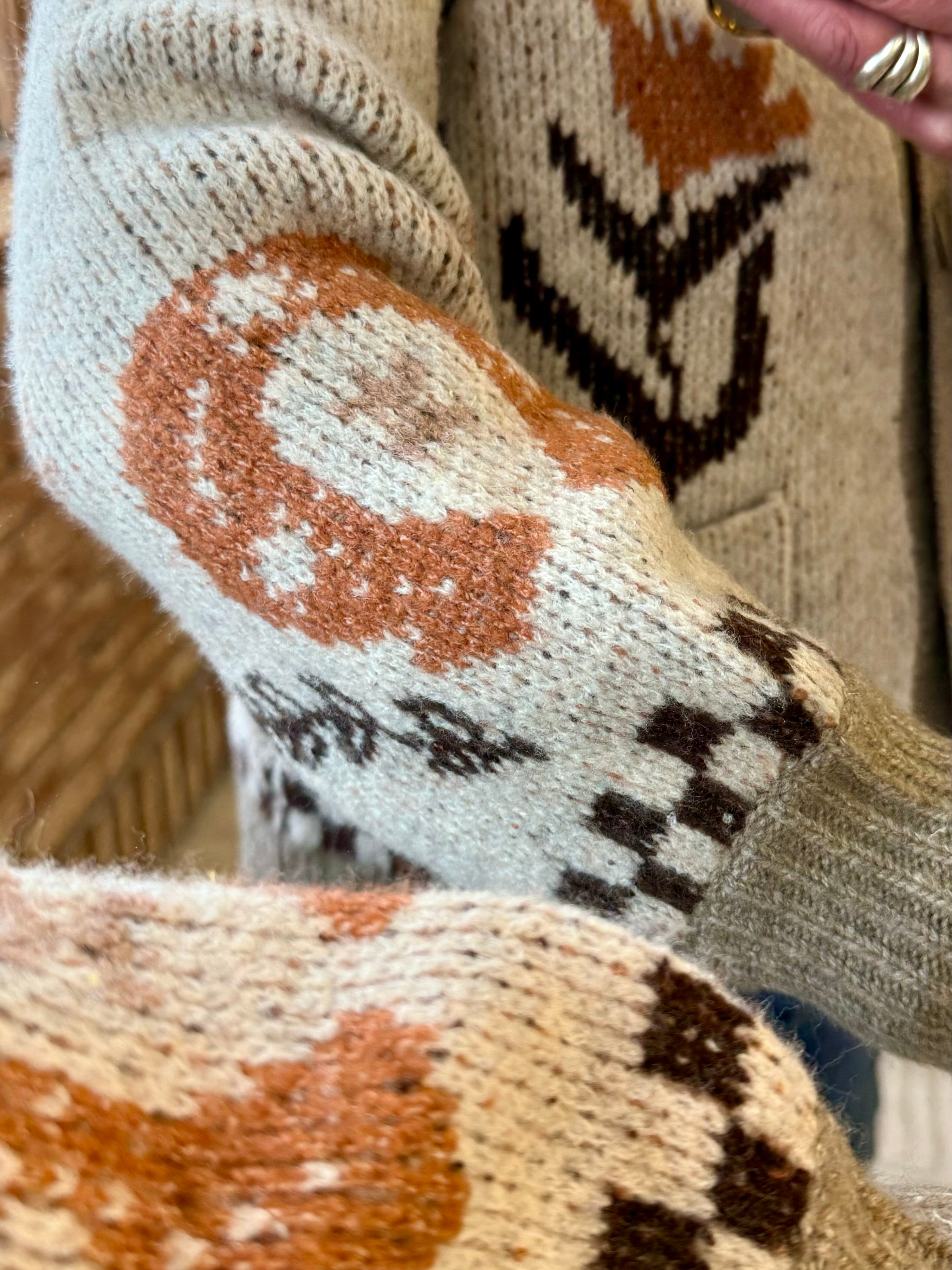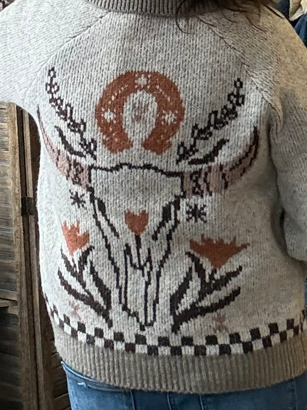 Heavier weight zip front cardigan with a rich floral, horseshoe and steerhead