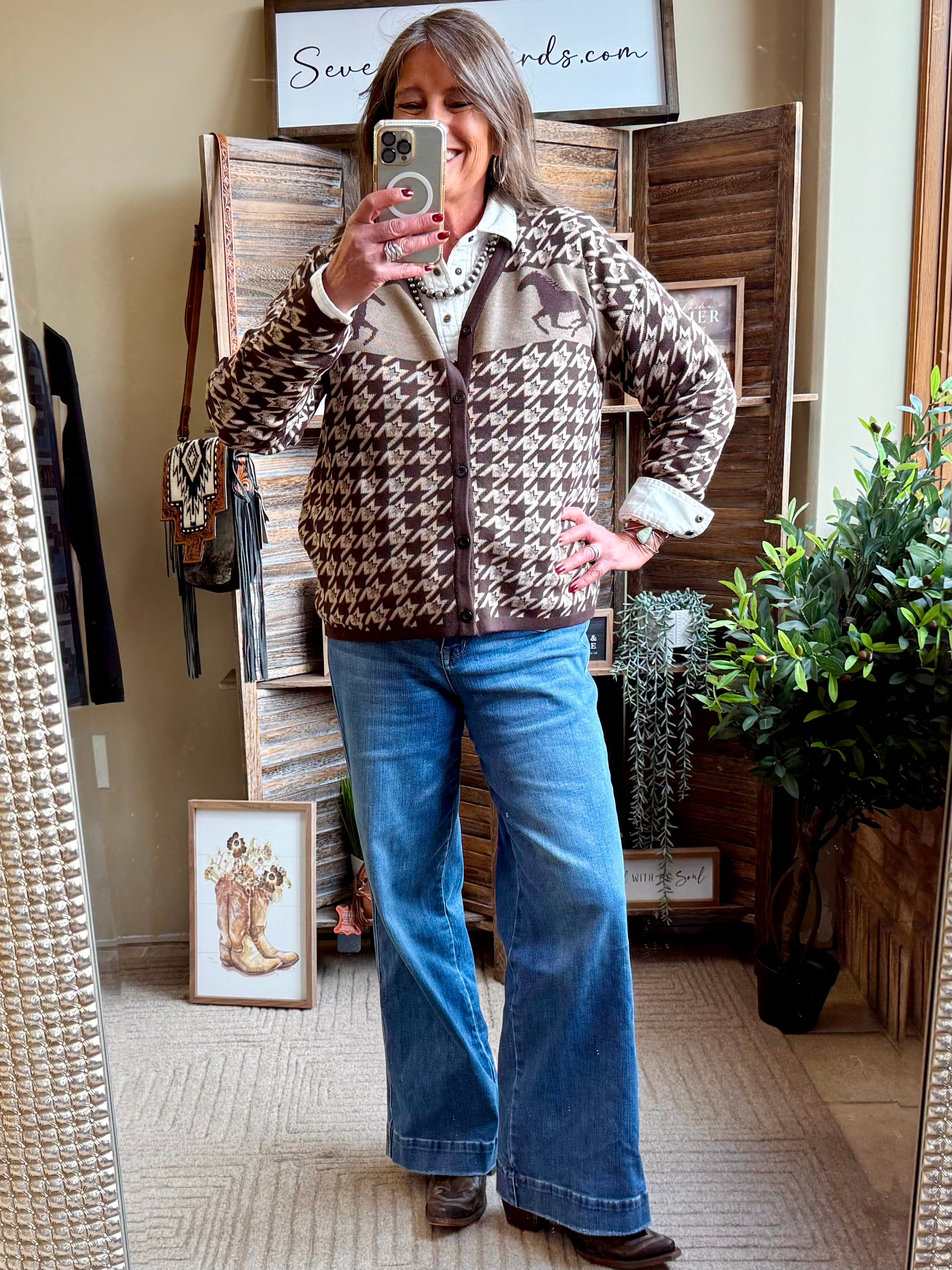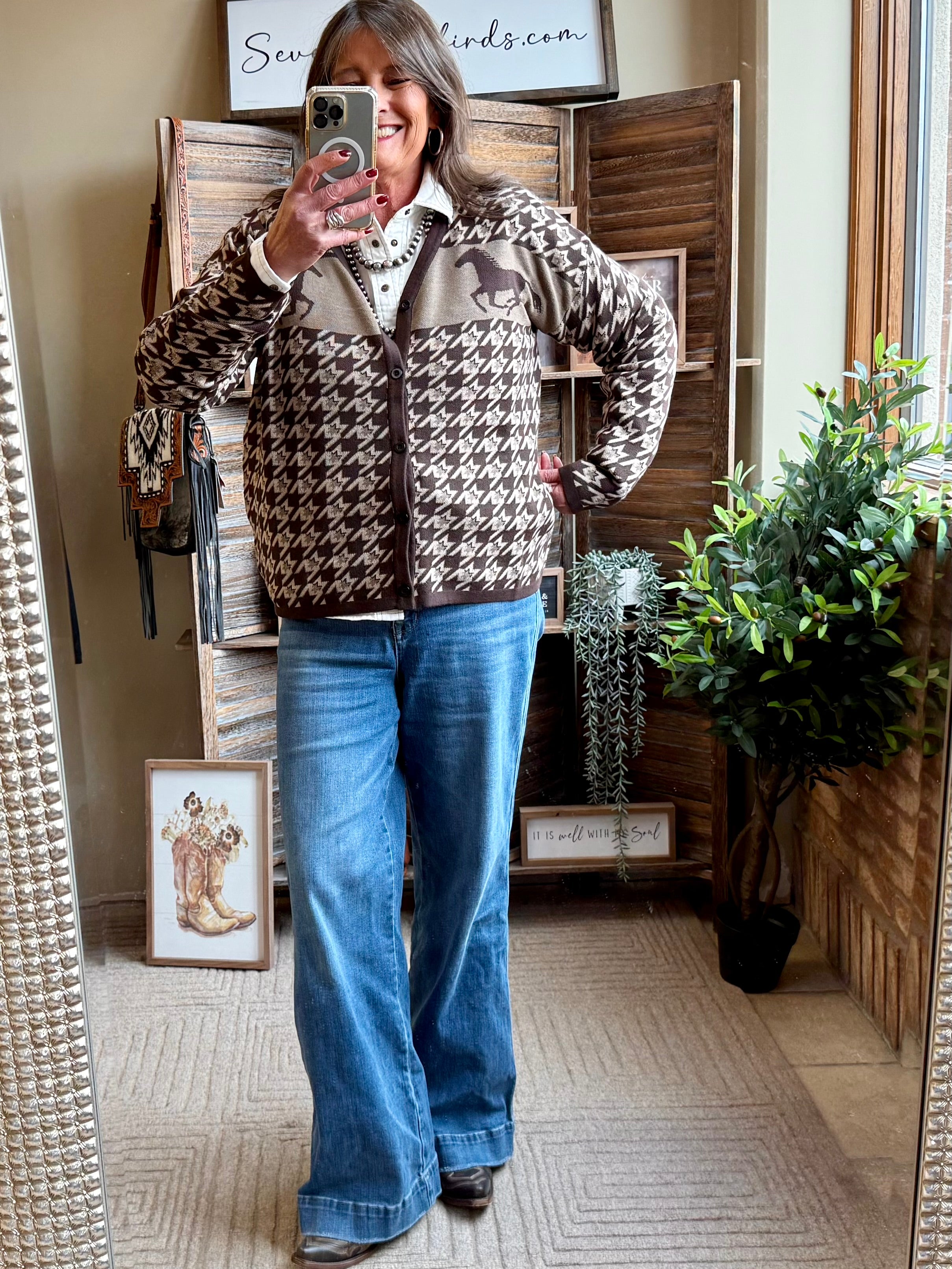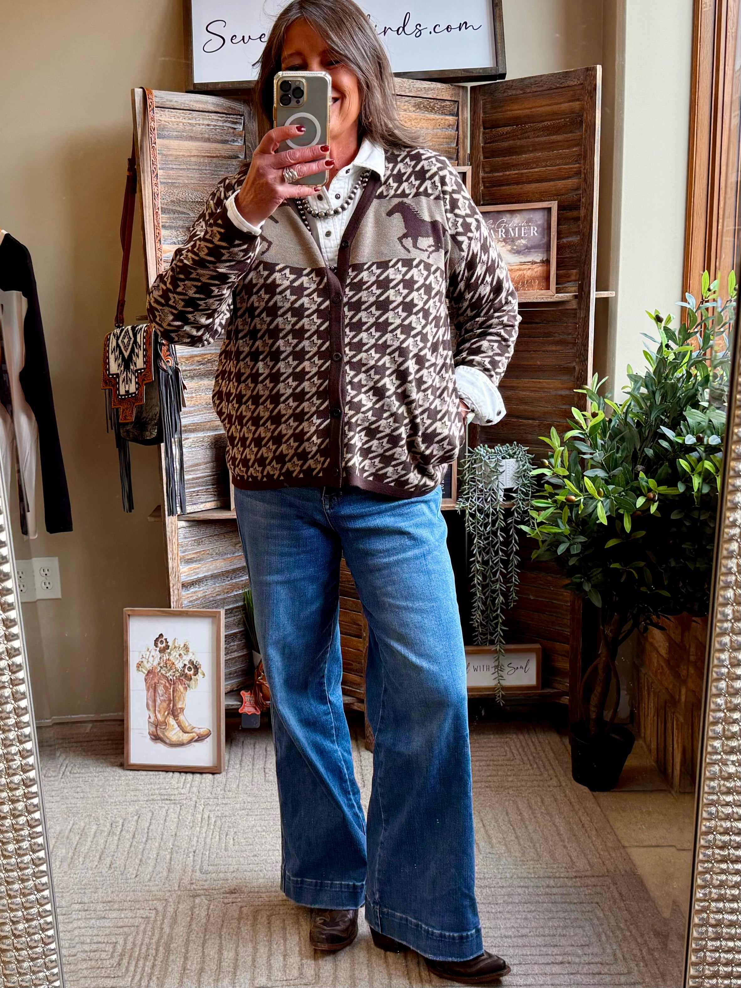 Chunky knit cardigan with a button front and pockets! Classic houndstooth pattern with a running horse graphic.
