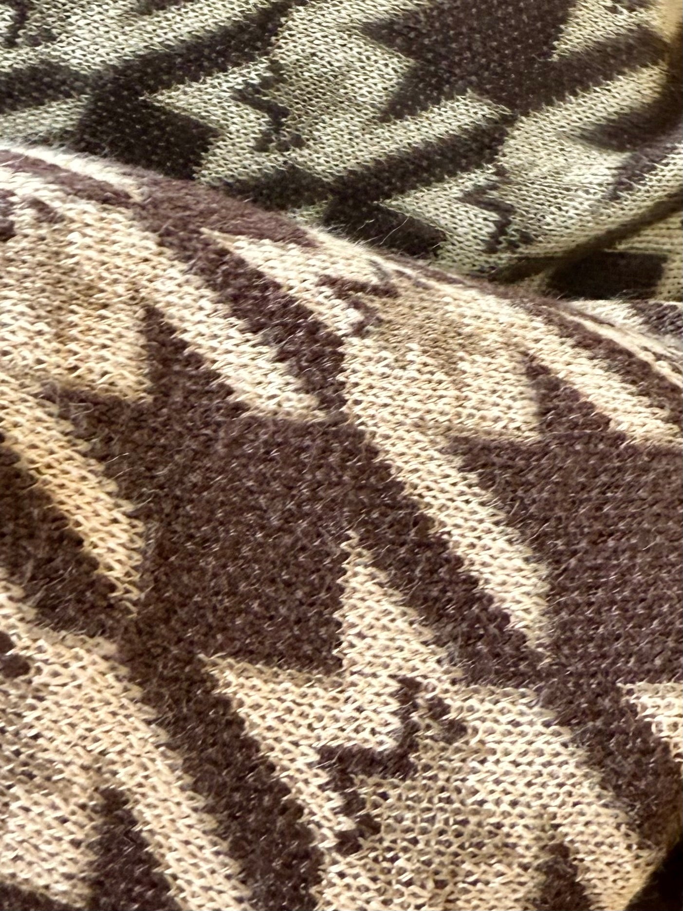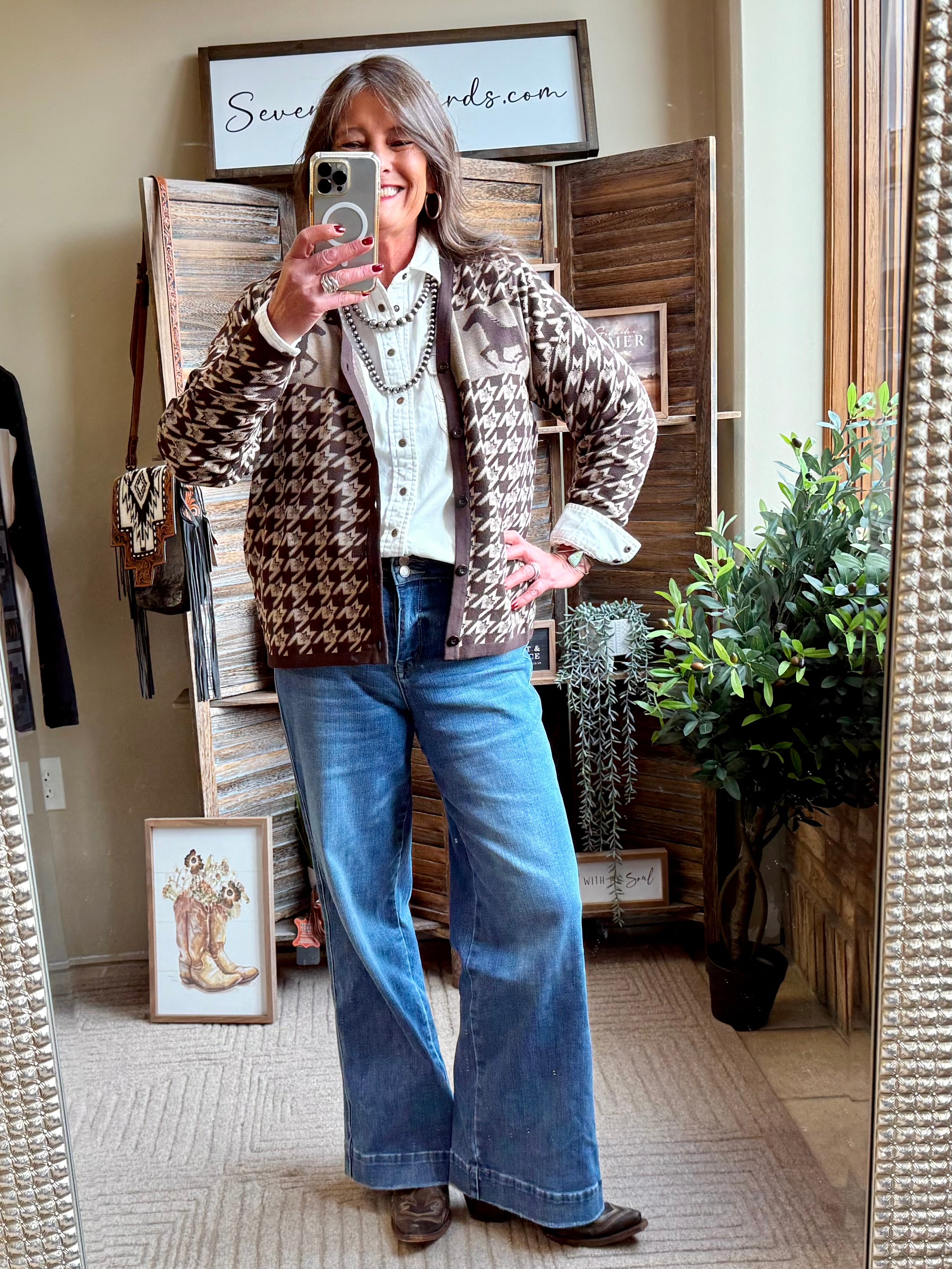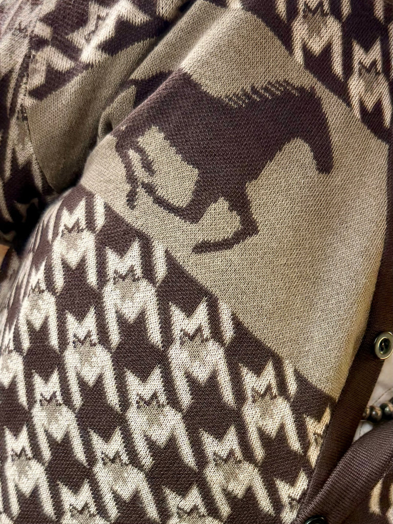 Chunky knit cardigan with a button front and pockets! Classic houndstooth pattern with a running horse graphic.
