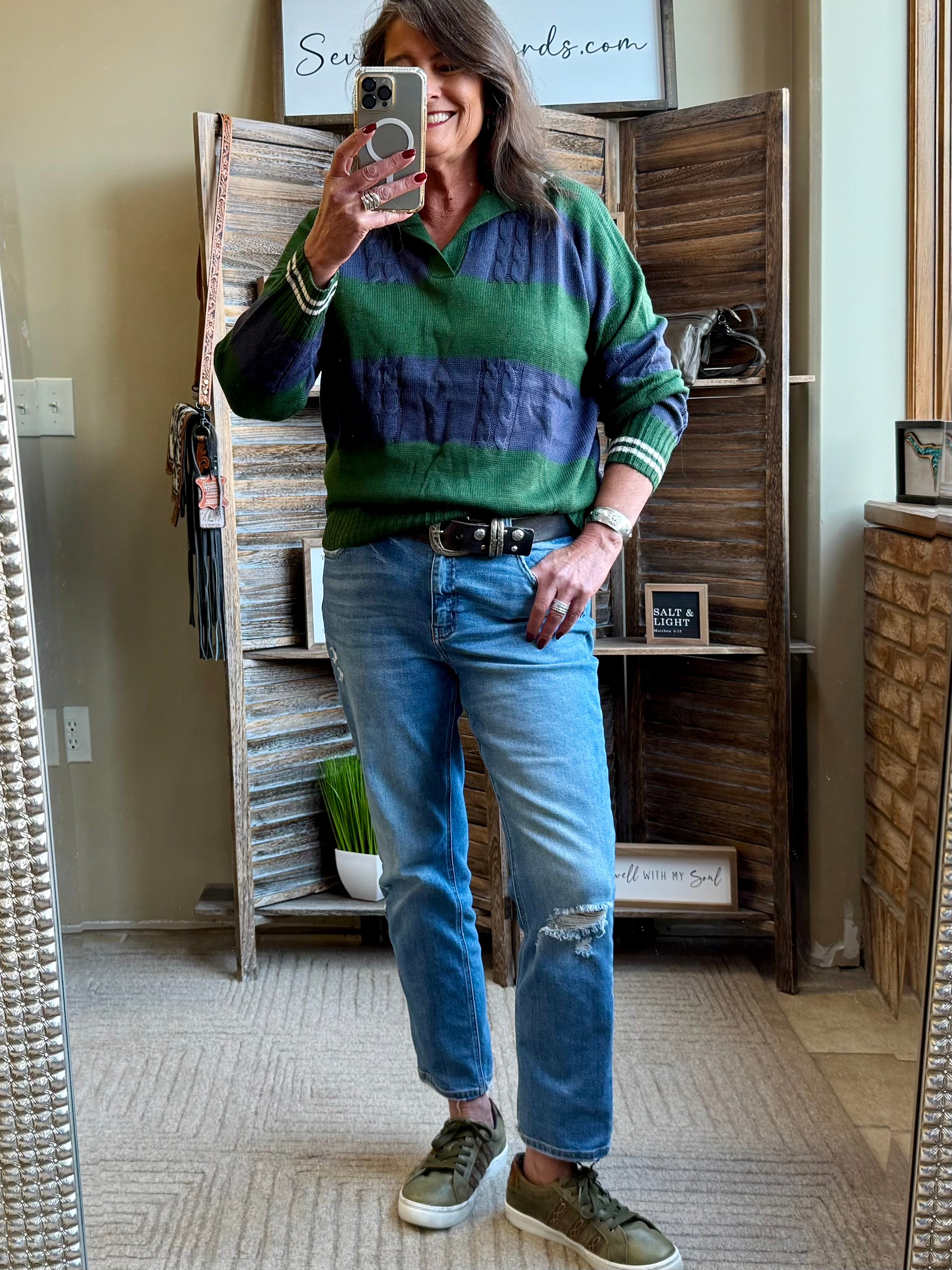 Rugby style polo collar sweater in classic navy and green.