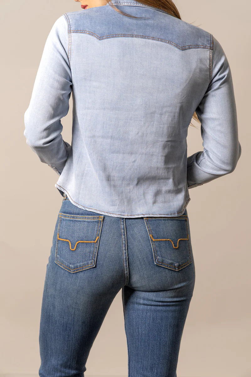 Reimagine the classic denim shirt with our Rayna. Crafted from luxuriously soft tencel, this shirt offers unmatched comfort and drape. The contrasting darker denim yoke, collar, and pocket flaps elevate the design with a modern edge, in addition to the unique turquoise buttons. A perfect blend of classic and contemporary, this shirt is a versatile piece that transitions from casual to chic. This shirt is the perfect tailored length, perfect for leaving untucked.