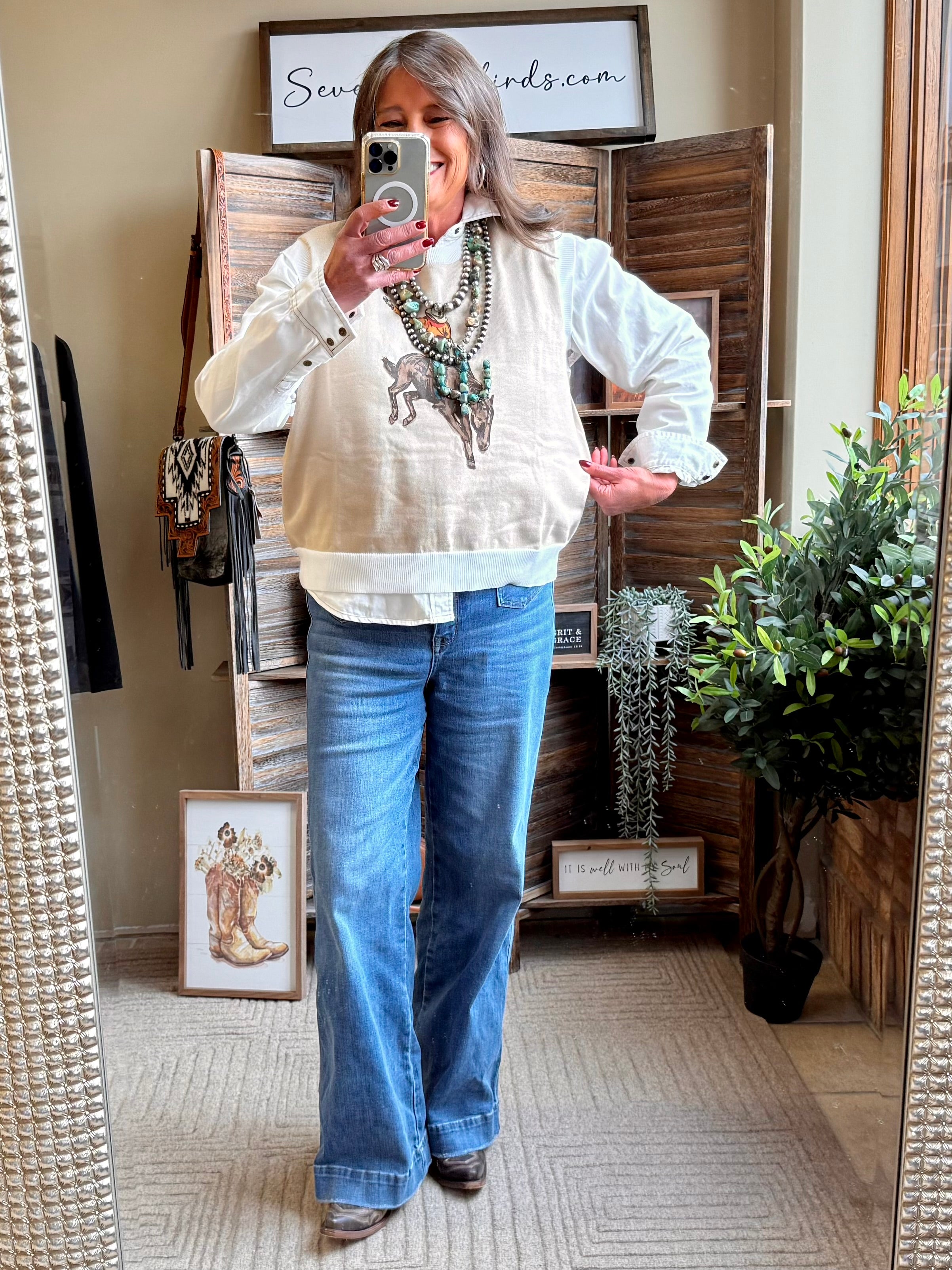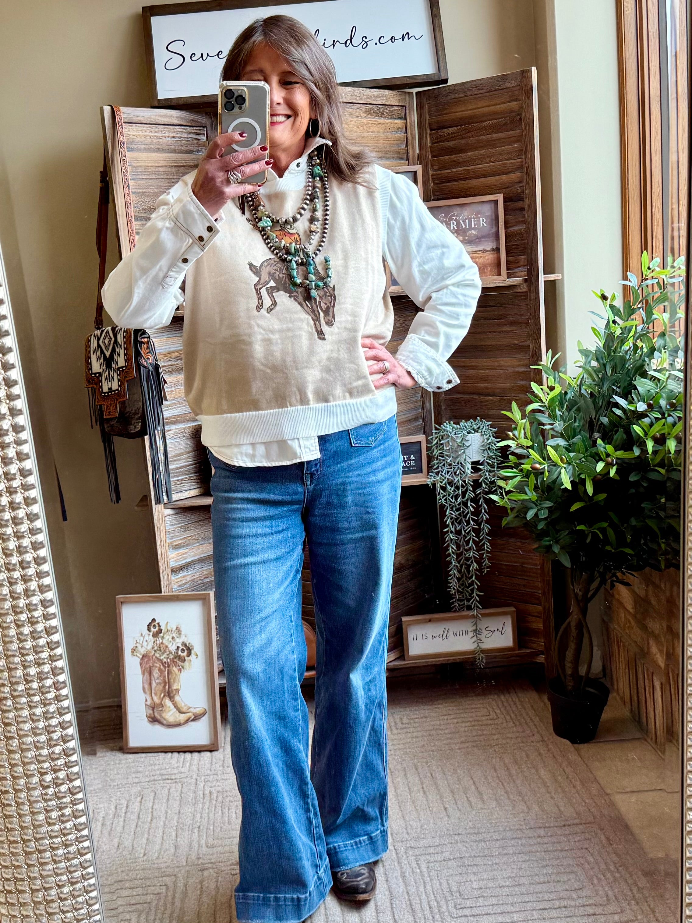 Great lightweight sweater vest with a saddle bronc rider across the front.