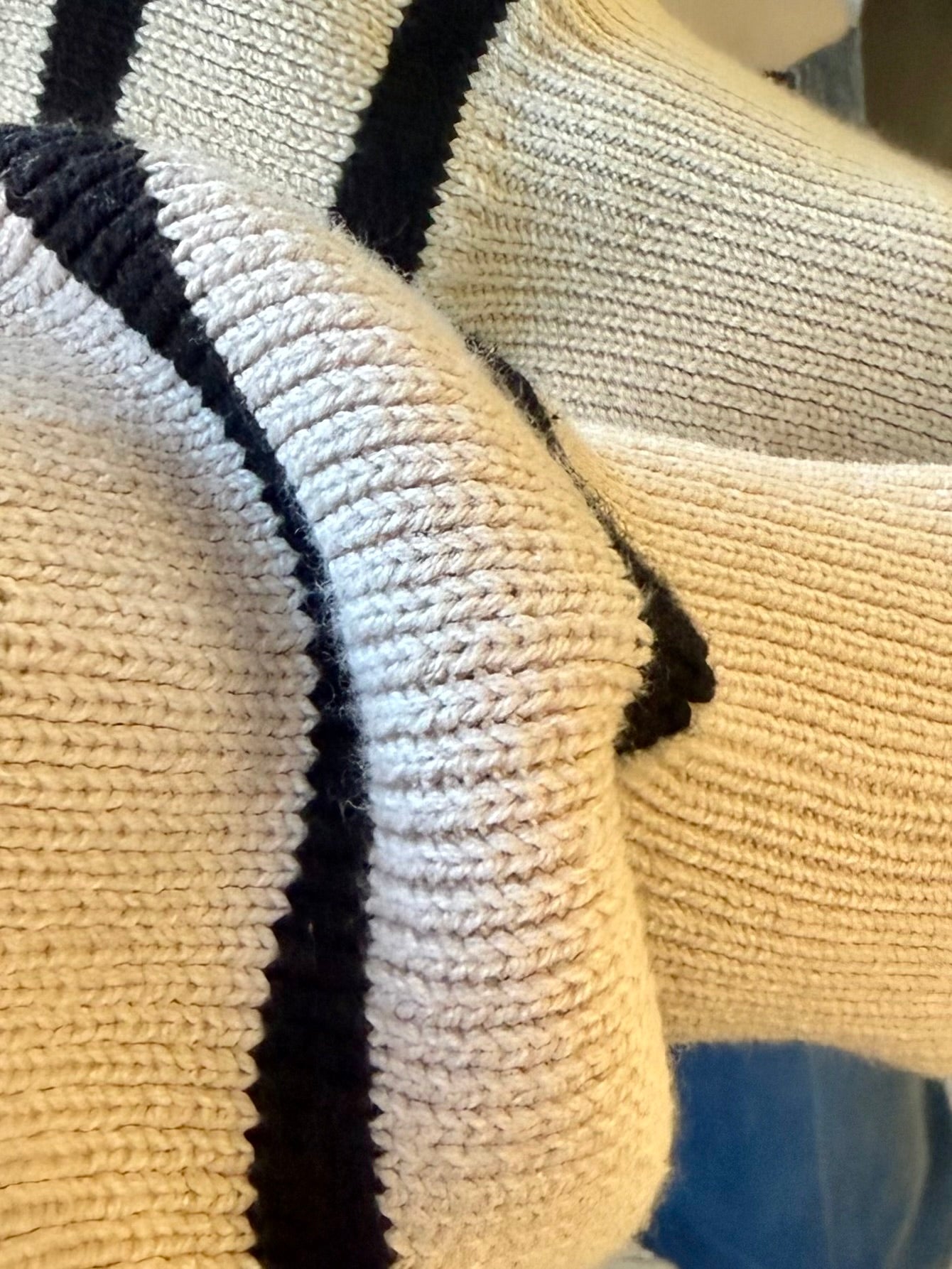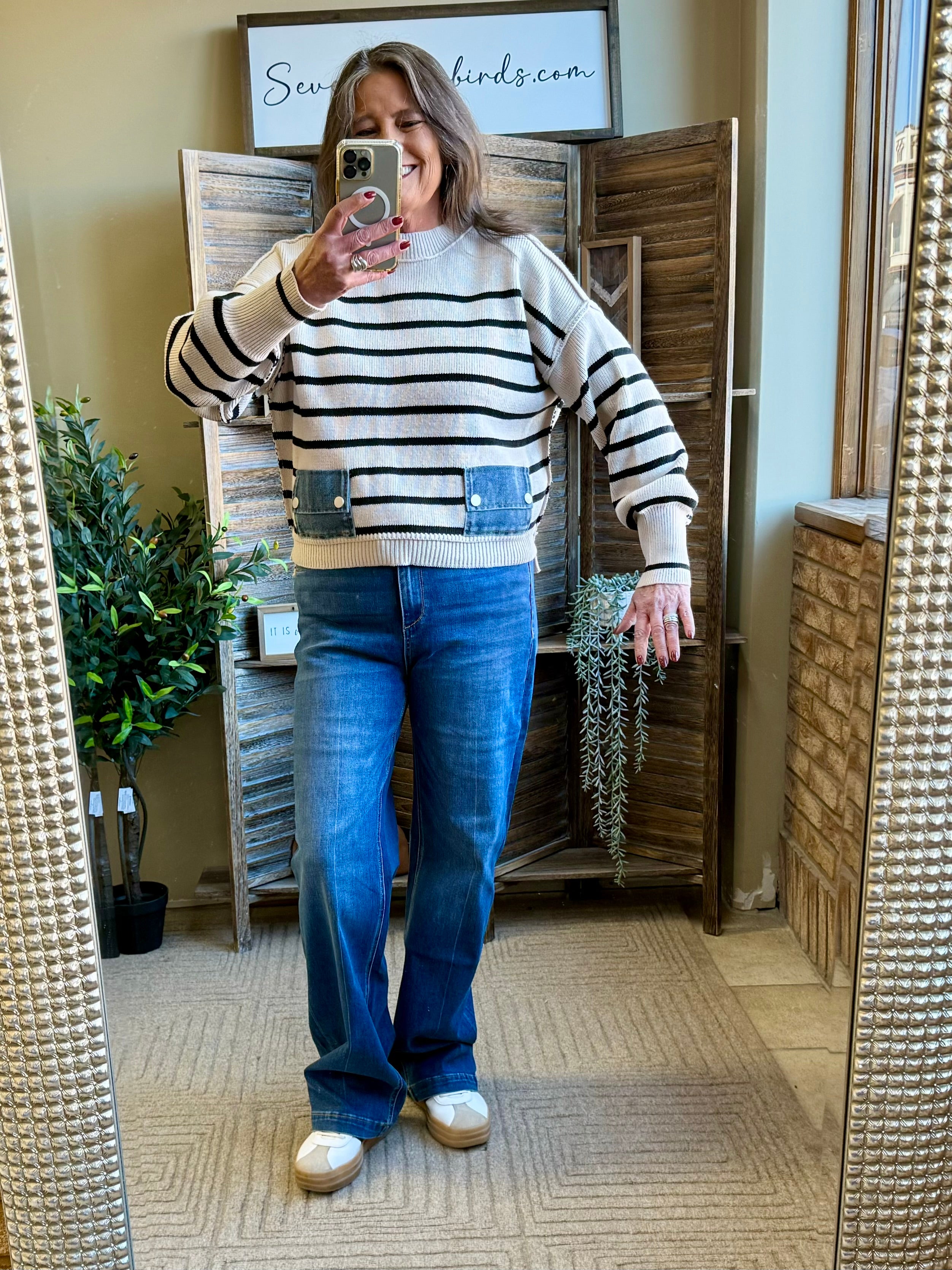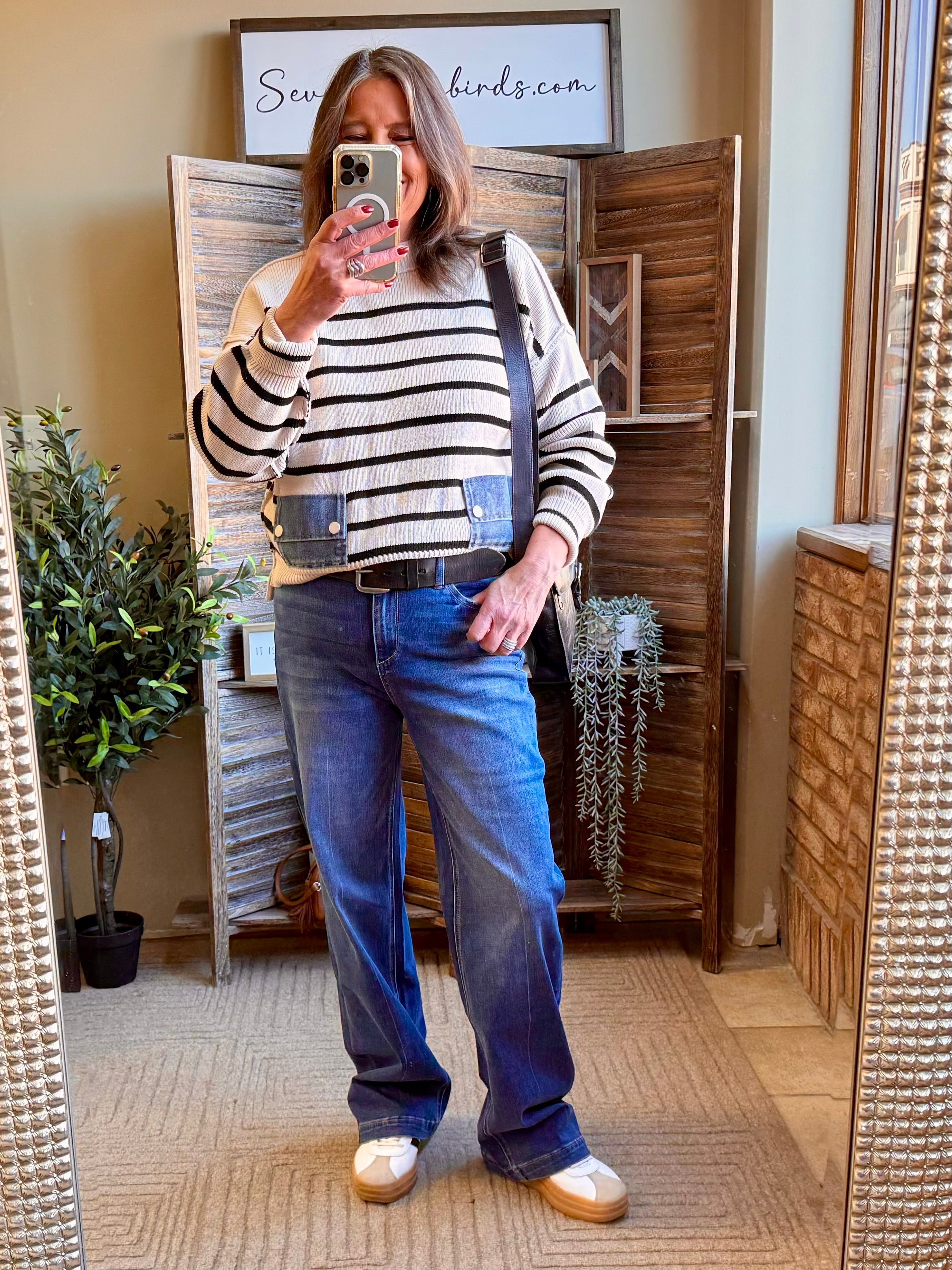 * Relaxed Fit * Mock Neck * Balloon Sleeves * Drop Shoulder * Denim Patch Pockets * Striped