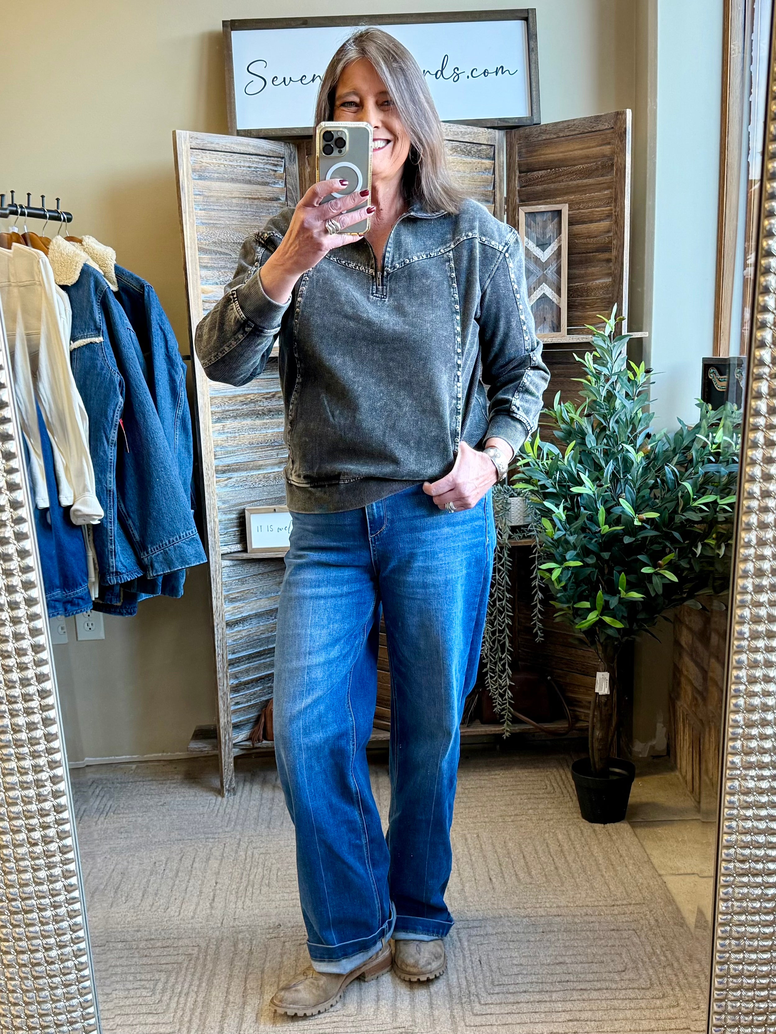 1/4 zip with collar. Stud details. The body is primarily a mineral washed denim with stretchy panels at the sides for easy movement.