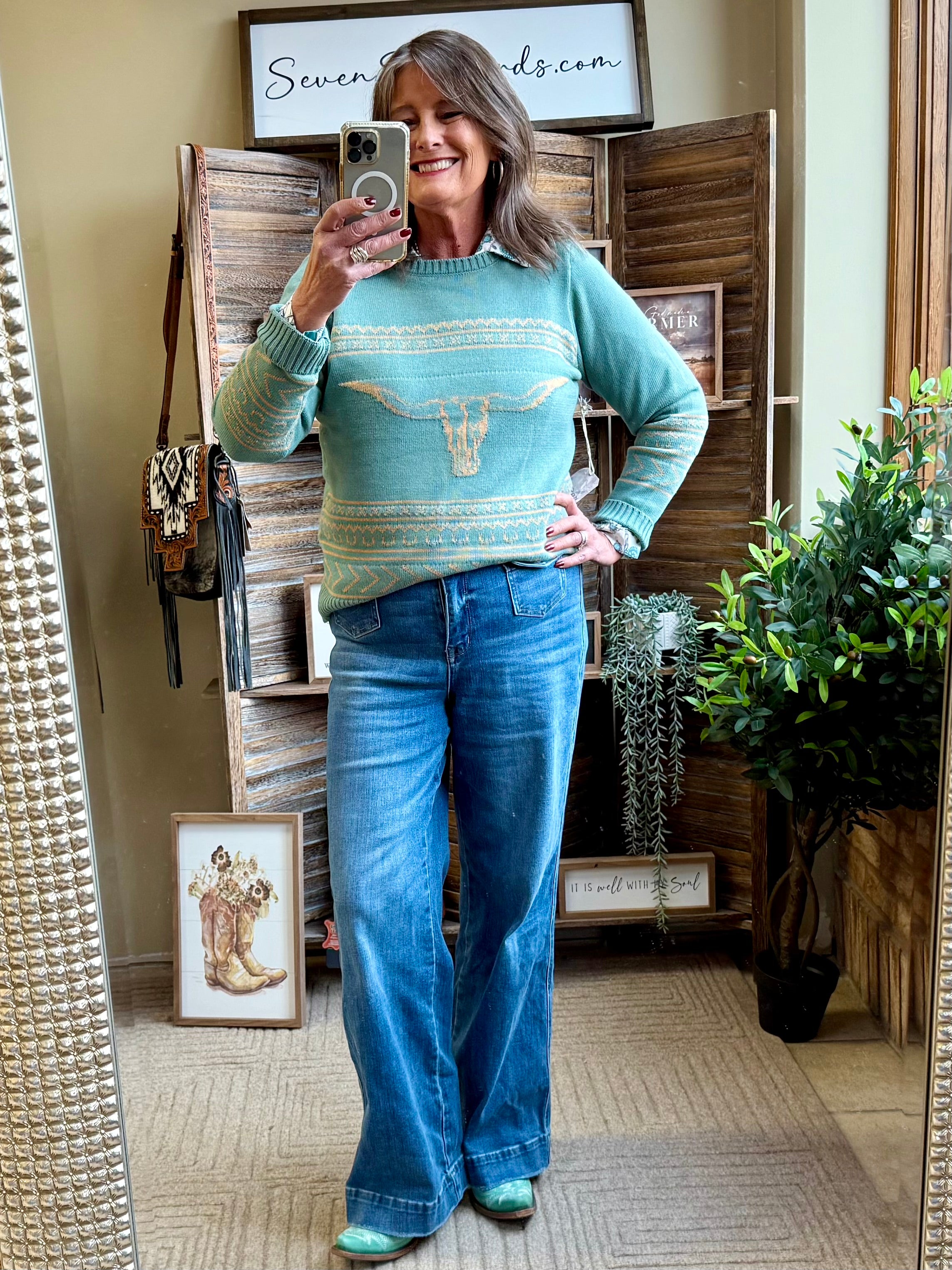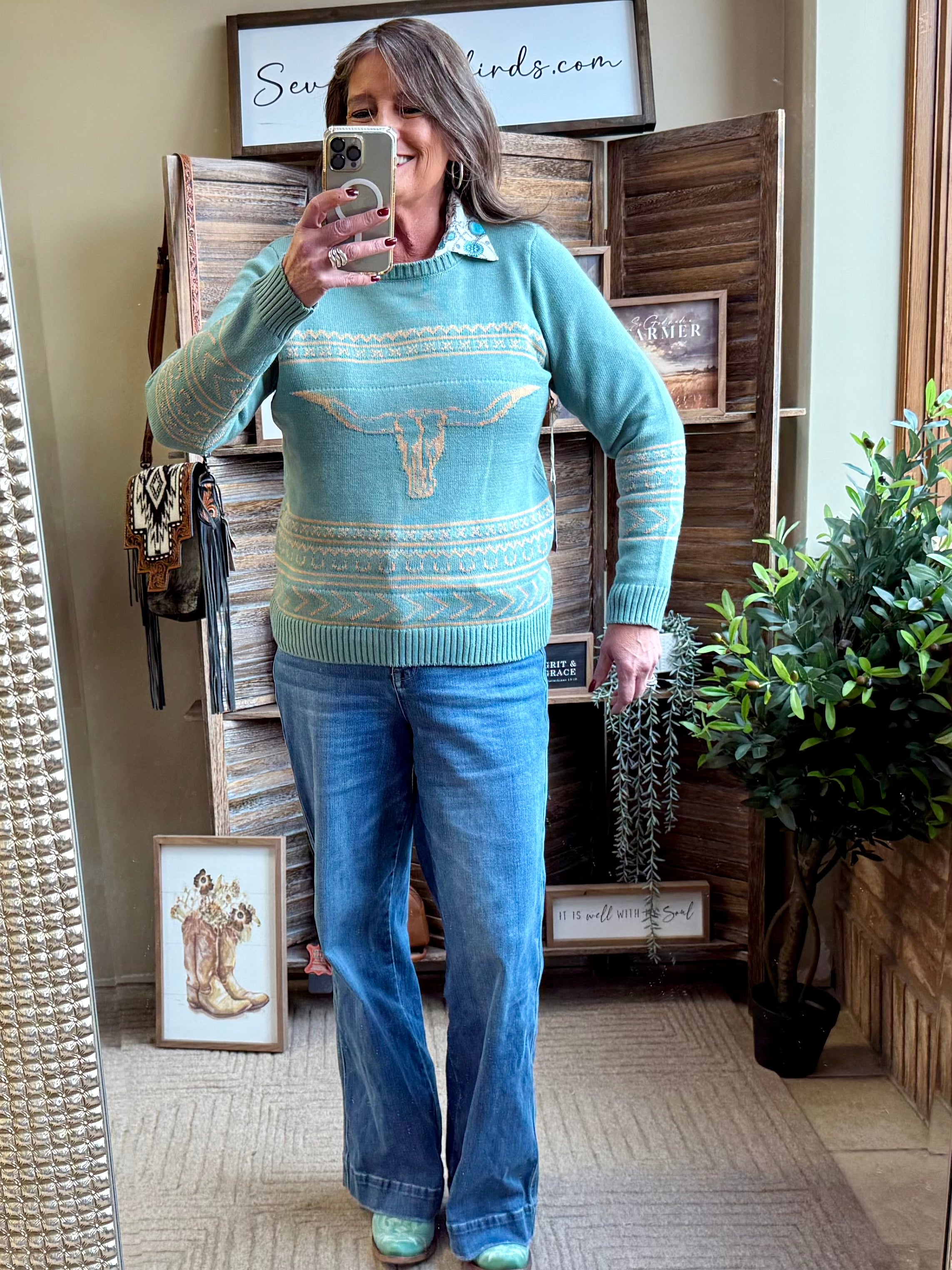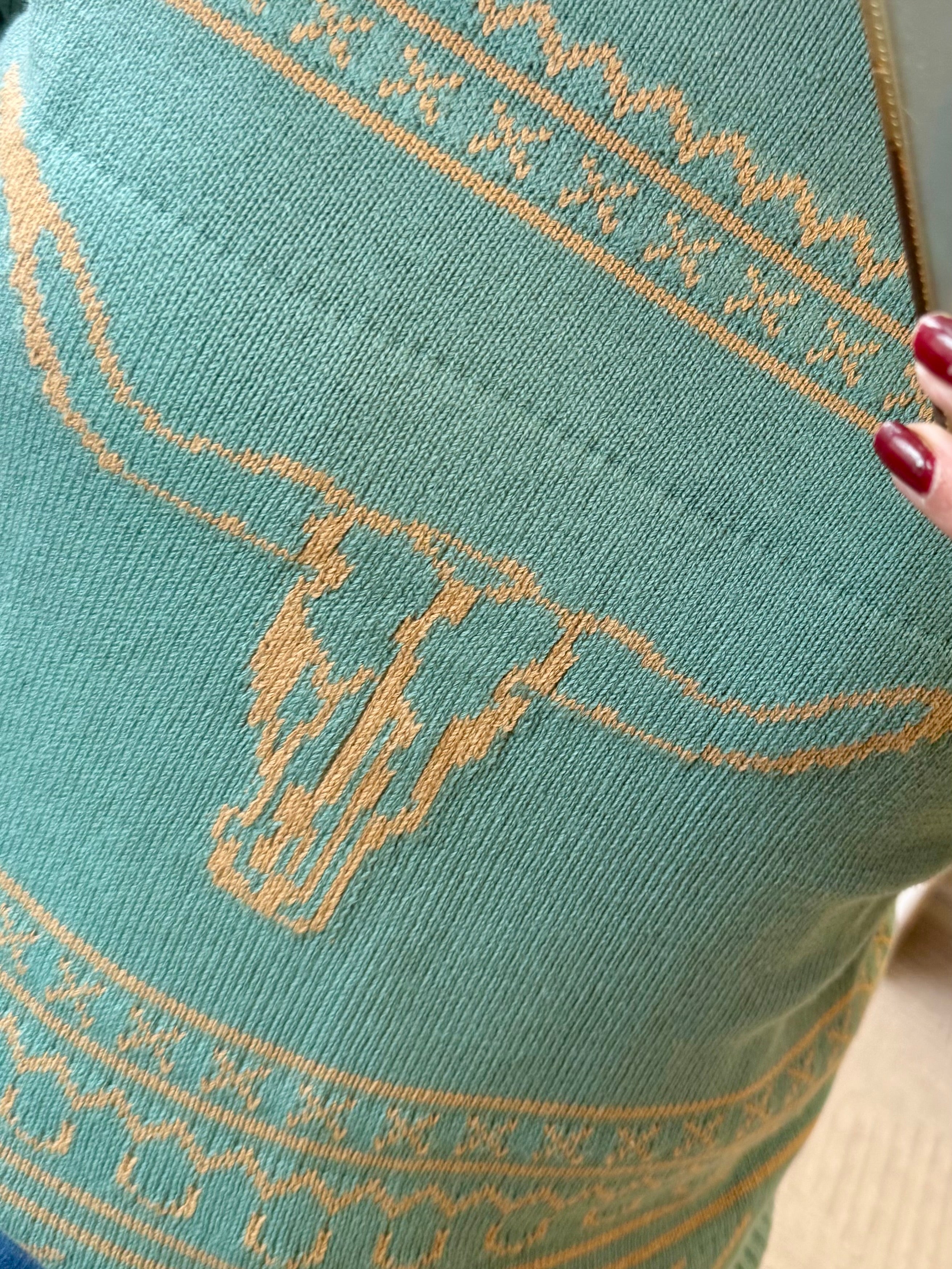 Lightweight crew neck sweater with an awesome longhorn detailing across the body.