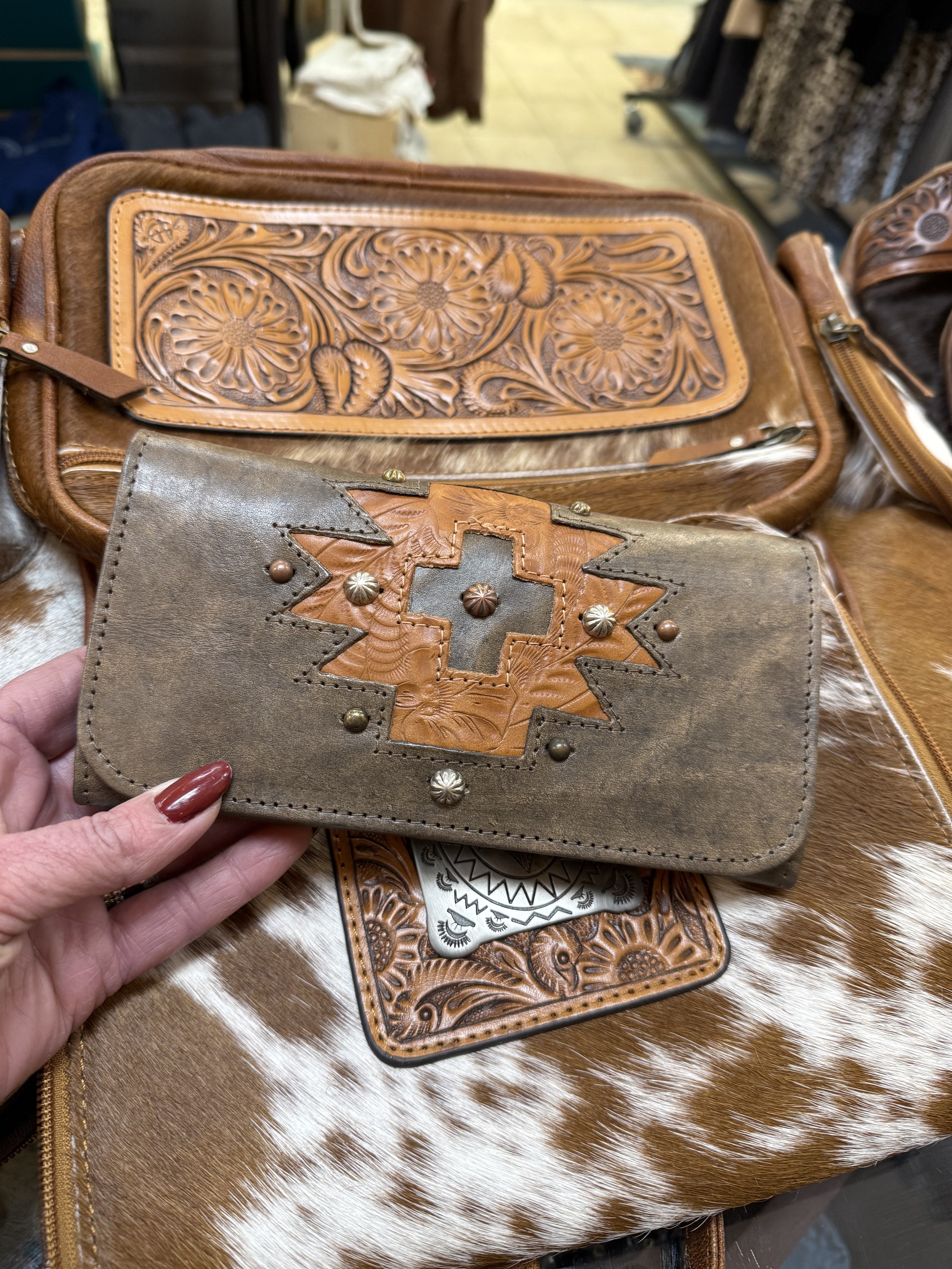 The popular tri-fold wallets feature hand tooled designs, eye-catching conchos, and an exterior zipper coin pocket. The full leather interior includes 12 credit card spaces, 1 clear ID space, multiple currency pockets, and a checkbook flap.
